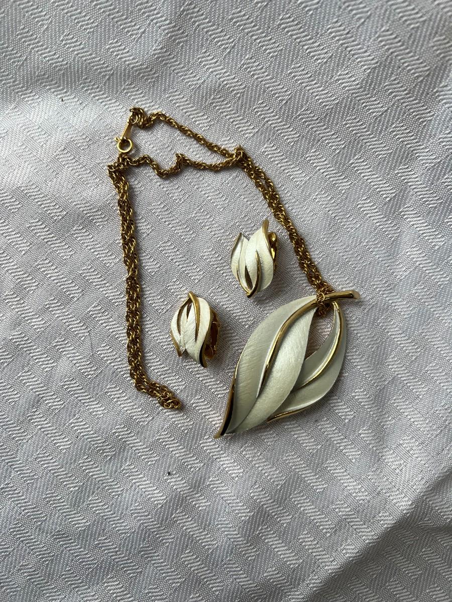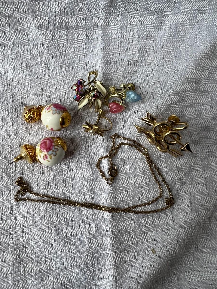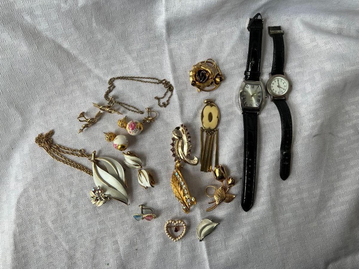 GOLD/FLORAL CLIP ON EARRINGS, GOLD TONED BROOCH PIN, GOLD TONED CHAIN, AND WHITE/GOLD LEAF NECKLACE WITH MATCHING CLIP ON EARRINGS. TWO BLACK WRSITWATCHES.