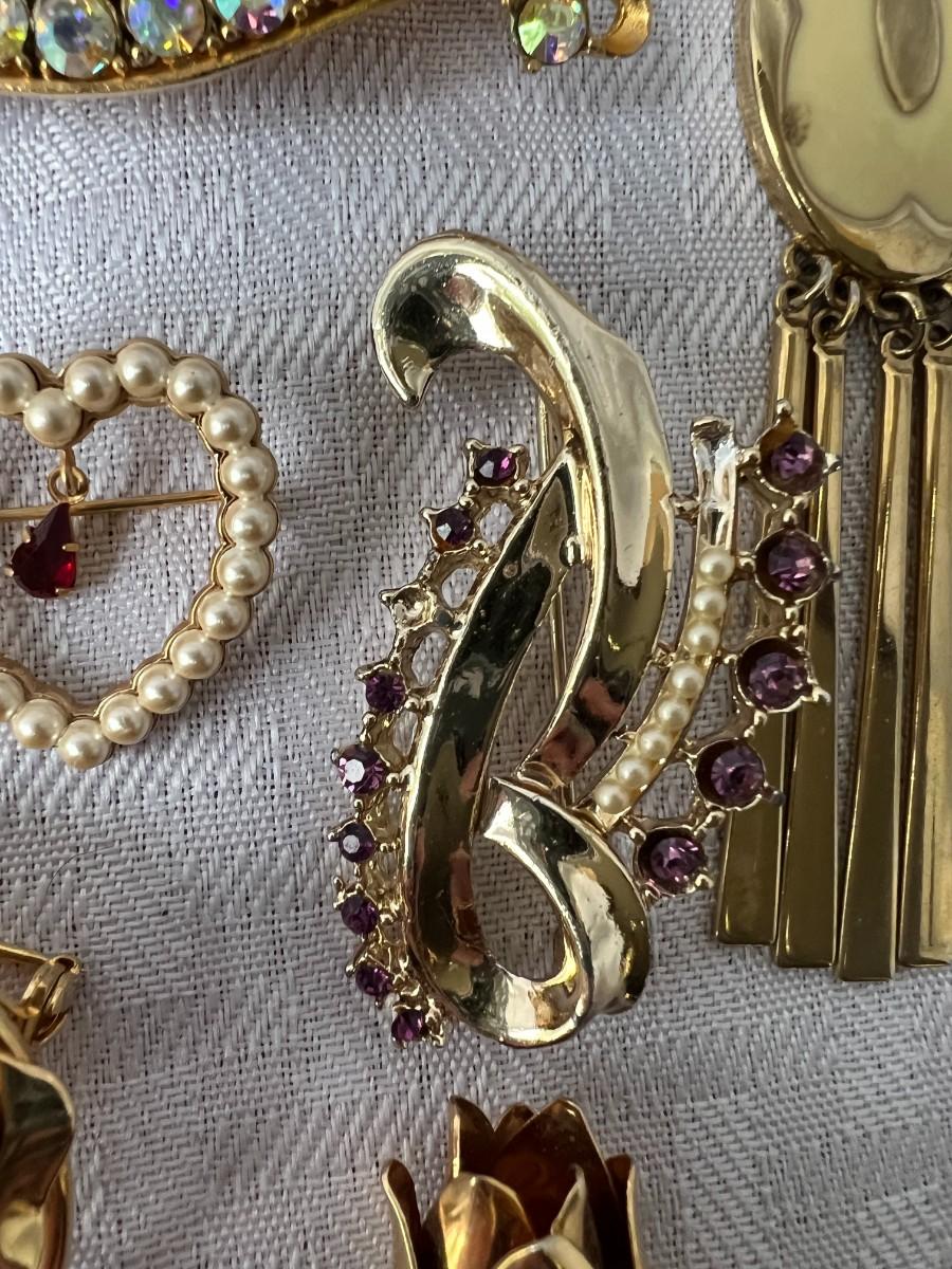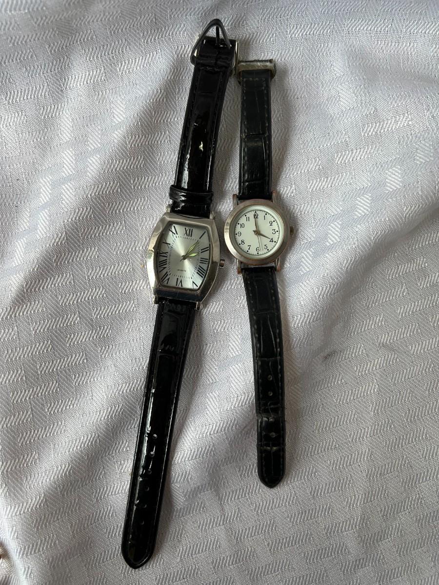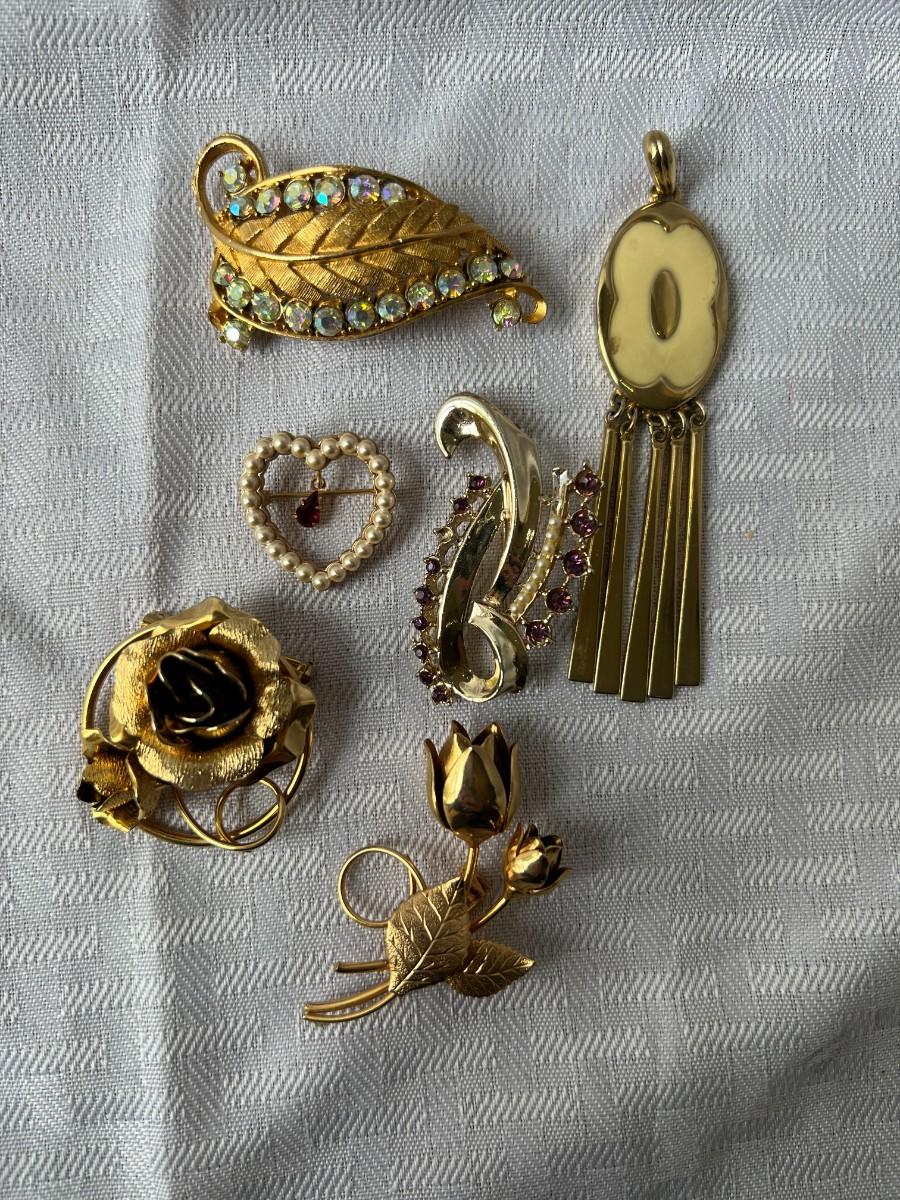 GOLD/FLORAL CLIP ON EARRINGS, GOLD TONED BROOCH PIN, GOLD TONED CHAIN, AND WHITE/GOLD LEAF NECKLACE WITH MATCHING CLIP ON EARRINGS. TWO BLACK WRSITWATCHES.