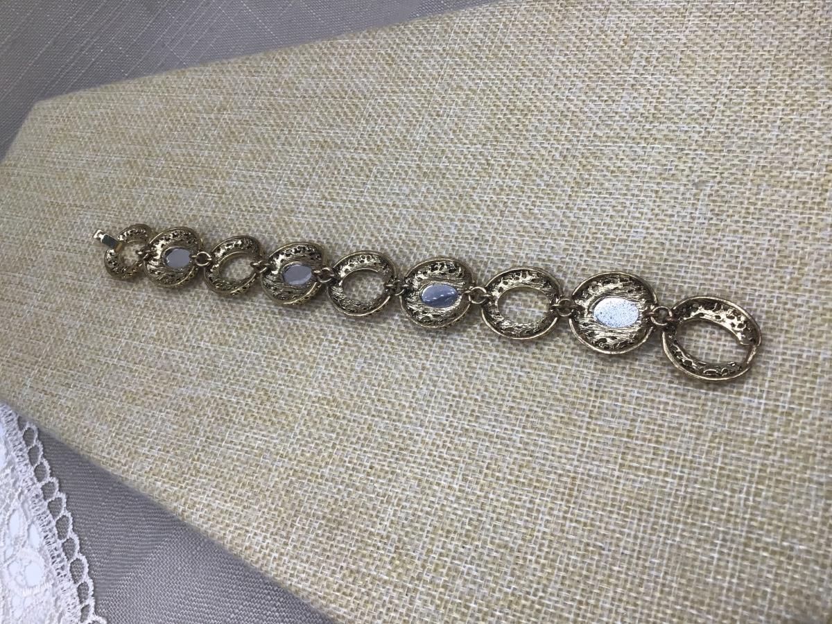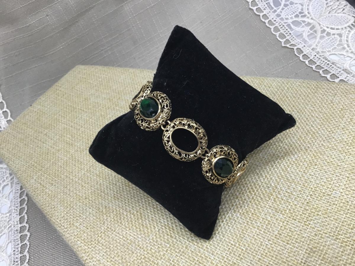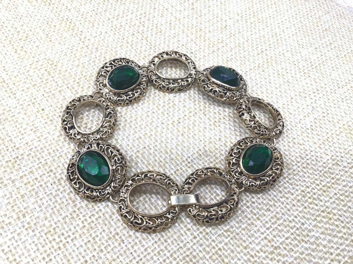 Gold Toned Filigree And Green Faceted Plastic Stone Link Bracelet