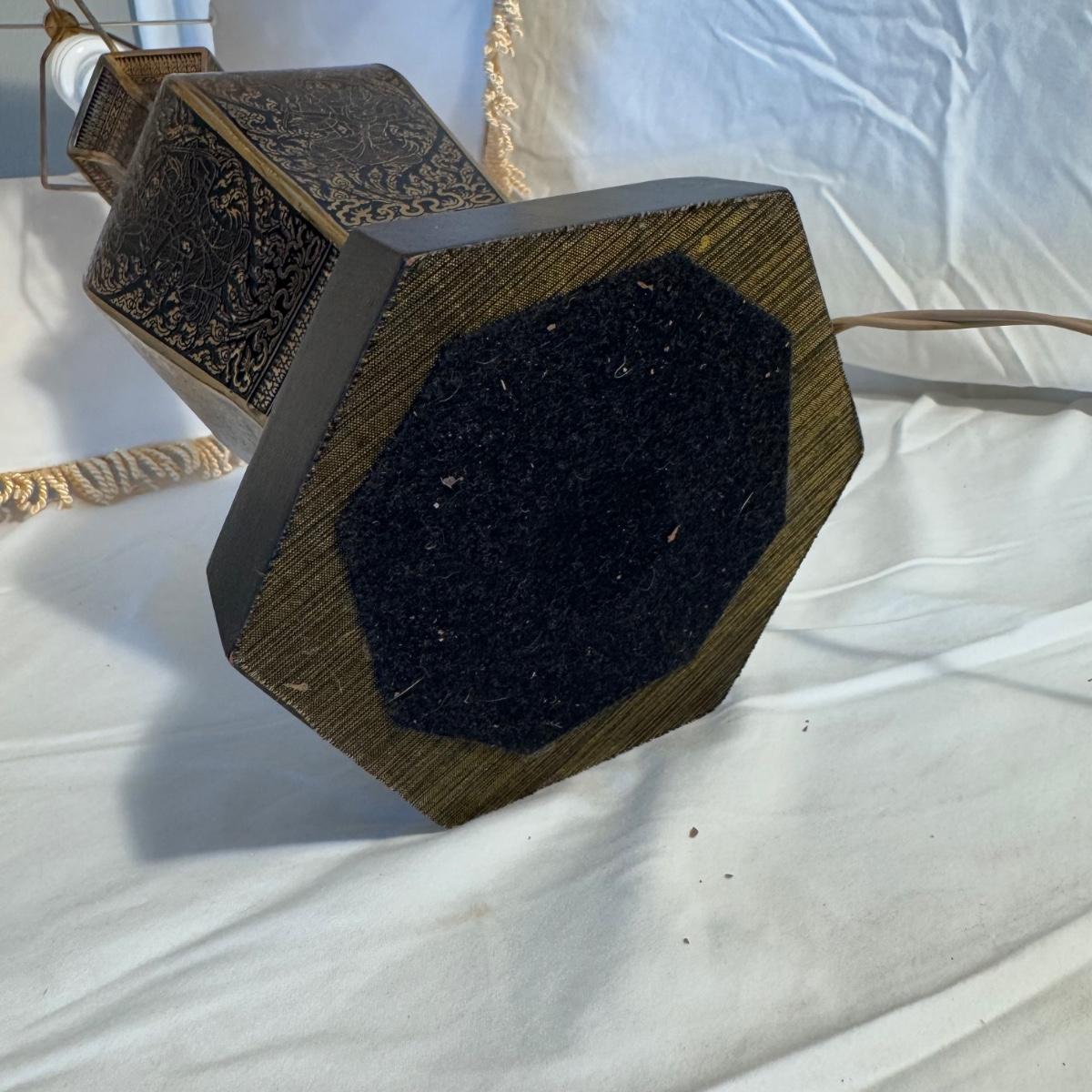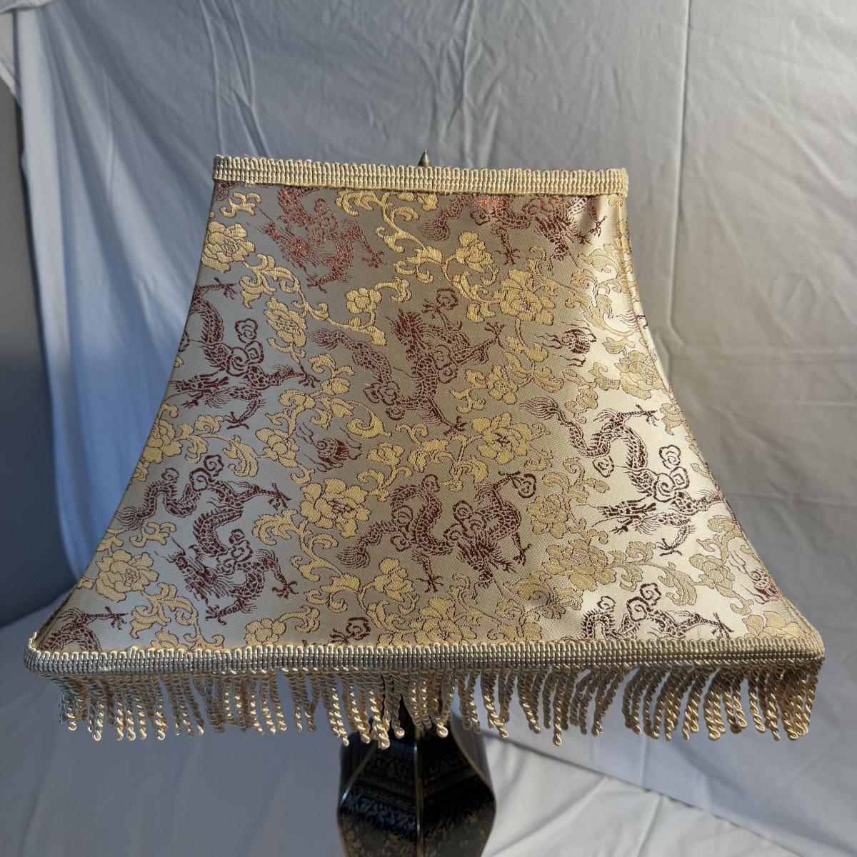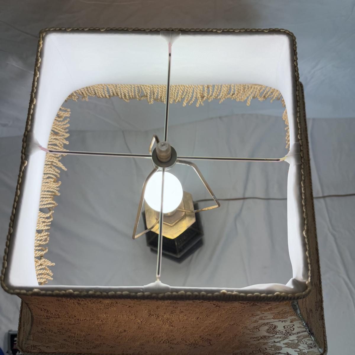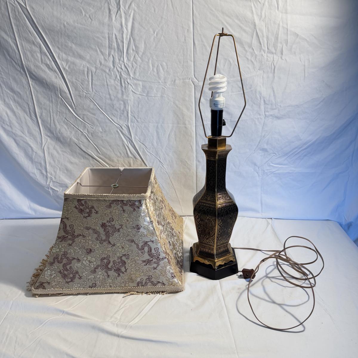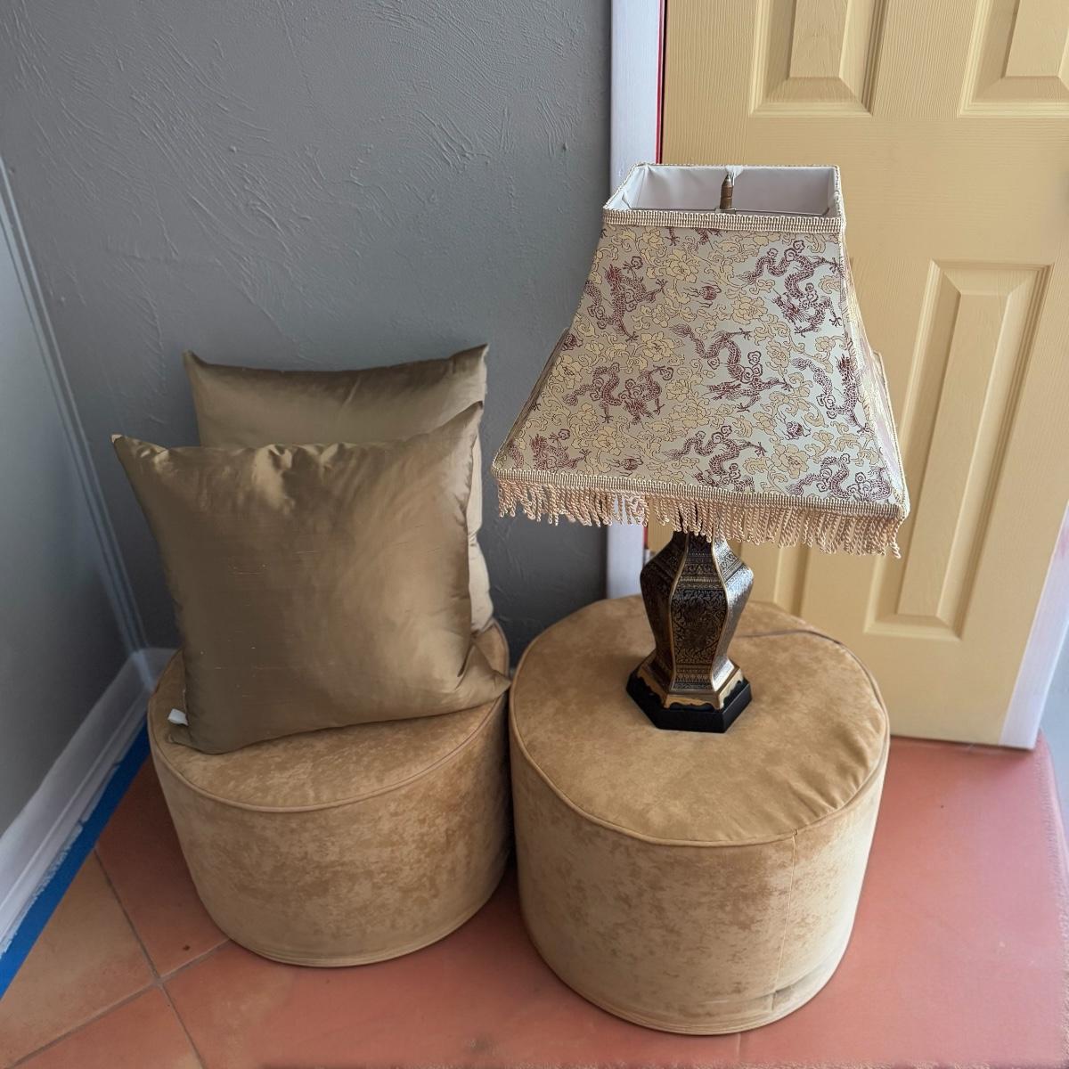 Lot includes two tan ottomans, two gold pillows with an illegible tag, and one lamp with an Asian inspired lampshade. The lamp measures 16” square by 28”H, has an on/off switch and powers on when plugged in. The ottomans measure 20” x 12.5”H. Local pickup only.