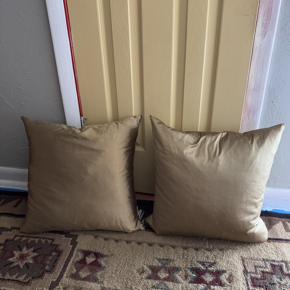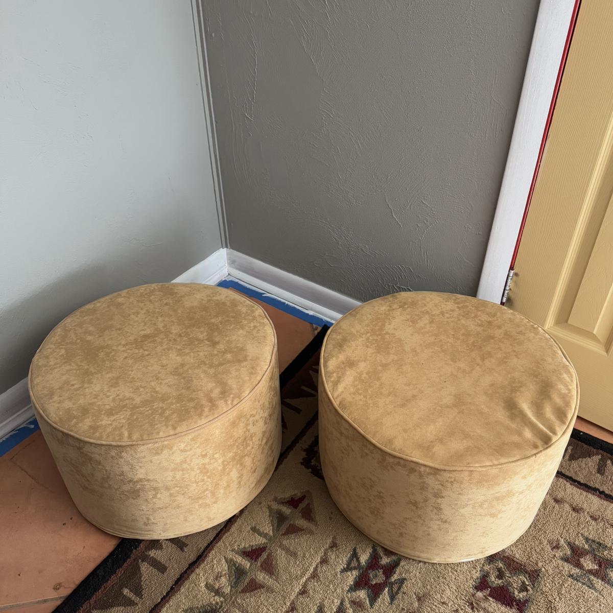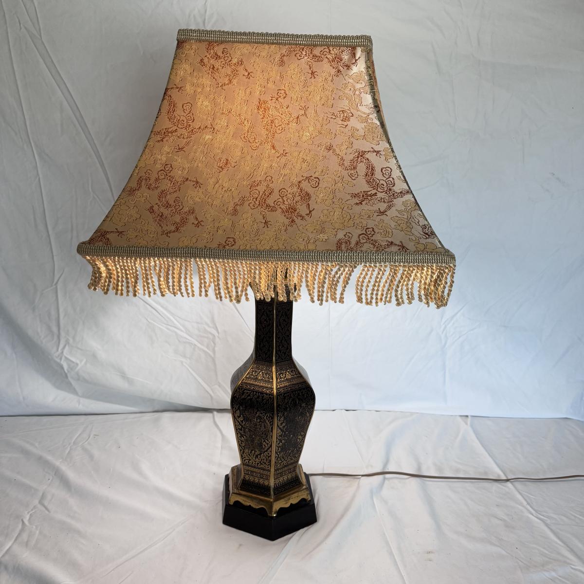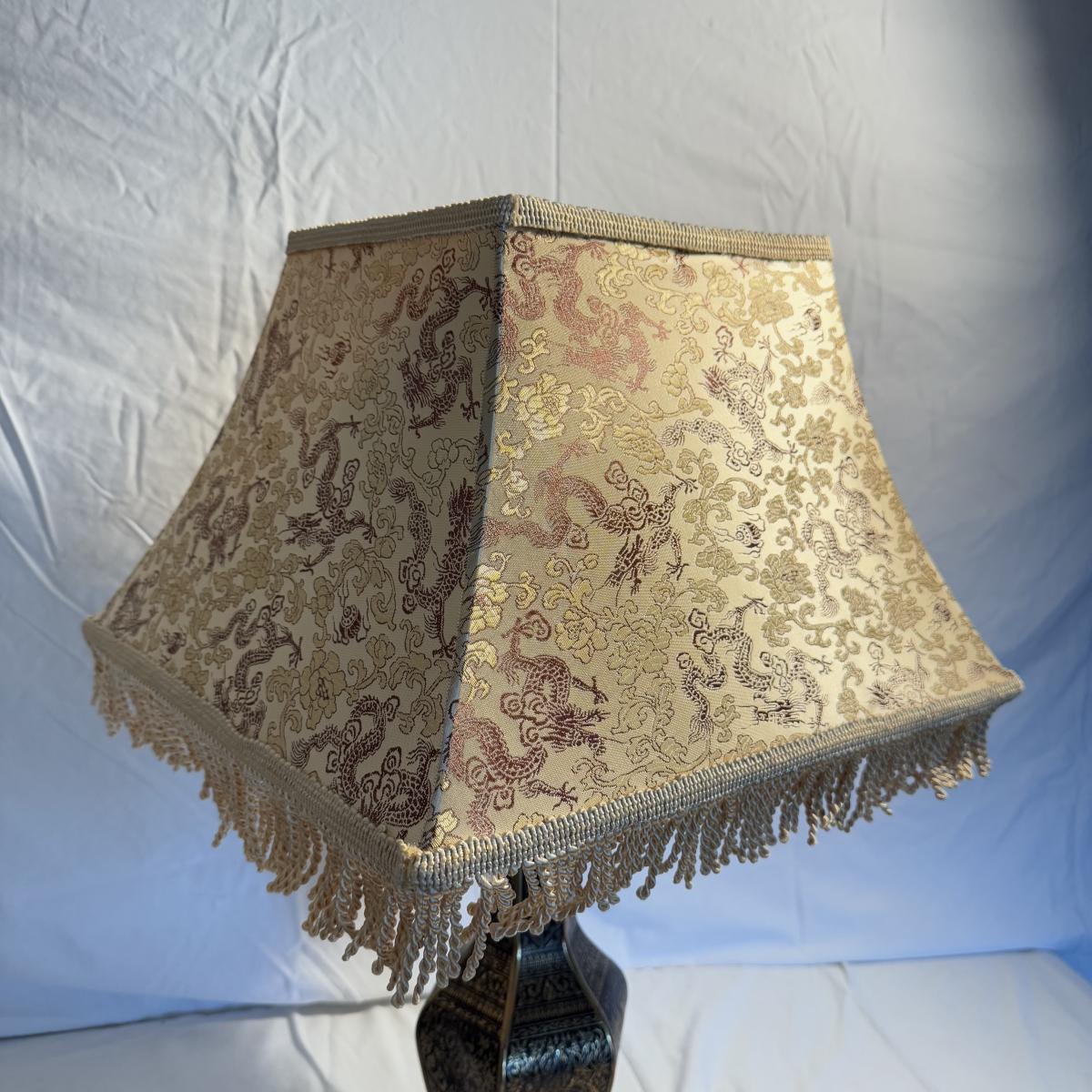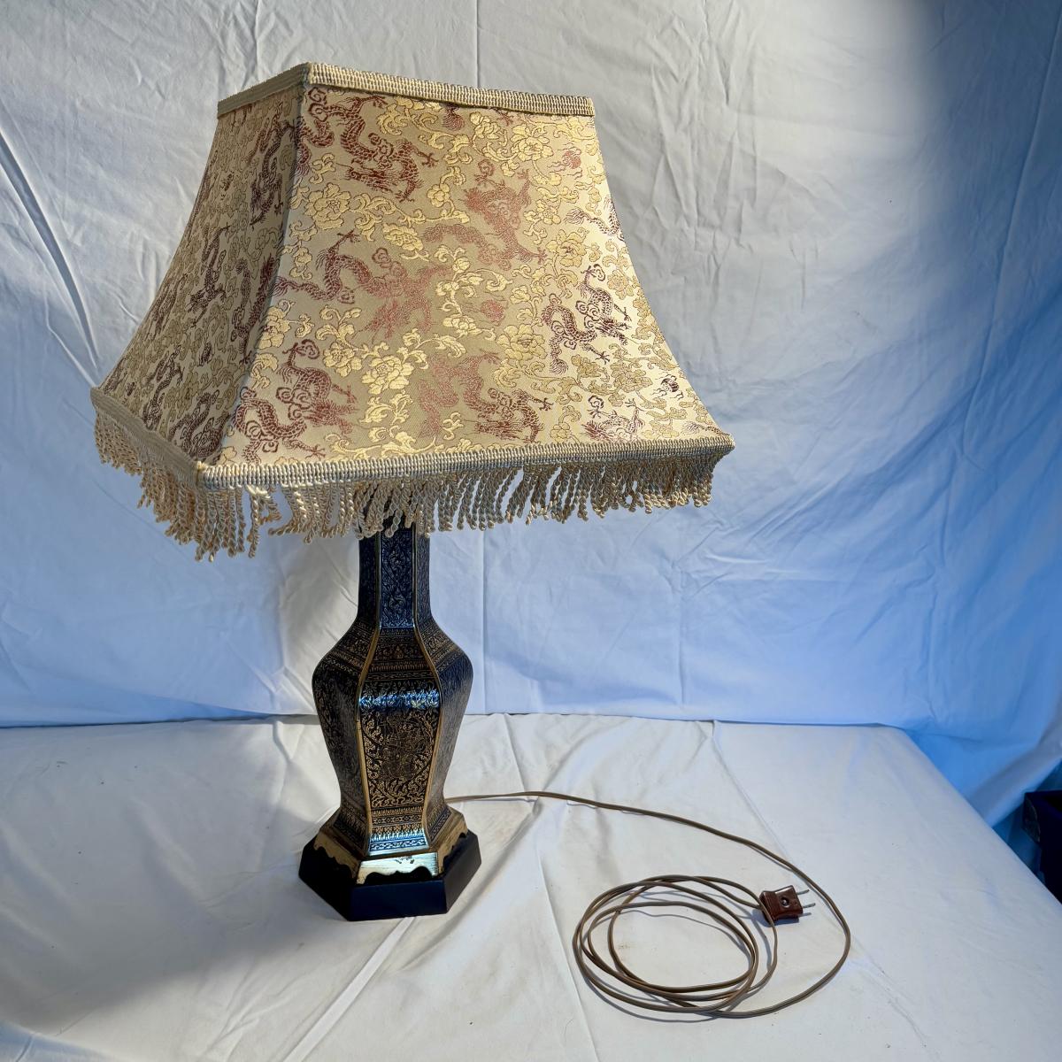 Lot includes two tan ottomans, two gold pillows with an illegible tag, and one lamp with an Asian inspired lampshade. The lamp measures 16” square by 28”H, has an on/off switch and powers on when plugged in. The ottomans measure 20” x 12.5”H. Local pickup only.