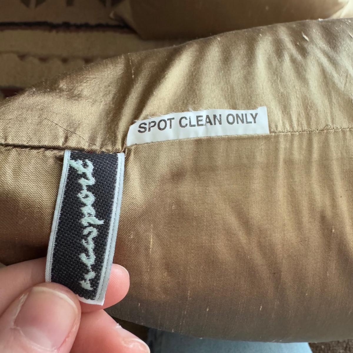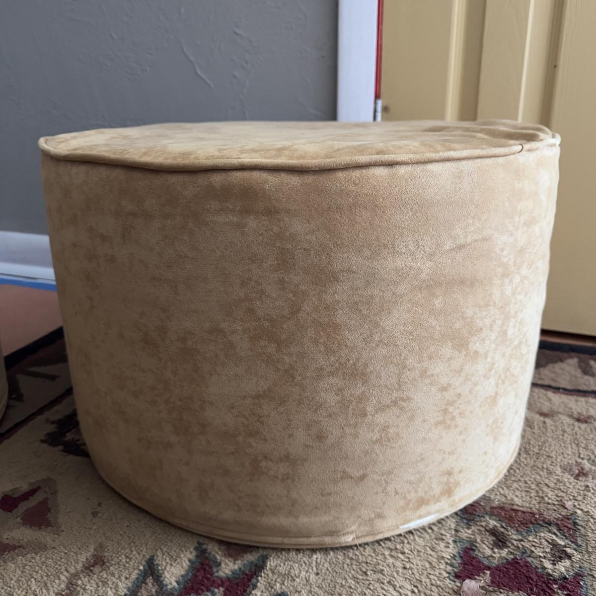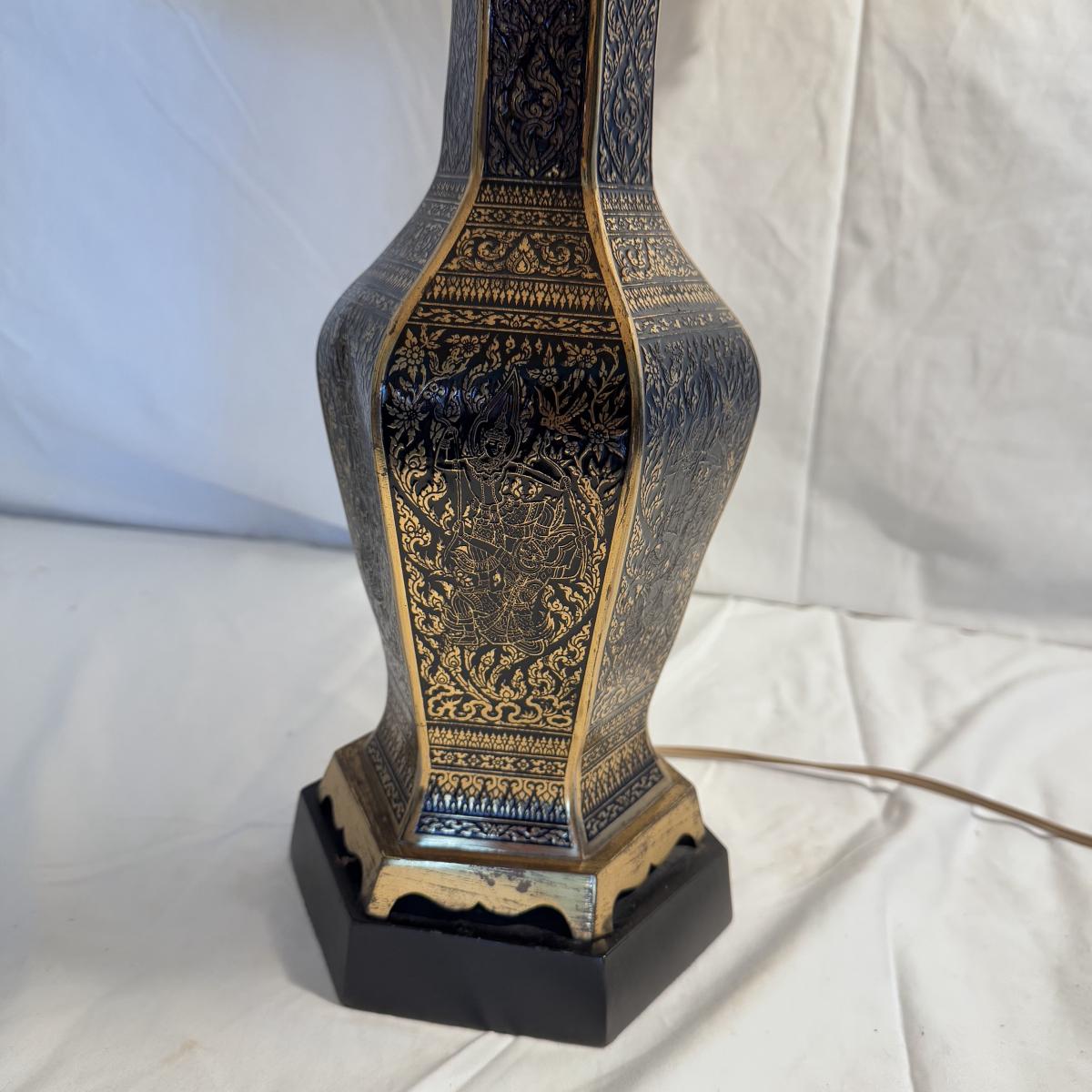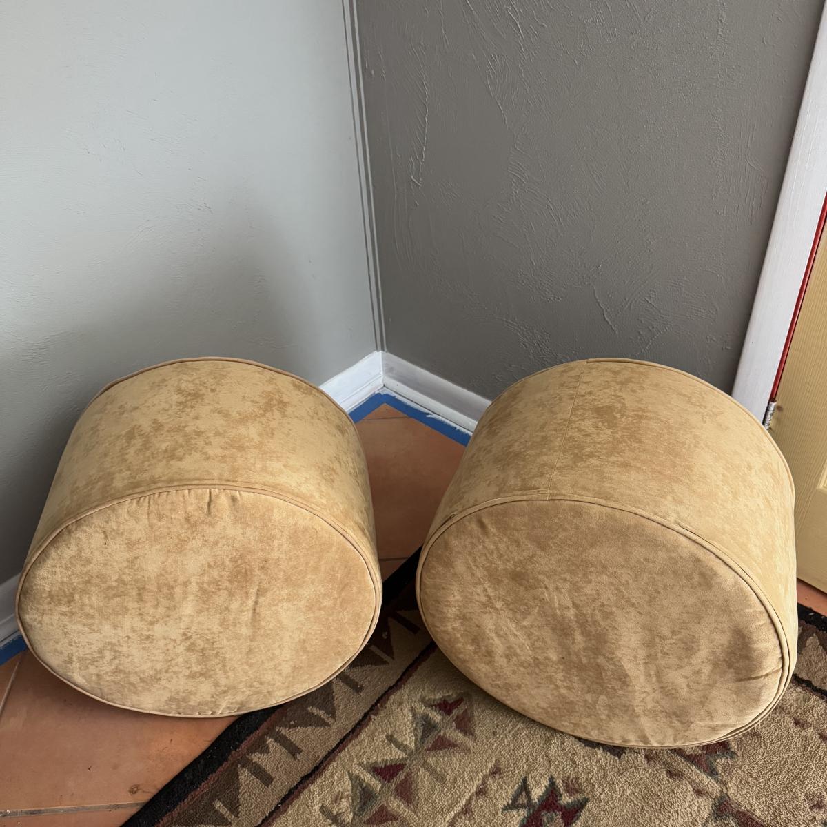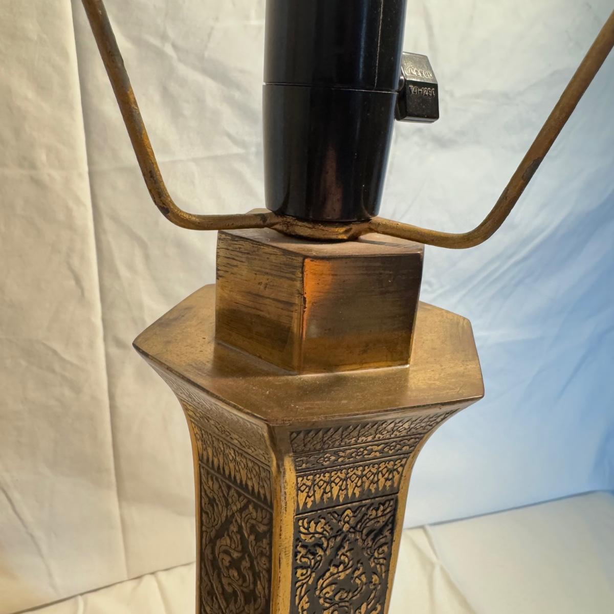 Lot includes two tan ottomans, two gold pillows with an illegible tag, and one lamp with an Asian inspired lampshade. The lamp measures 16” square by 28”H, has an on/off switch and powers on when plugged in. The ottomans measure 20” x 12.5”H. Local pickup only.