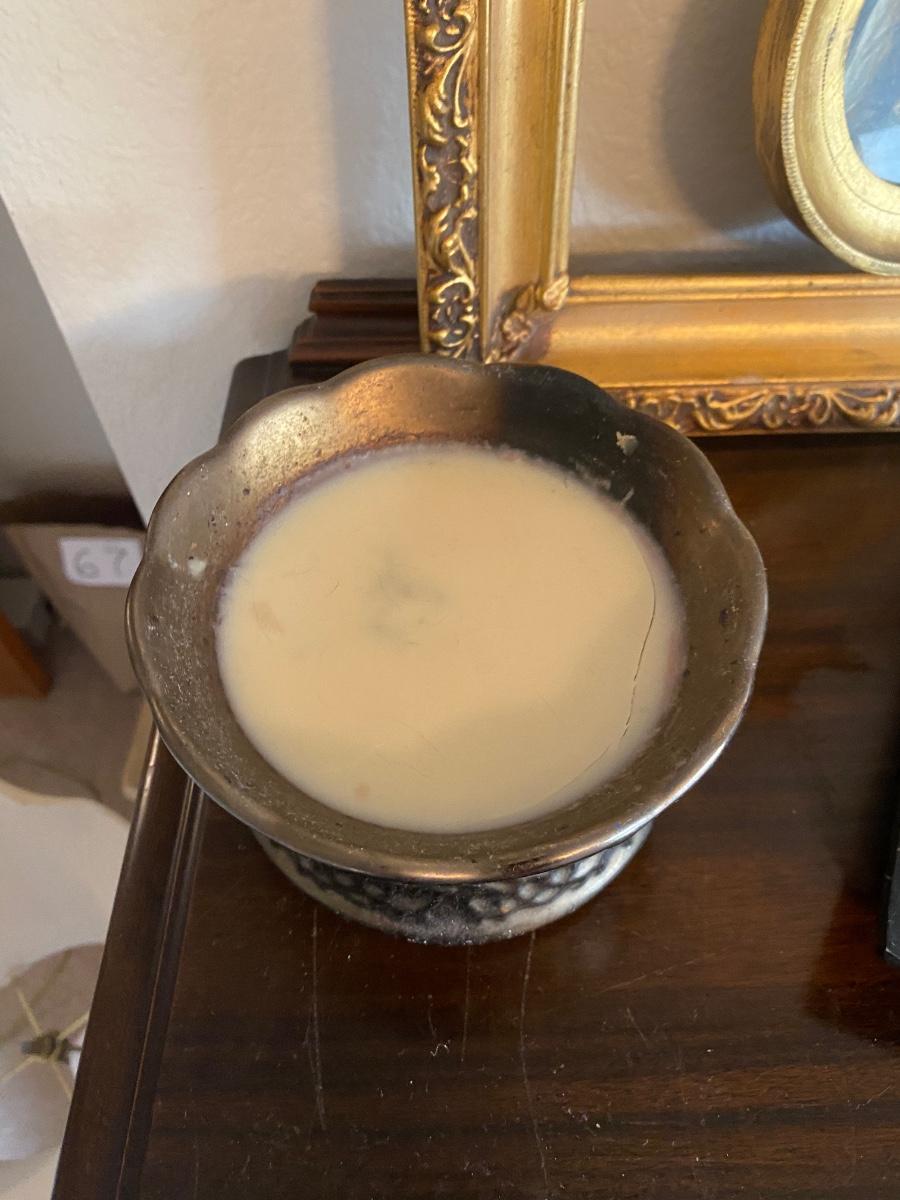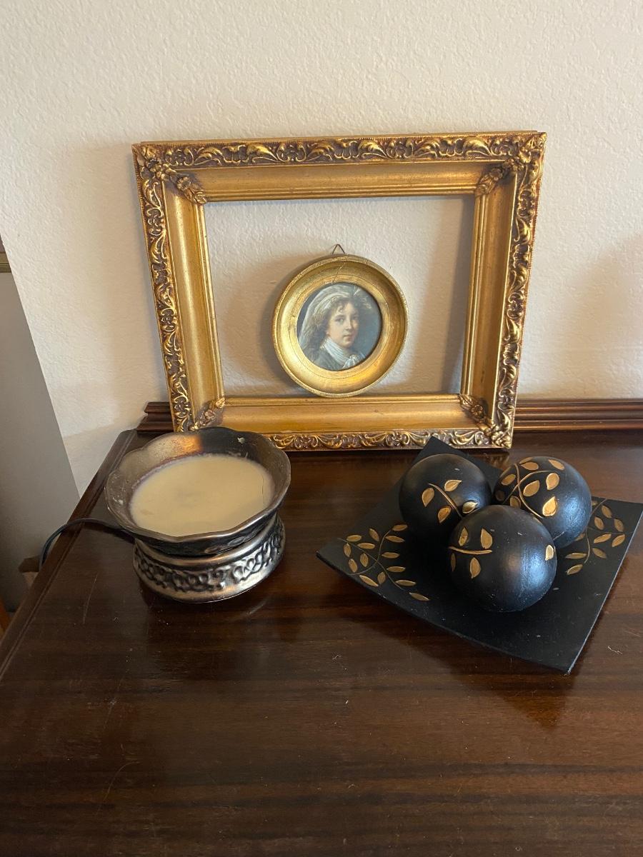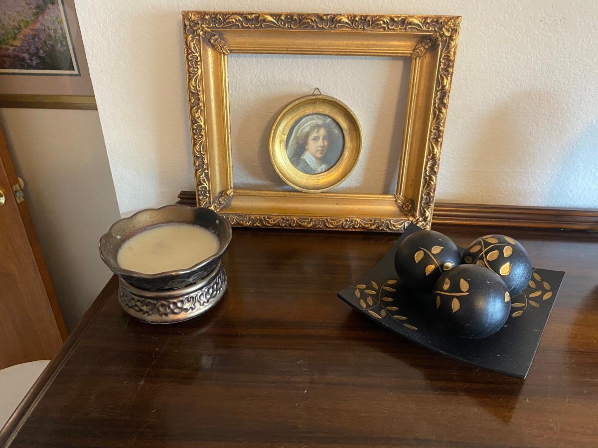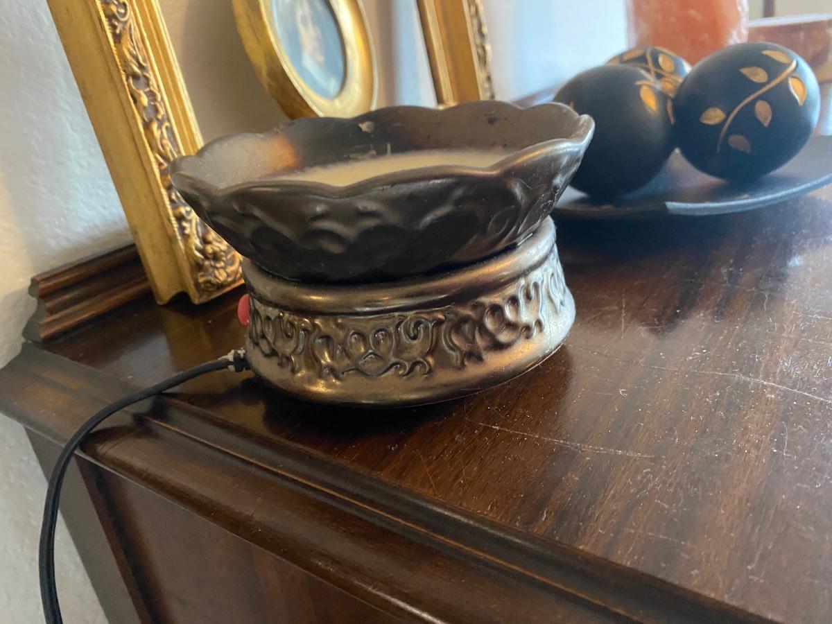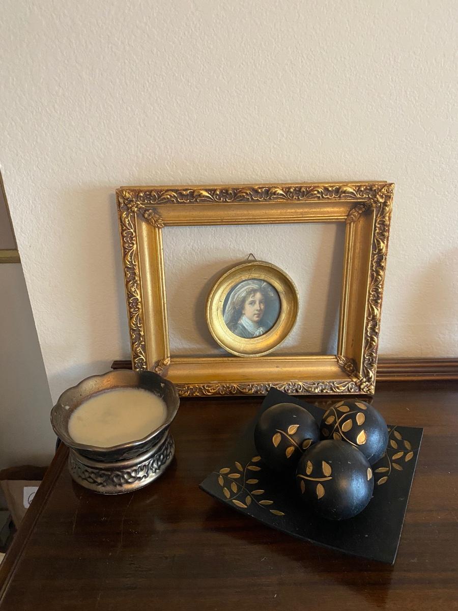 GOLD TONED HOME DECOR, WAX BURNER, ANTIQUE FRAME, CENTER PIECE