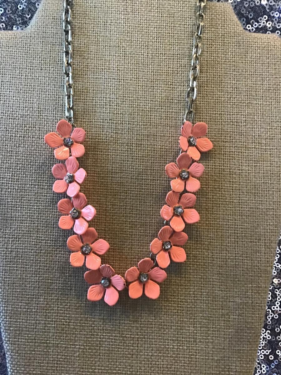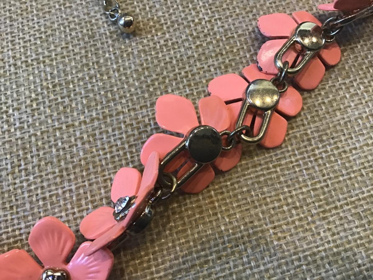 Gold Toned Necklace With Samon Enamel And Rhinestone Flower Links 10"
