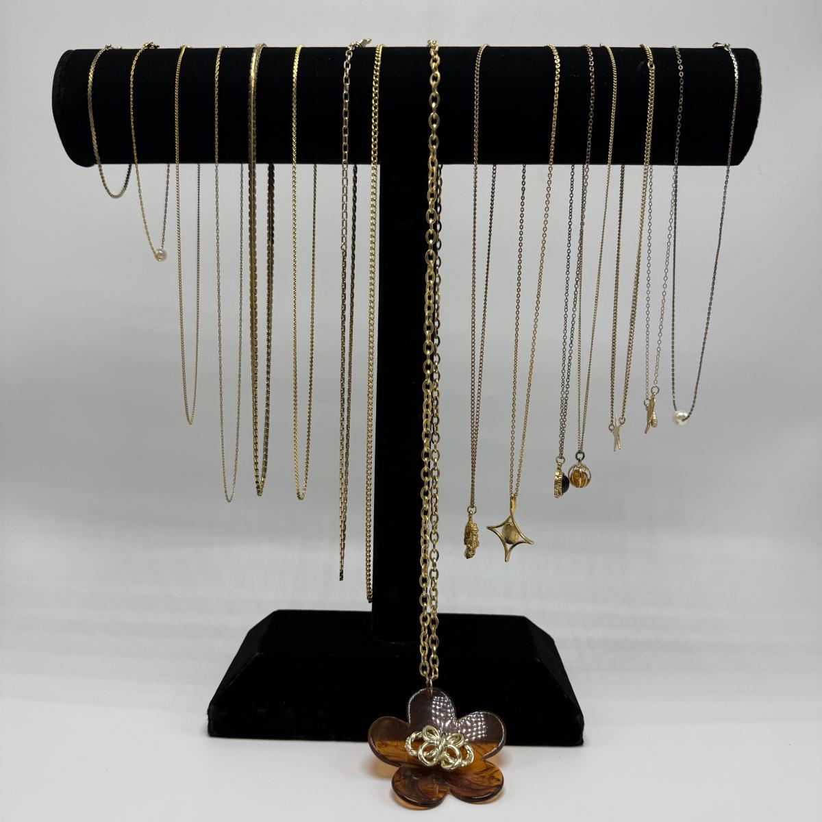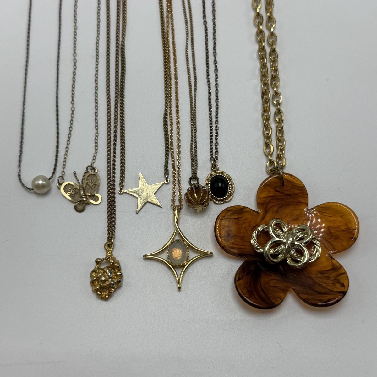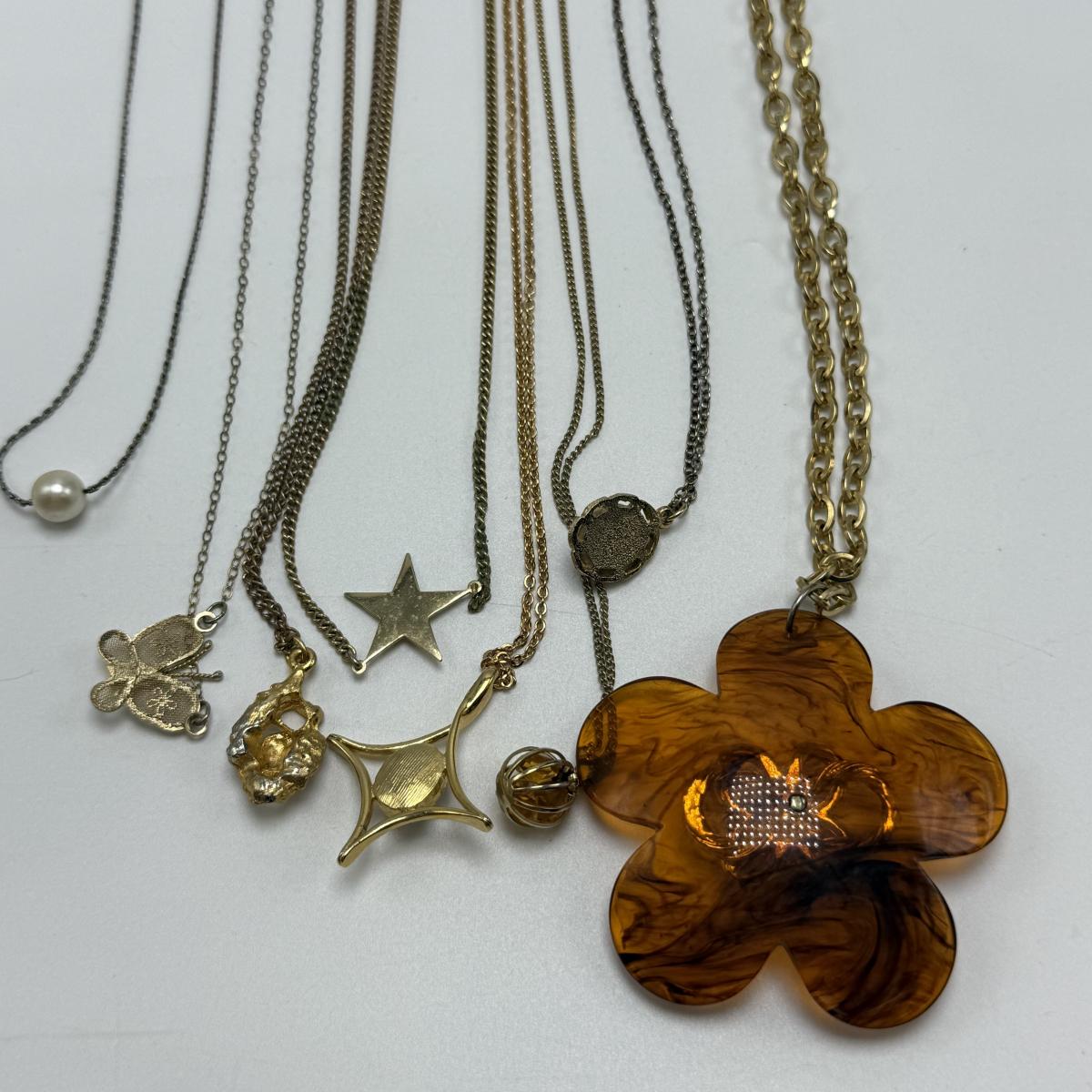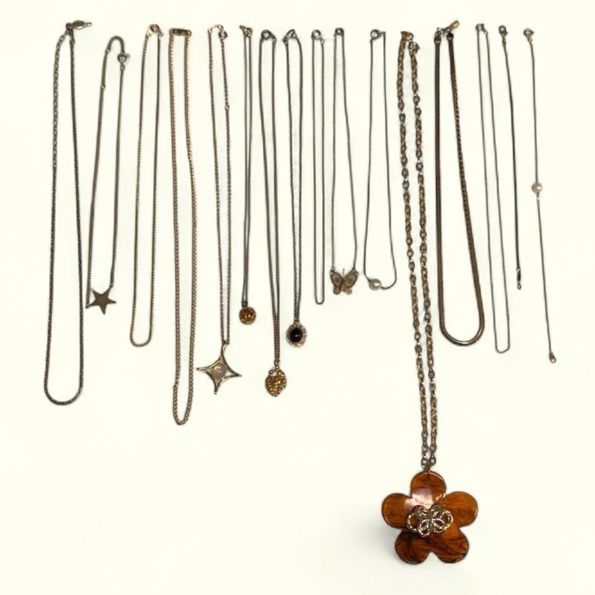 14 necklaces, all but two are gold toned. Eight have a pendant or attached adornment. Two bracelets are included as well. The longest necklace chain with the large flower pendant is 24“ long. Please see photos for inventory and all markings and details.