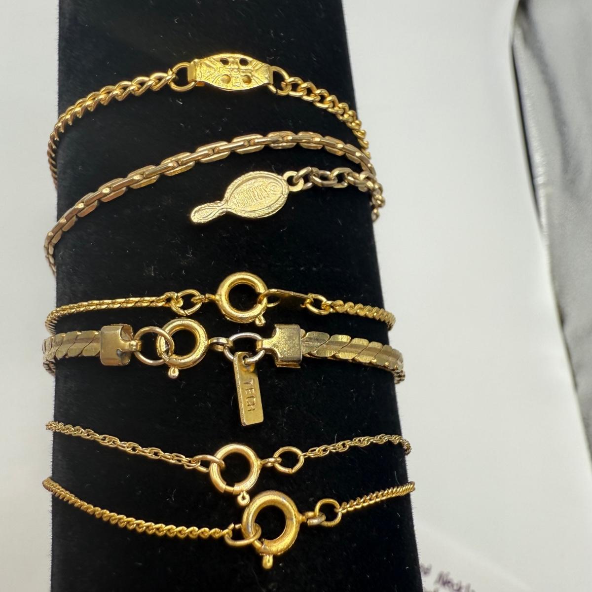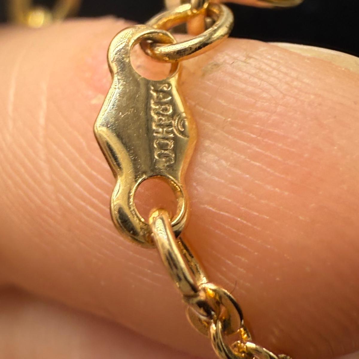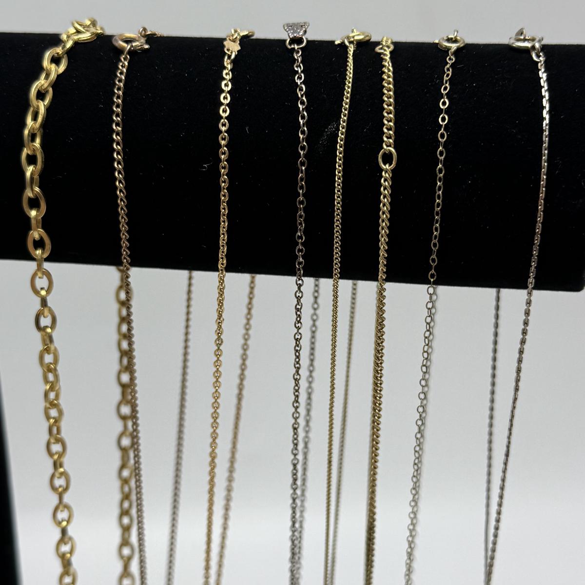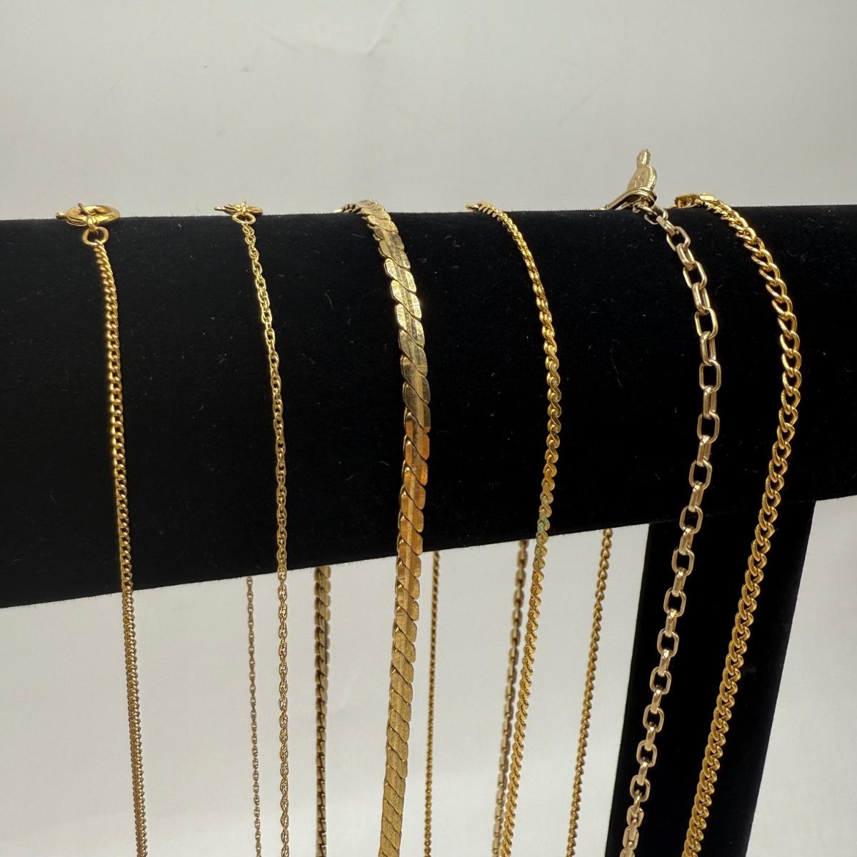 14 necklaces, all but two are gold toned. Eight have a pendant or attached adornment. Two bracelets are included as well. The longest necklace chain with the large flower pendant is 24“ long. Please see photos for inventory and all markings and details.