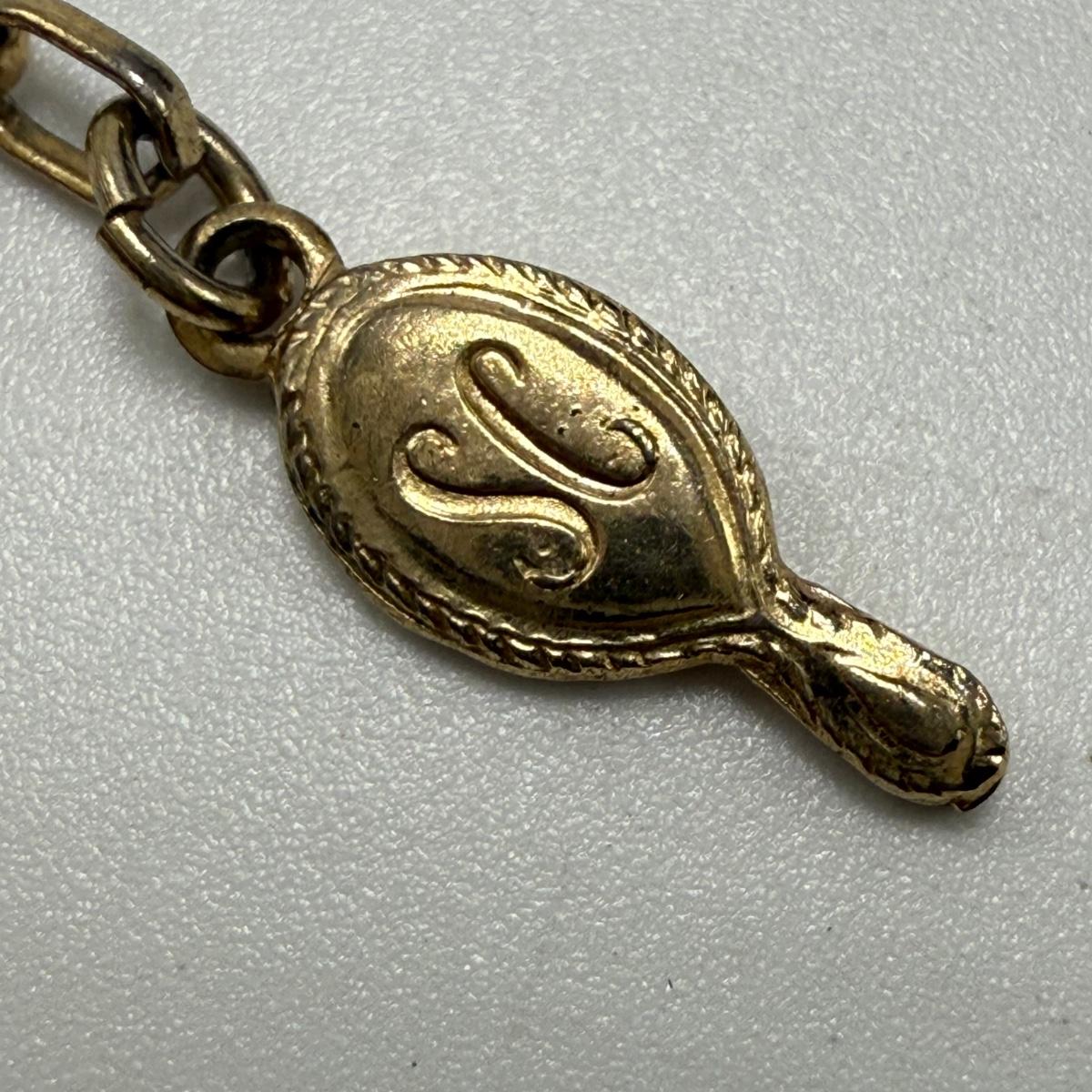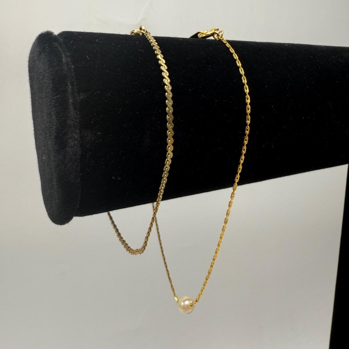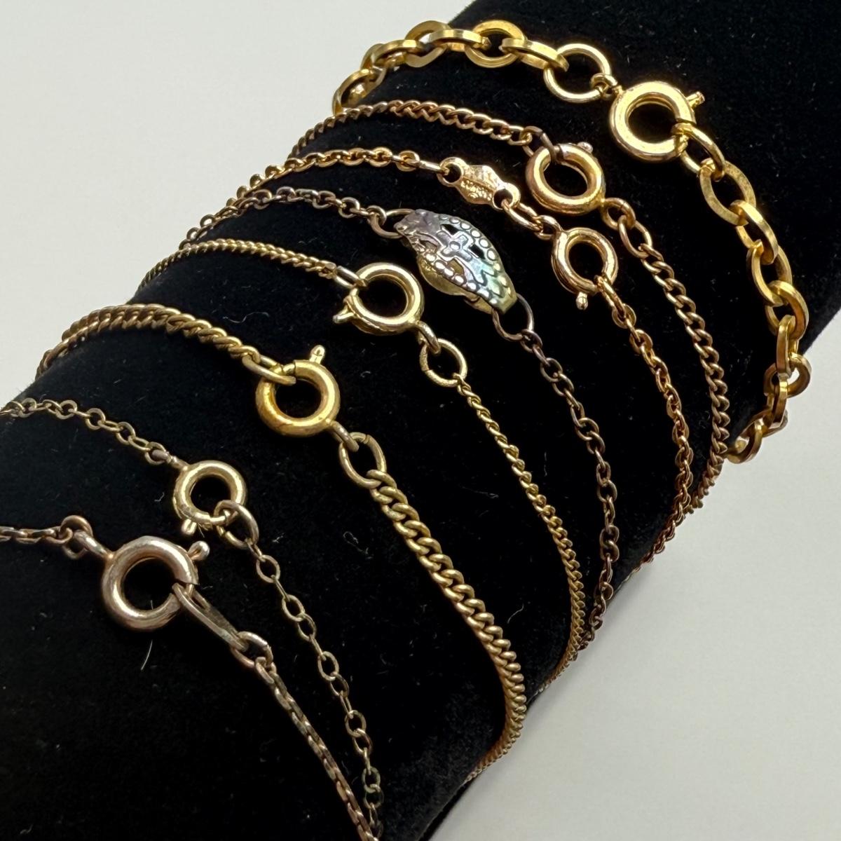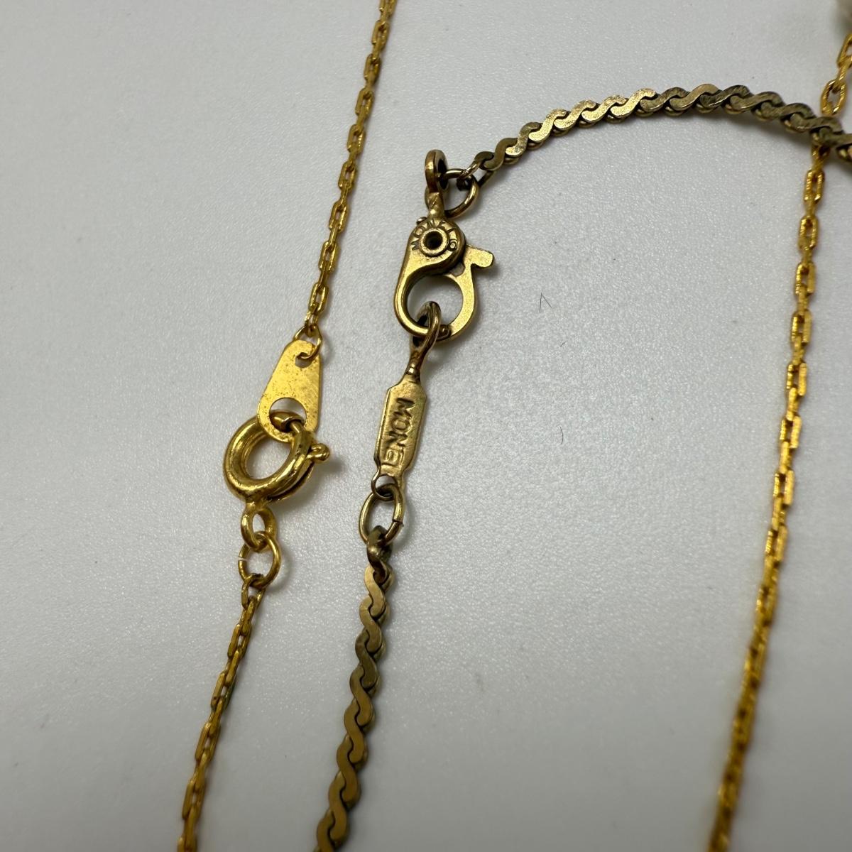 14 necklaces, all but two are gold toned. Eight have a pendant or attached adornment. Two bracelets are included as well. The longest necklace chain with the large flower pendant is 24“ long. Please see photos for inventory and all markings and details.
