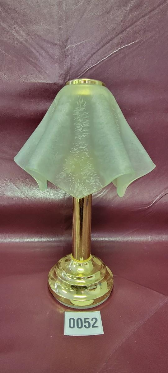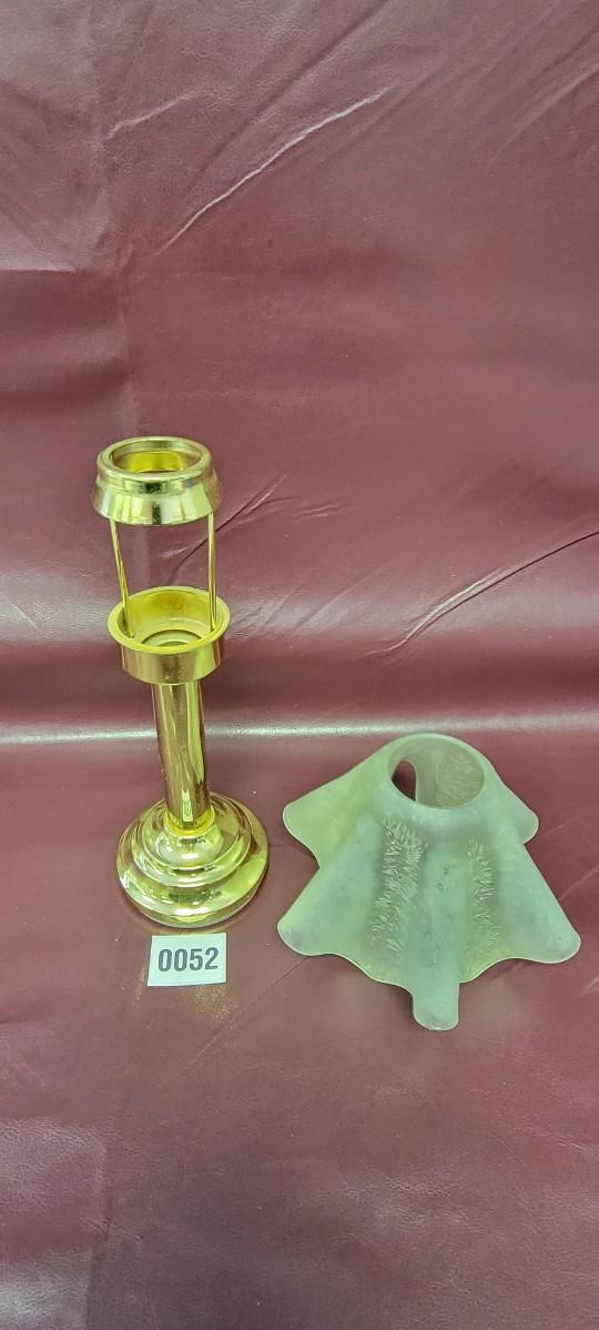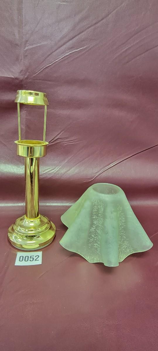 Holds a small tea lite candle or equivalent diameter. Frosted glass shade included.