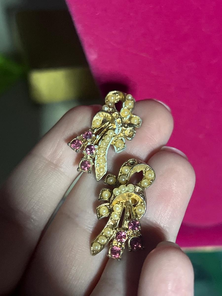 Golden toned ribbon earrings with pink jewels