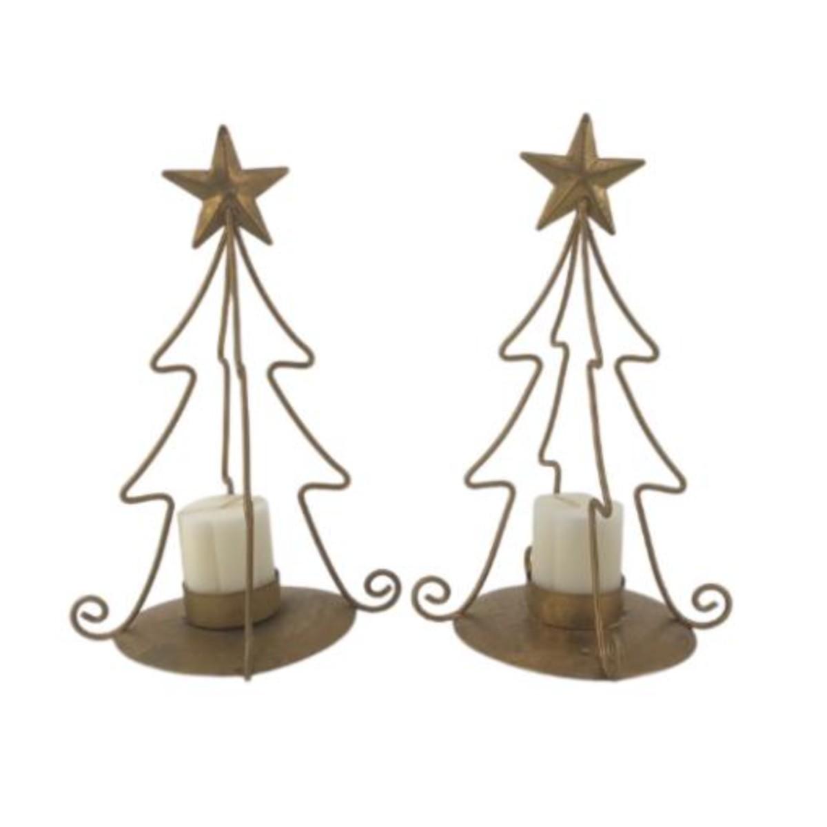 Pair of gold painted metal Christmas tree votive candle holders. Each measures 5” x 9”. Candles not included. Adorable holiday candle holders!