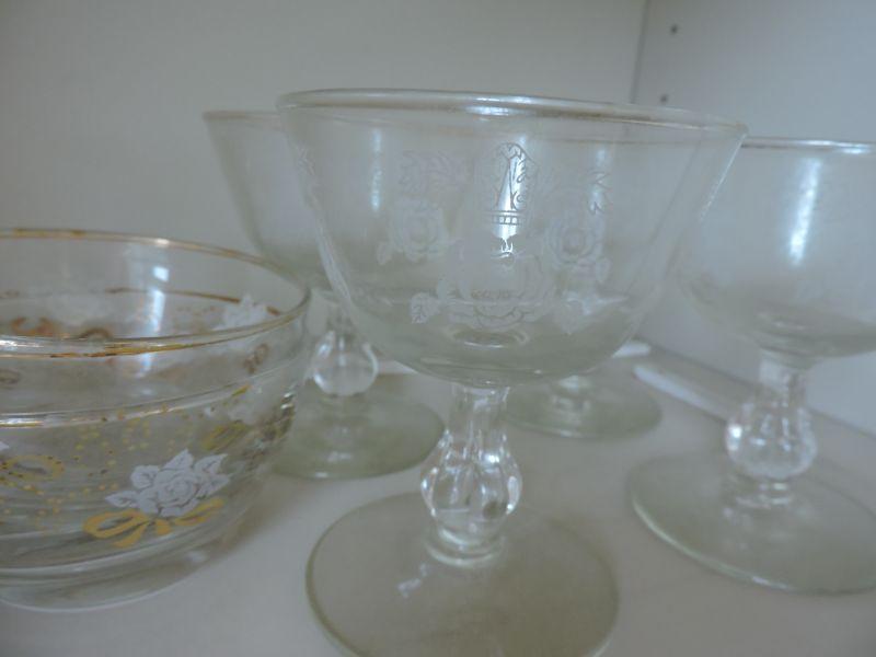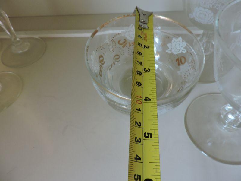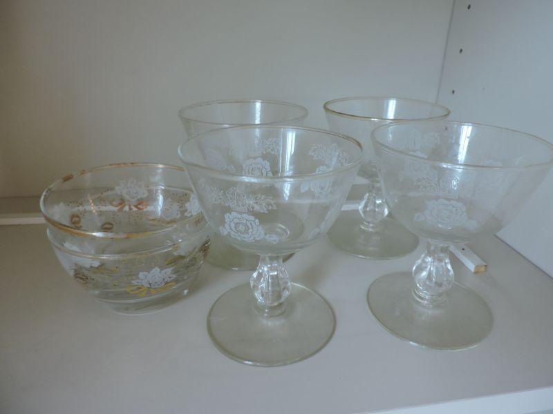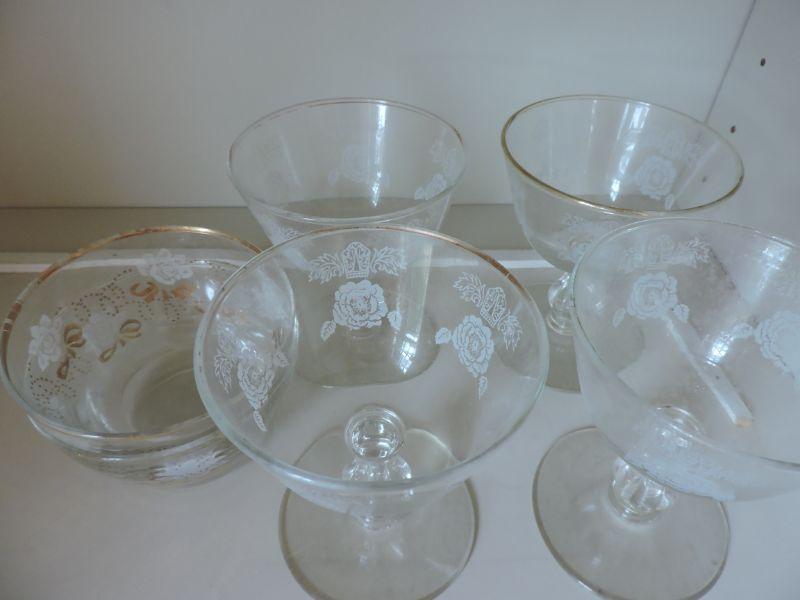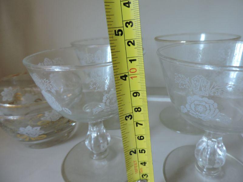 Etched glass and gold trimmed dessert cups and glasses. **Please read Terms and Conditions before placing a bid. Pick up is Saturday, November 30 from 9am to 3pm in Bridgeton, NJ. All sales are final. All sales are as is, where is. Please review all photos. Any props included in photos are not included in listing. All measurements are approximate.