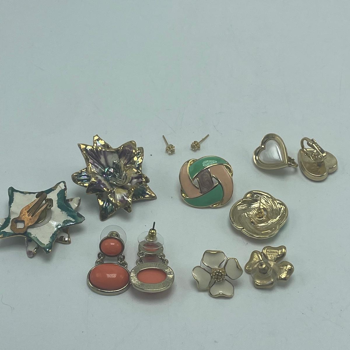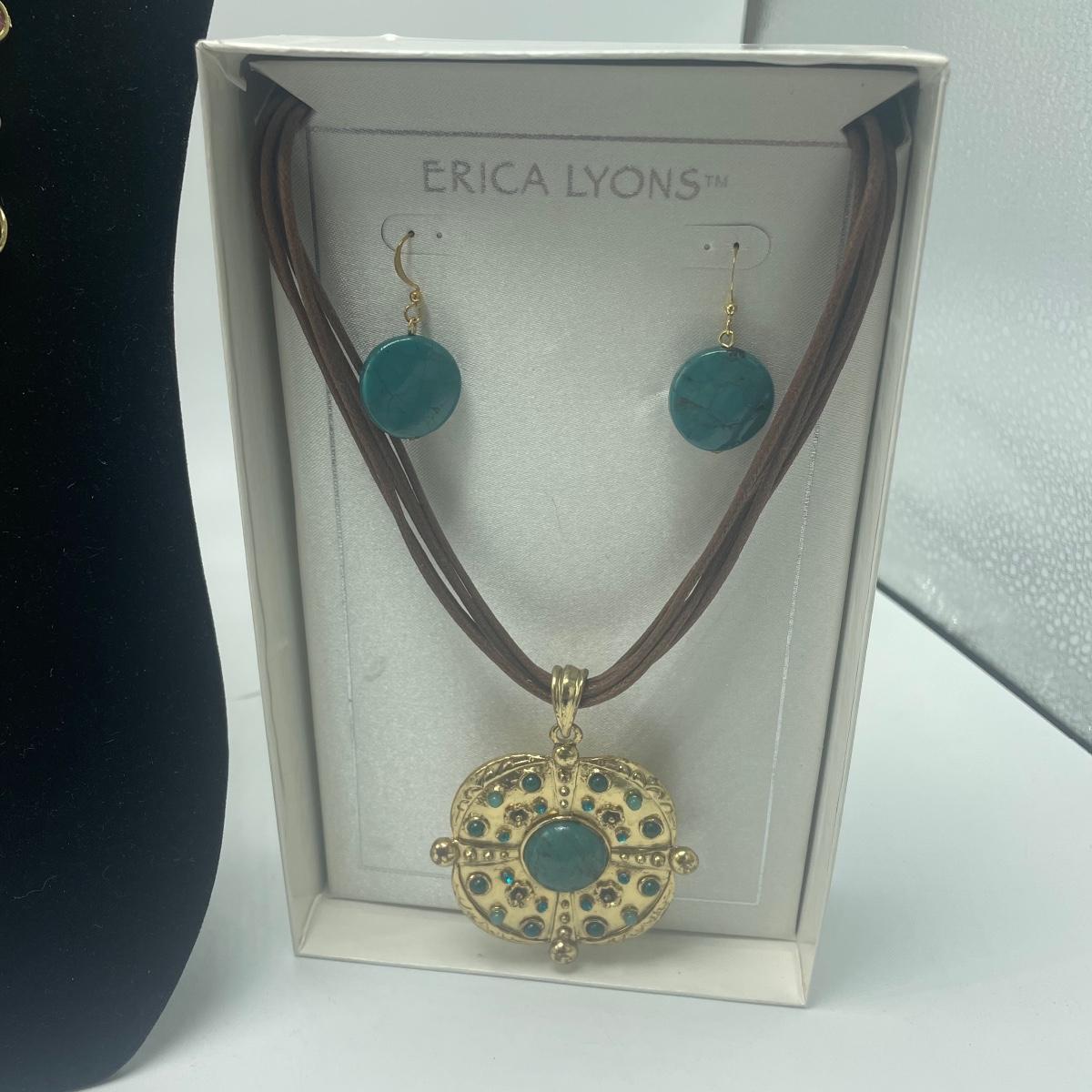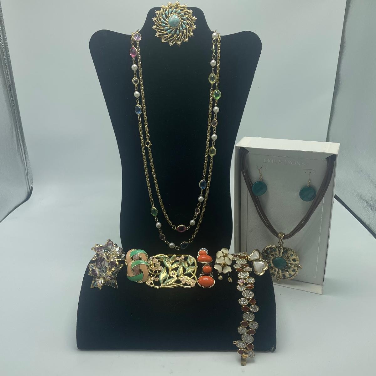 A lovely assortment of jewelry that includes a necklace and post earrings set by Erica Lyons, along with another long necklace, a faux diamond and amber stone bracelet with safety chain, two brooches, and six pairs of earrings (two clip on, rest are for pierced ears). All pieces are costume jewelry.