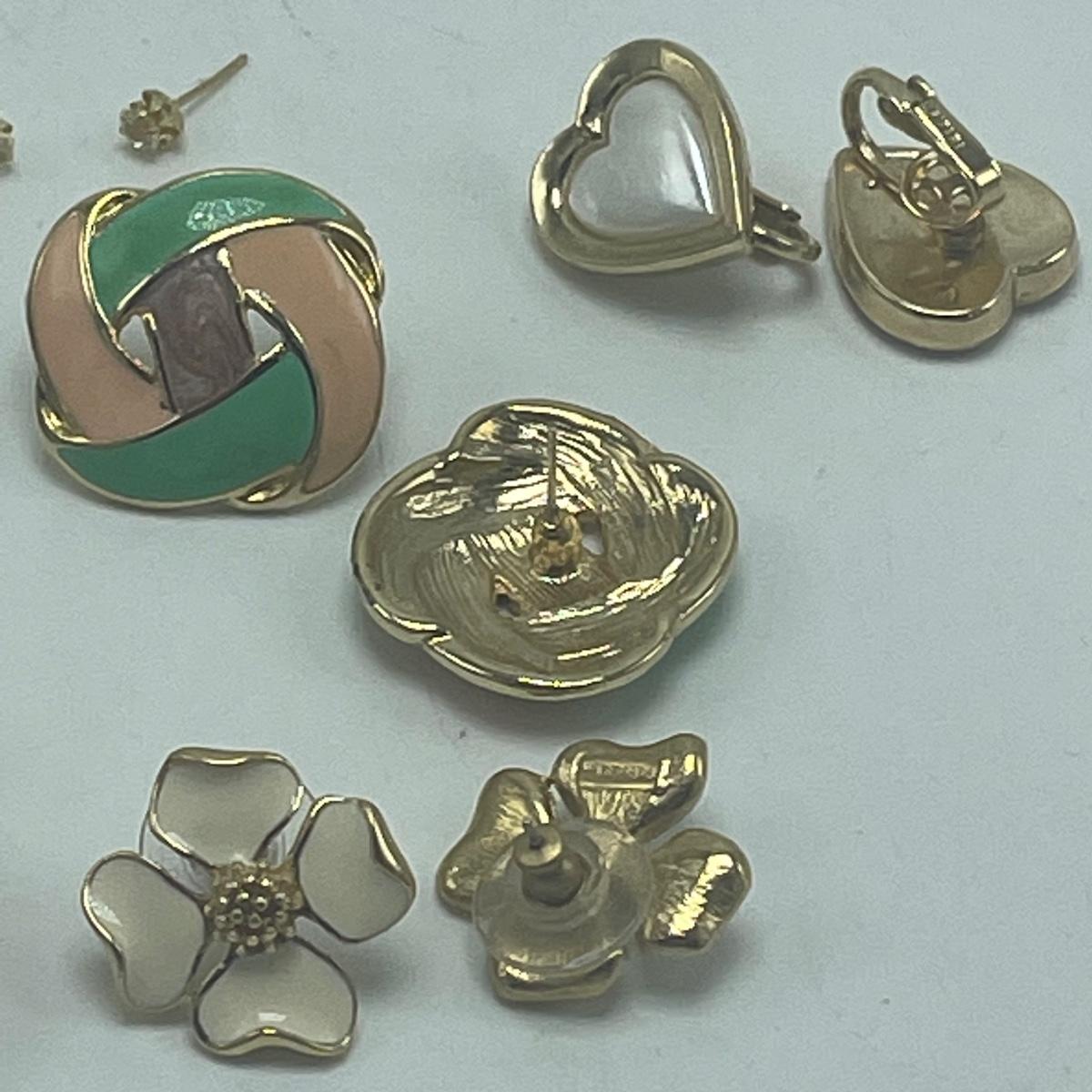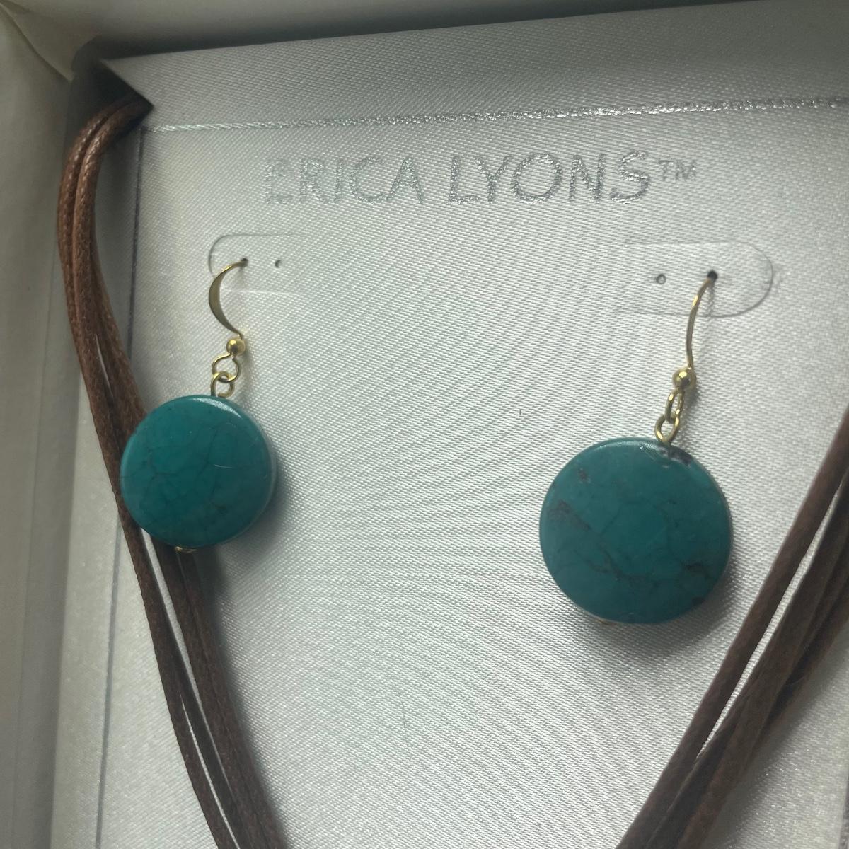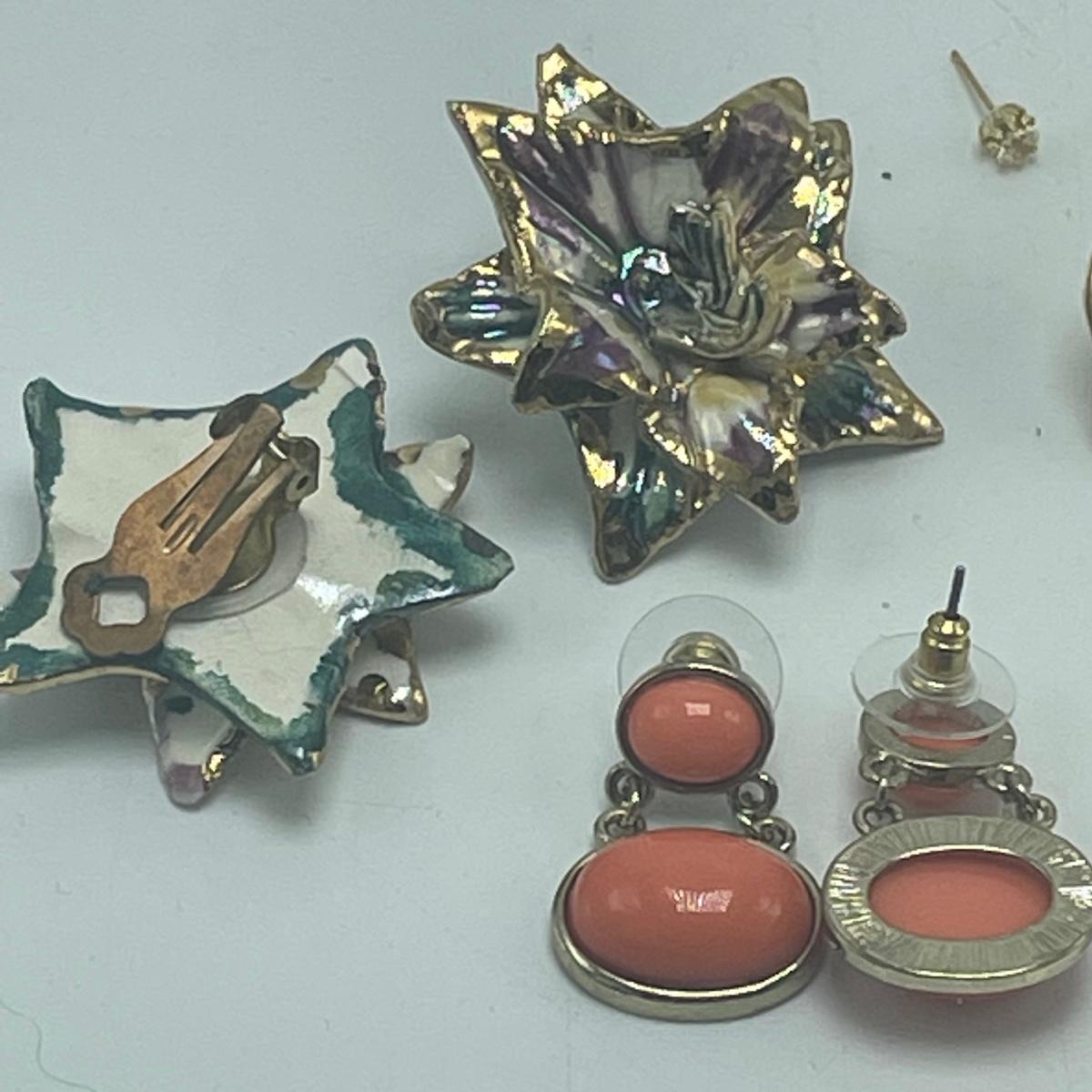 A lovely assortment of jewelry that includes a necklace and post earrings set by Erica Lyons, along with another long necklace, a faux diamond and amber stone bracelet with safety chain, two brooches, and six pairs of earrings (two clip on, rest are for pierced ears). All pieces are costume jewelry.