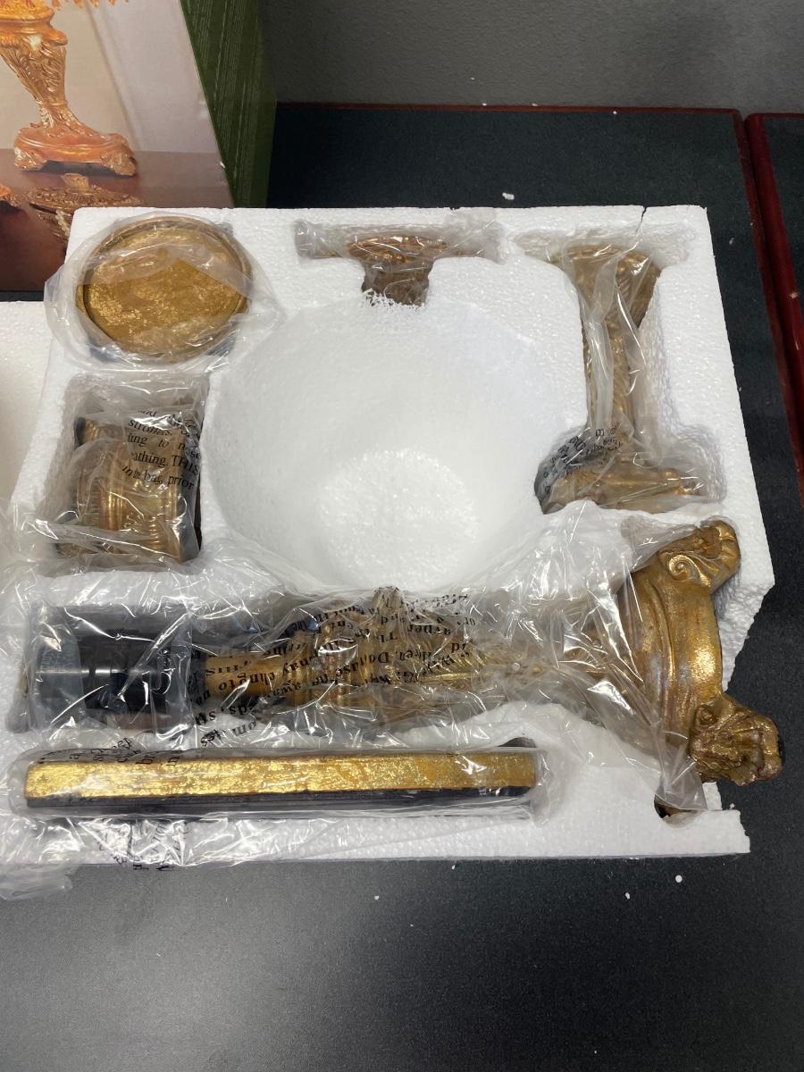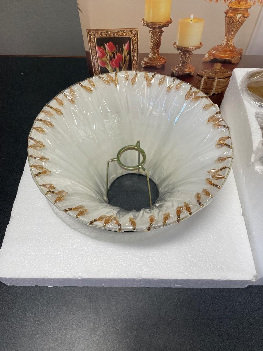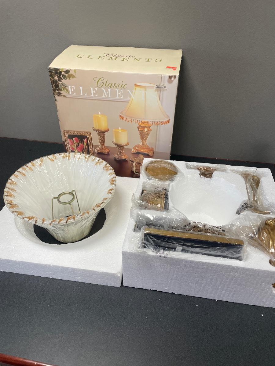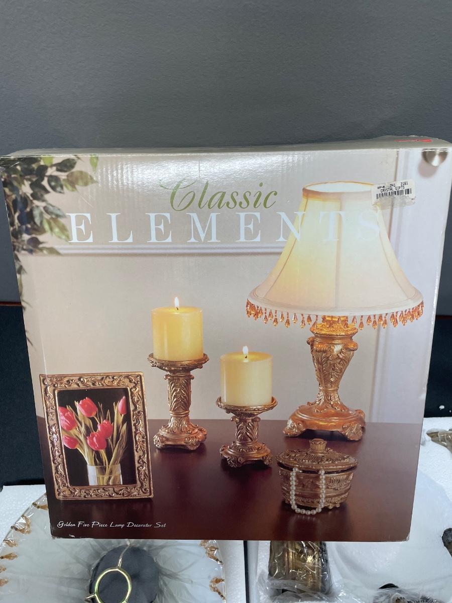 New in box. Includes lamp, 2 candle holders, photo frame and jewelry trinket box.