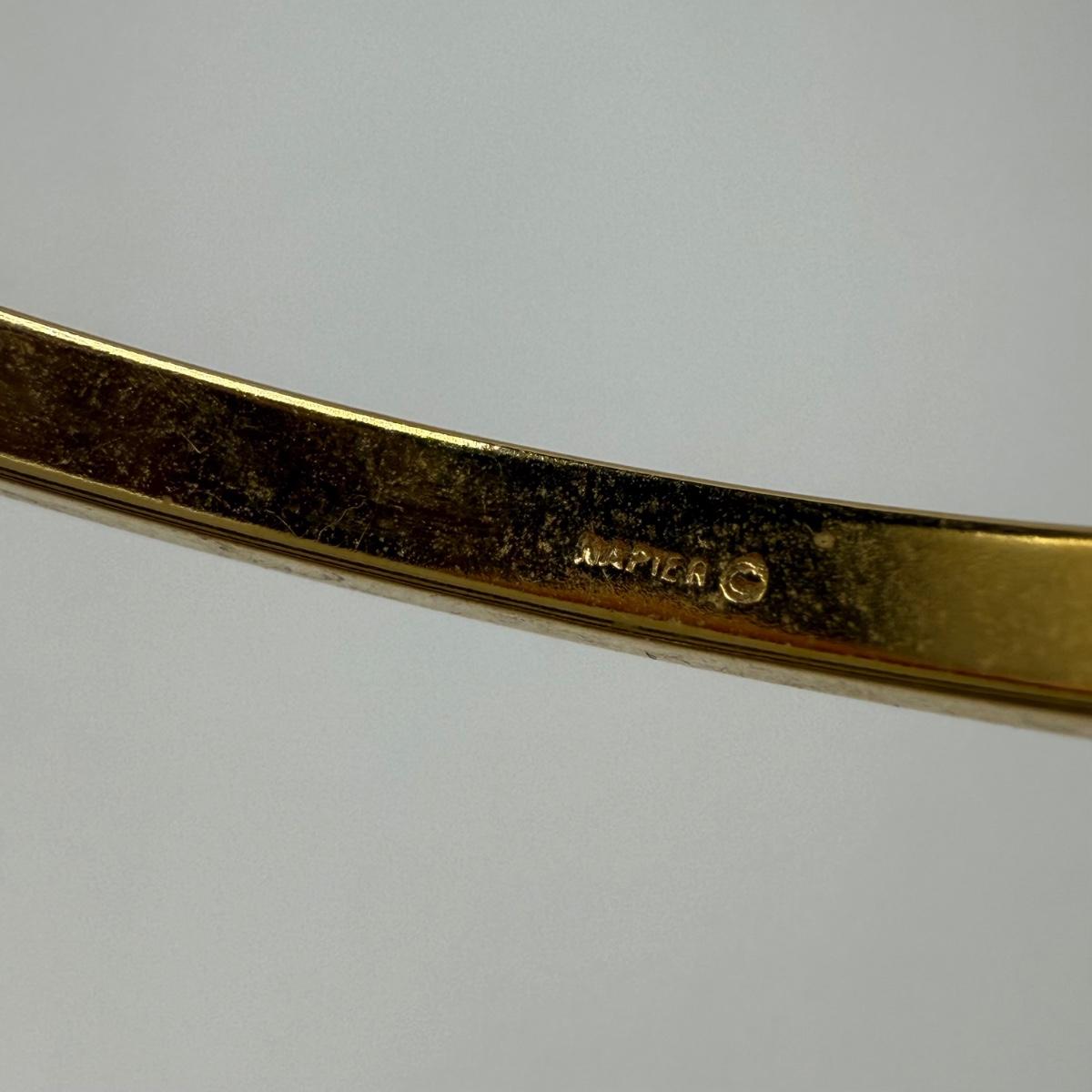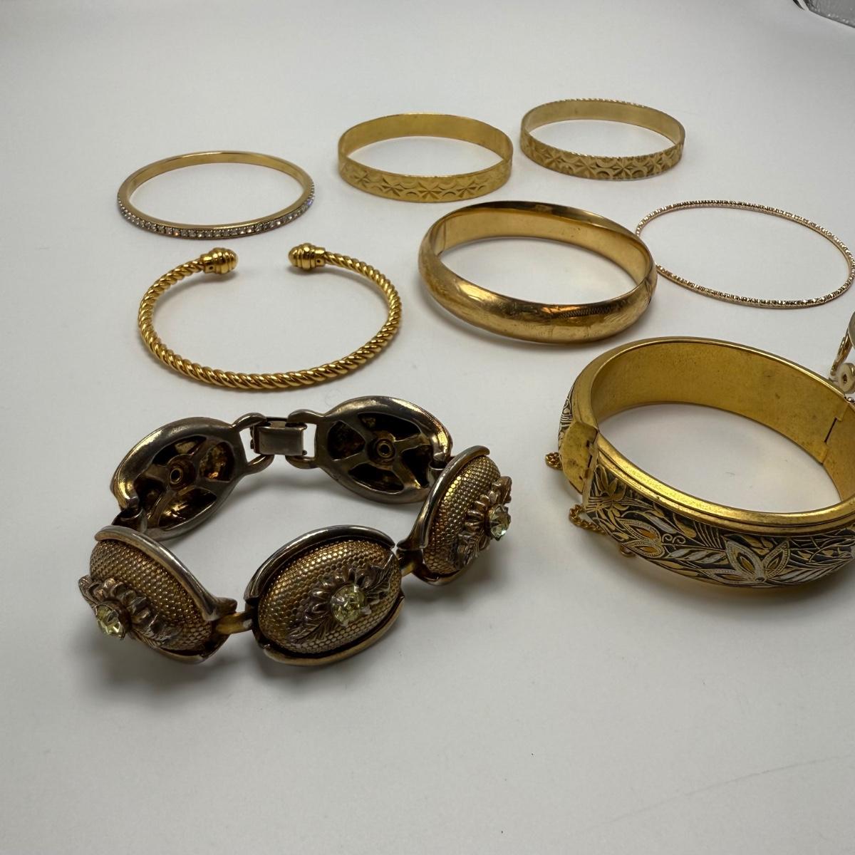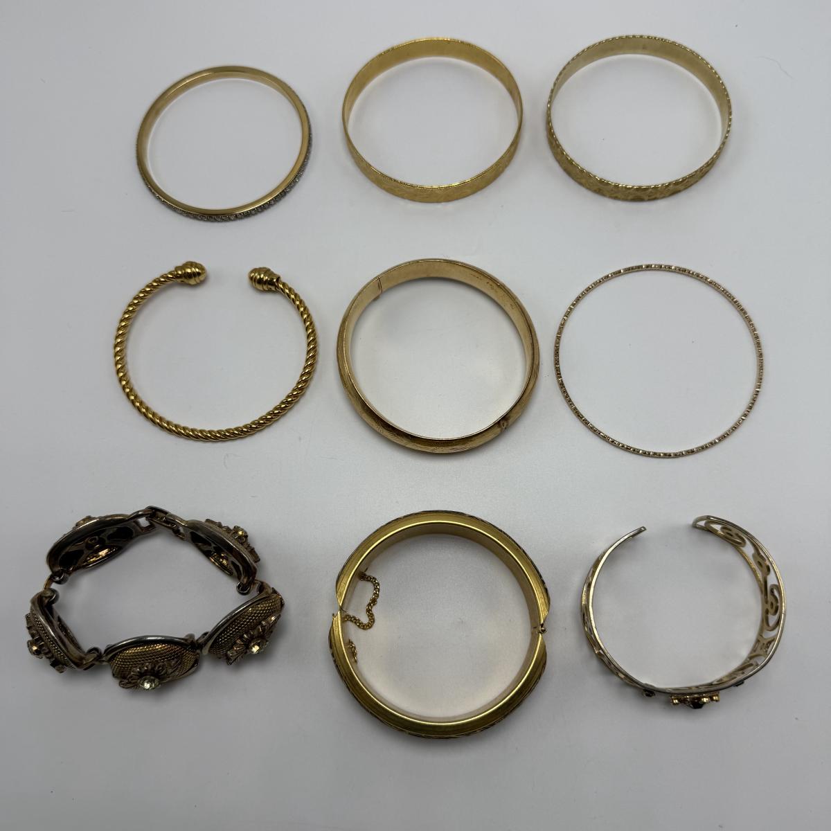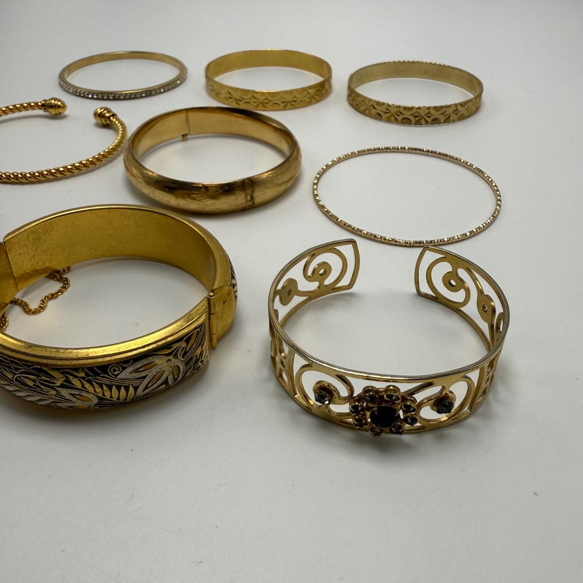 Nine gold metal bracelets, eight of which are bangle style. The collection features bracelets with ornate designs and some gemstones. Brand name found on only one bracelet - Napier. Please see photos for inventory and details.