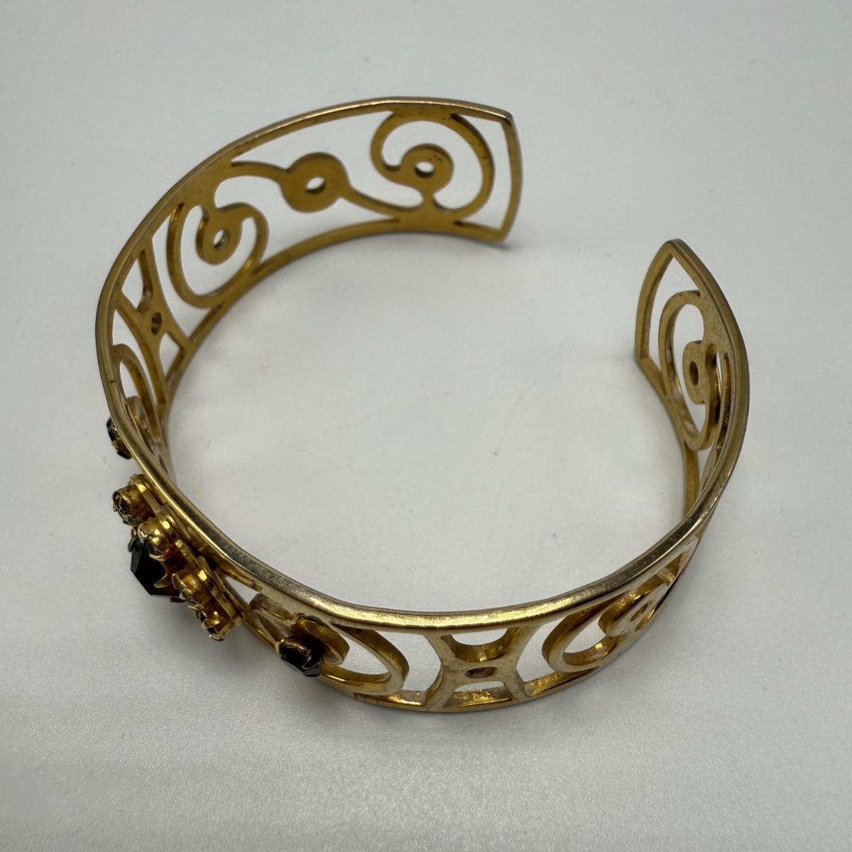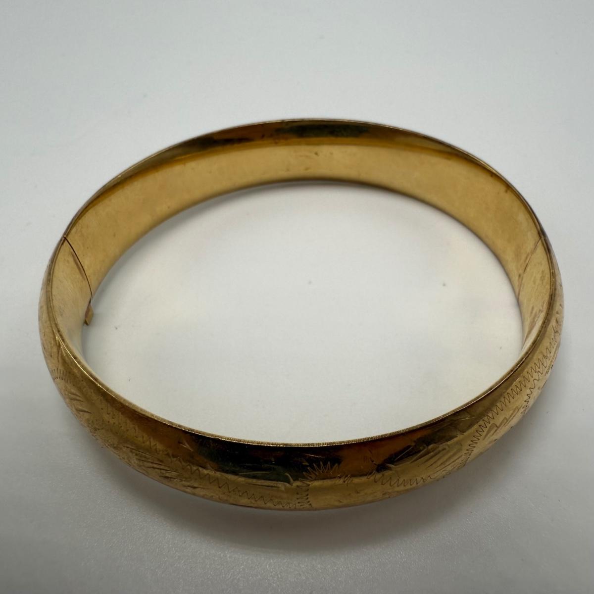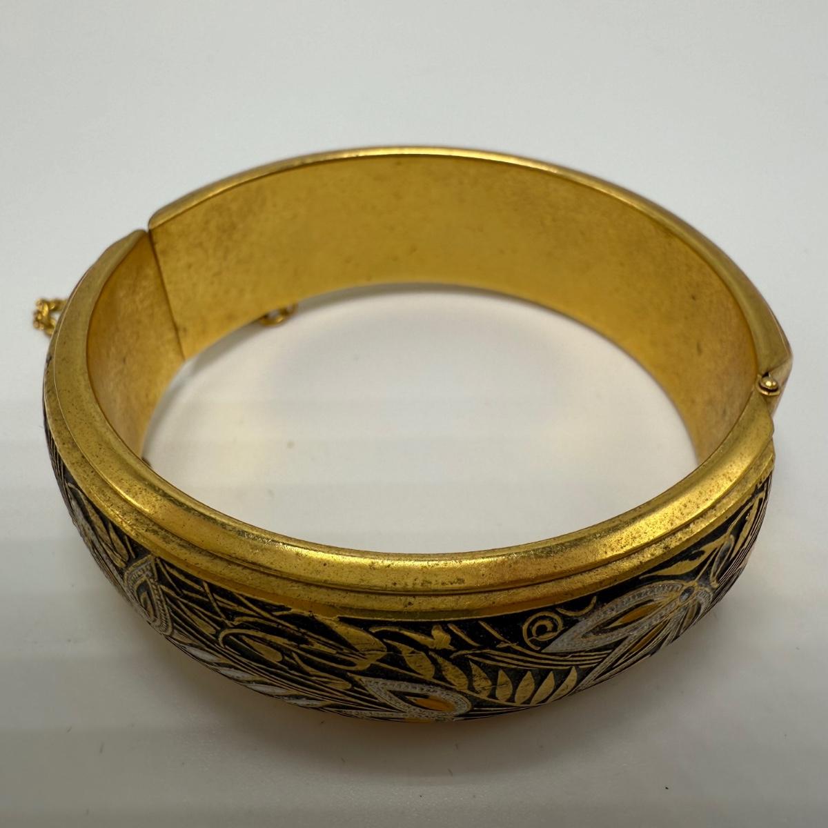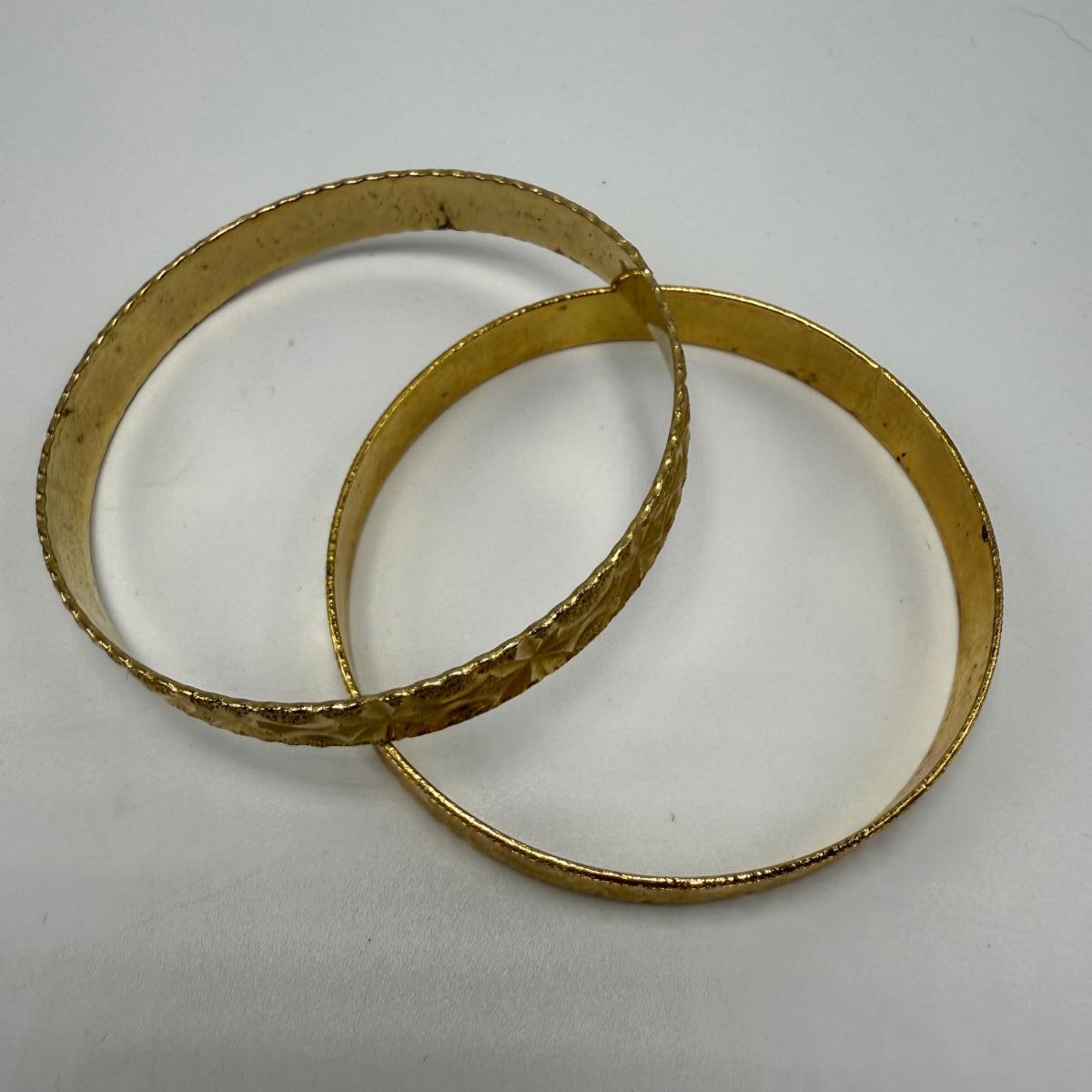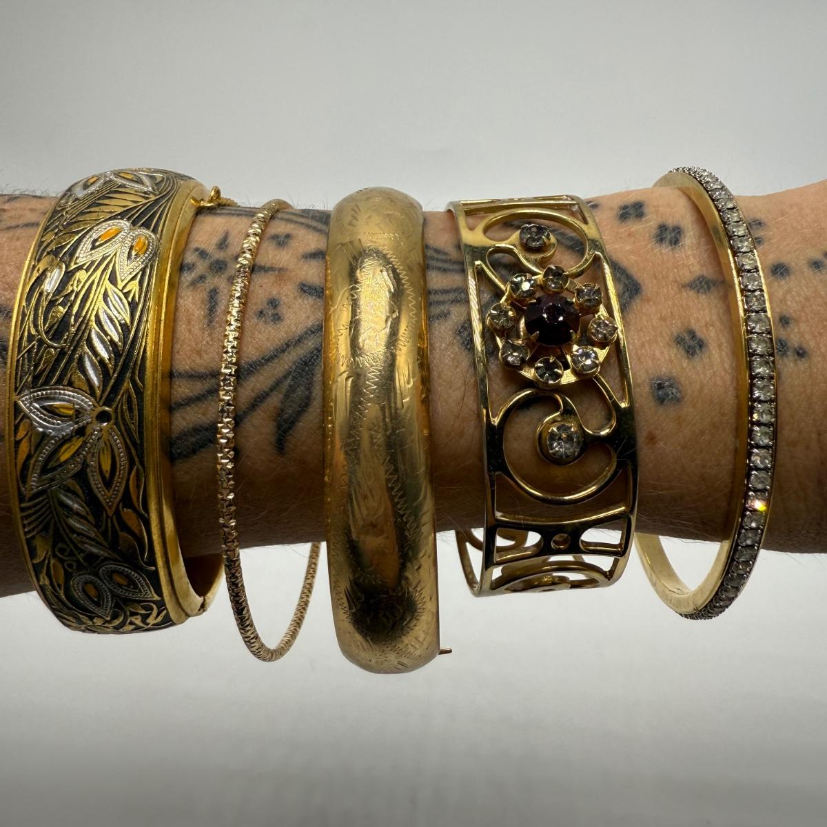Nine gold metal bracelets, eight of which are bangle style. The collection features bracelets with ornate designs and some gemstones. Brand name found on only one bracelet - Napier. Please see photos for inventory and details.
