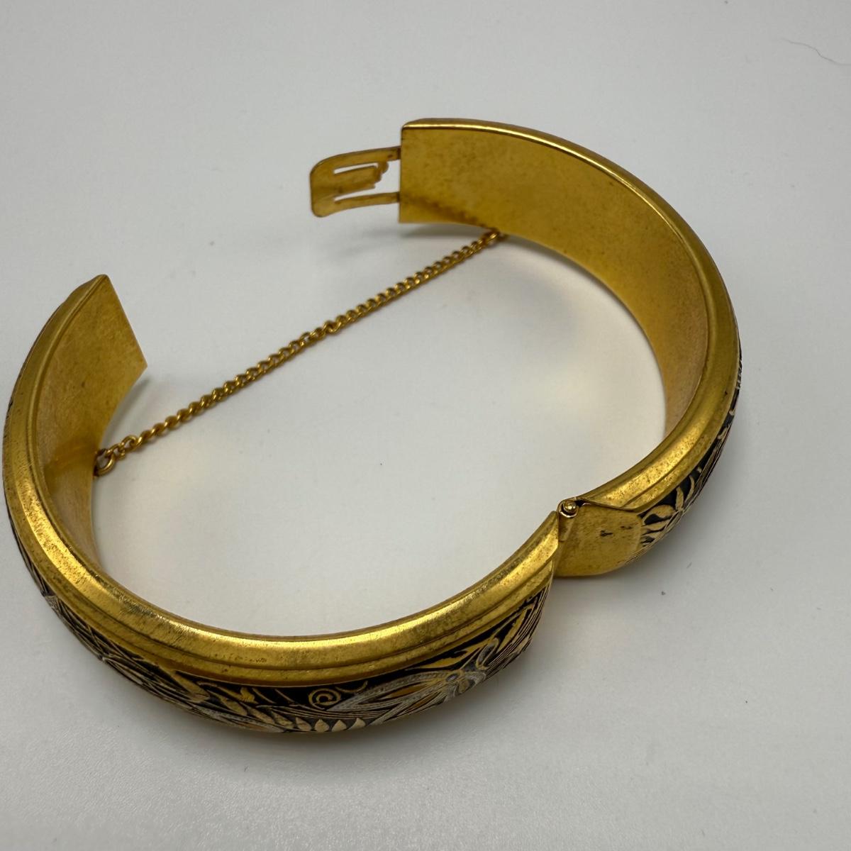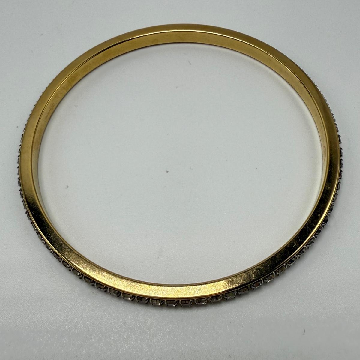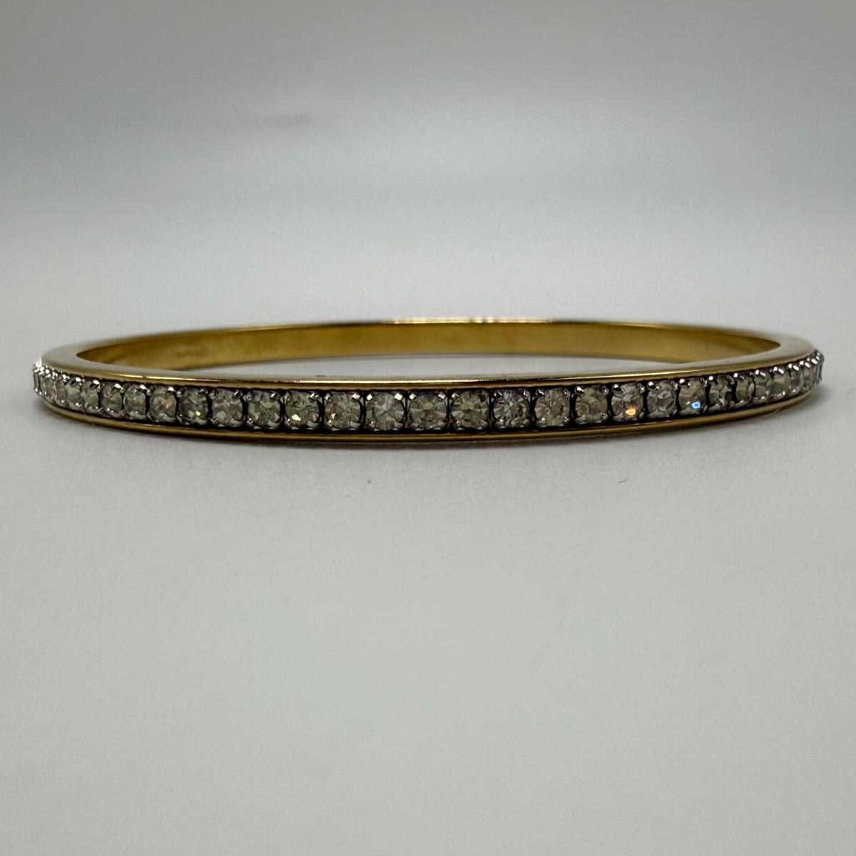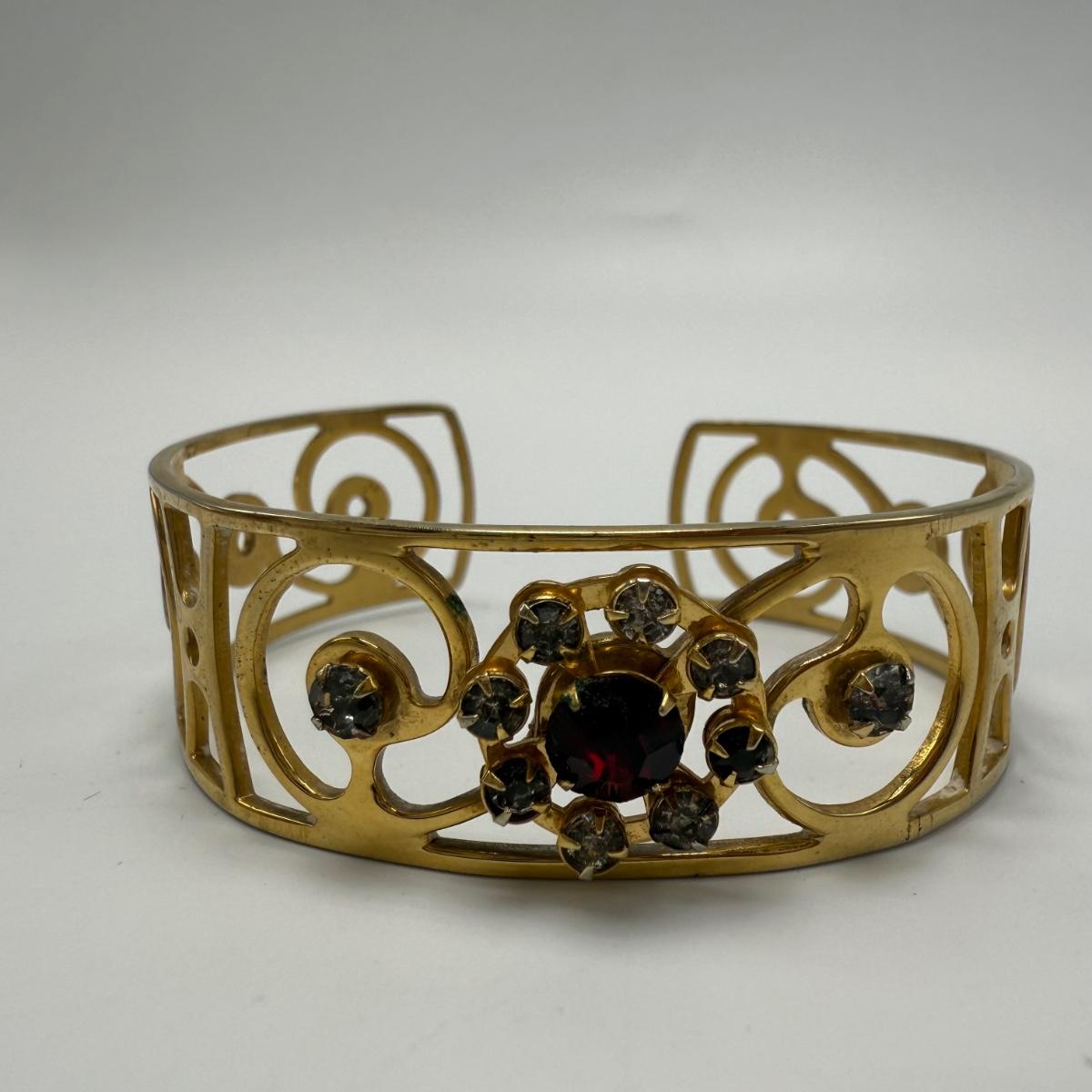 Nine gold metal bracelets, eight of which are bangle style. The collection features bracelets with ornate designs and some gemstones. Brand name found on only one bracelet - Napier. Please see photos for inventory and details.