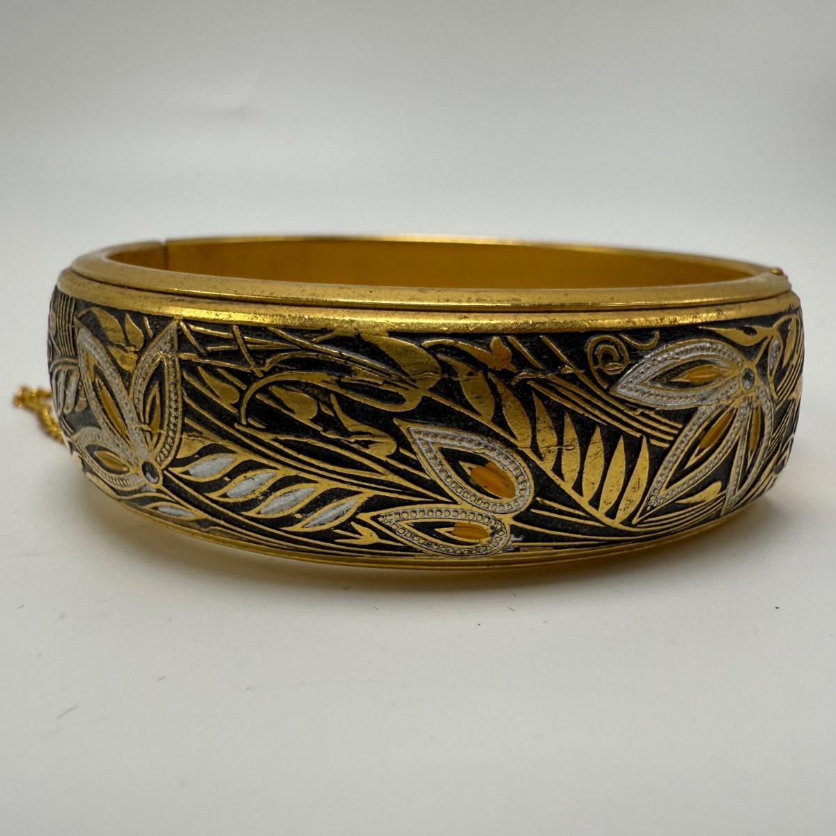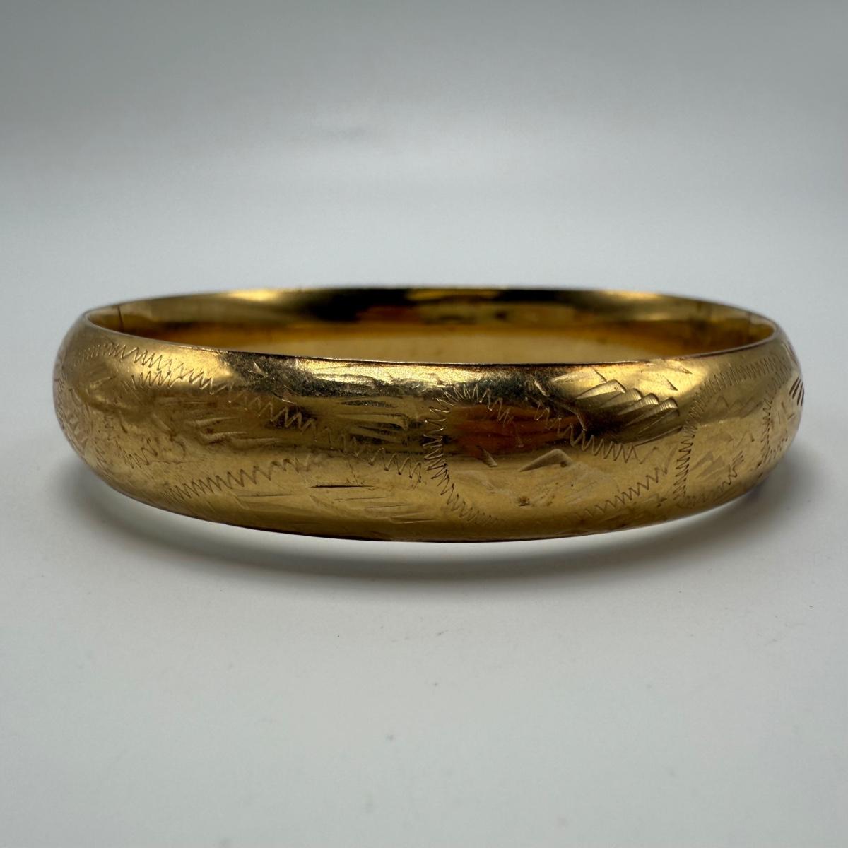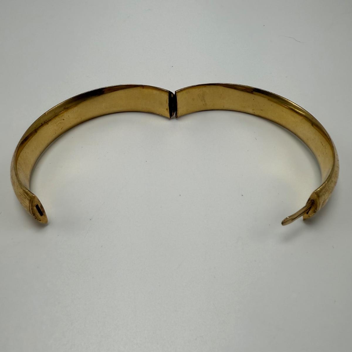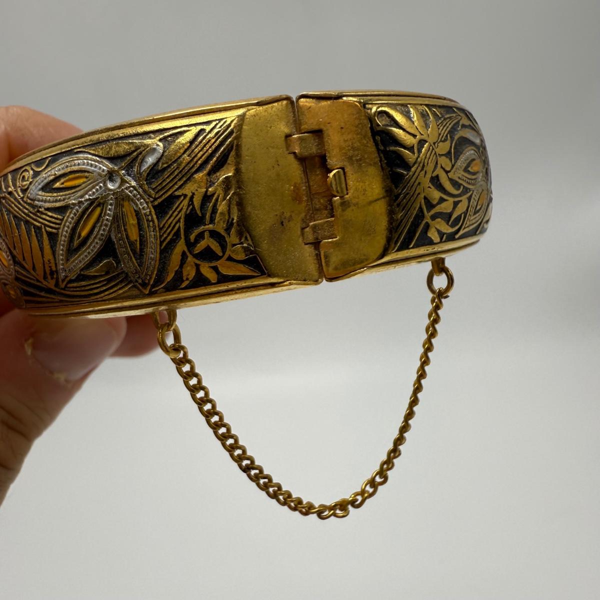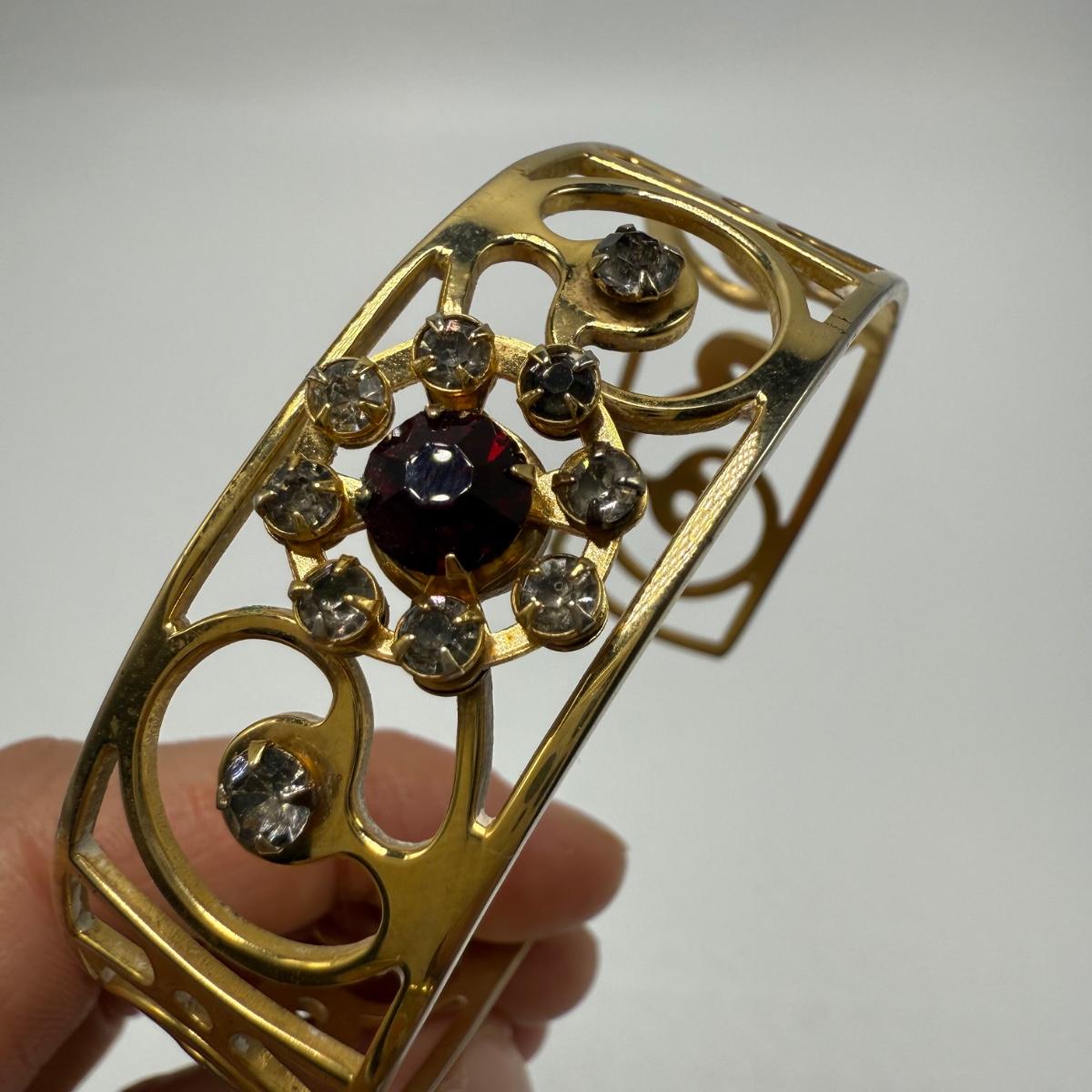 Nine gold metal bracelets, eight of which are bangle style. The collection features bracelets with ornate designs and some gemstones. Brand name found on only one bracelet - Napier. Please see photos for inventory and details.