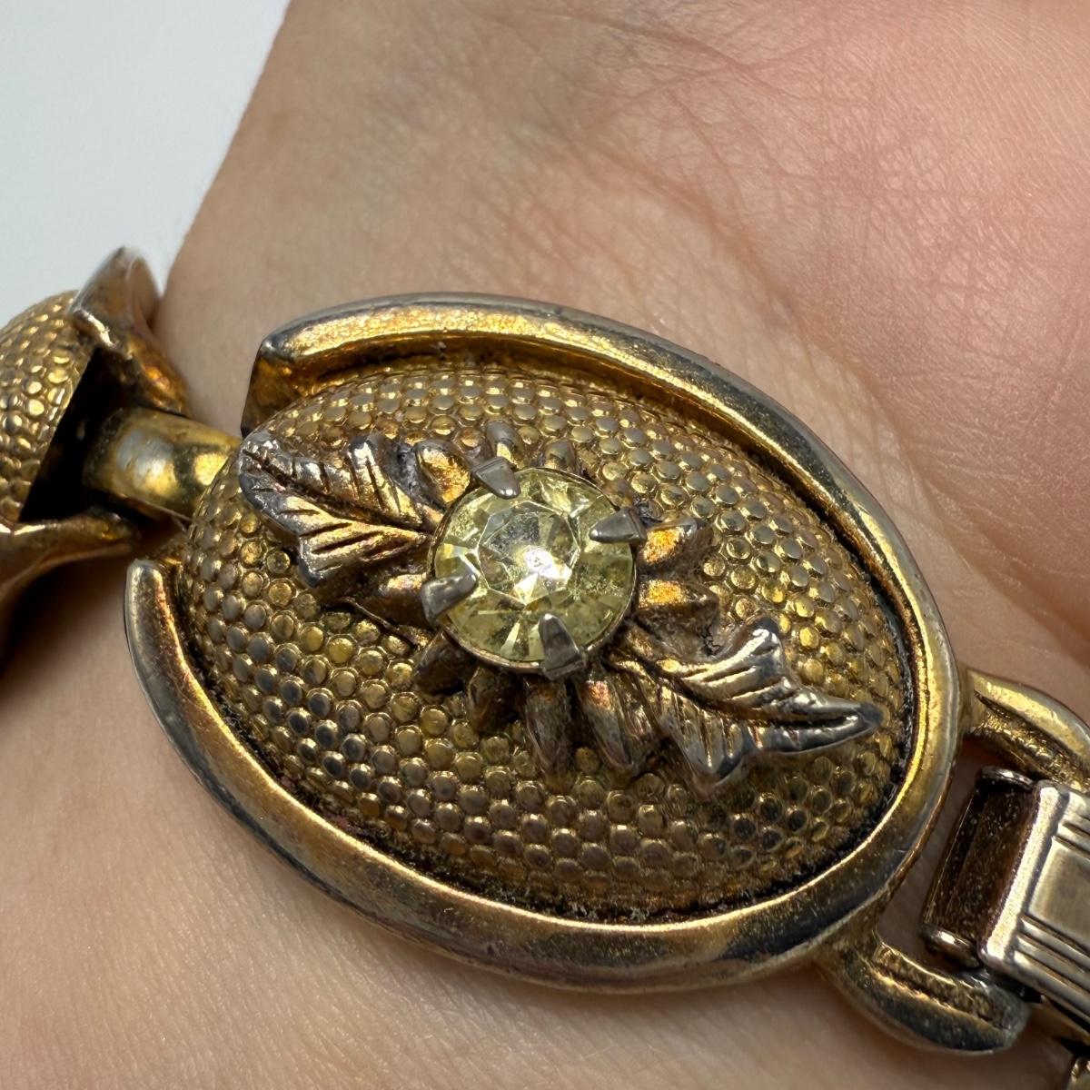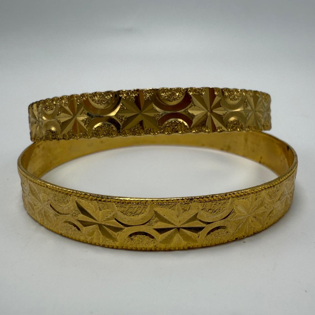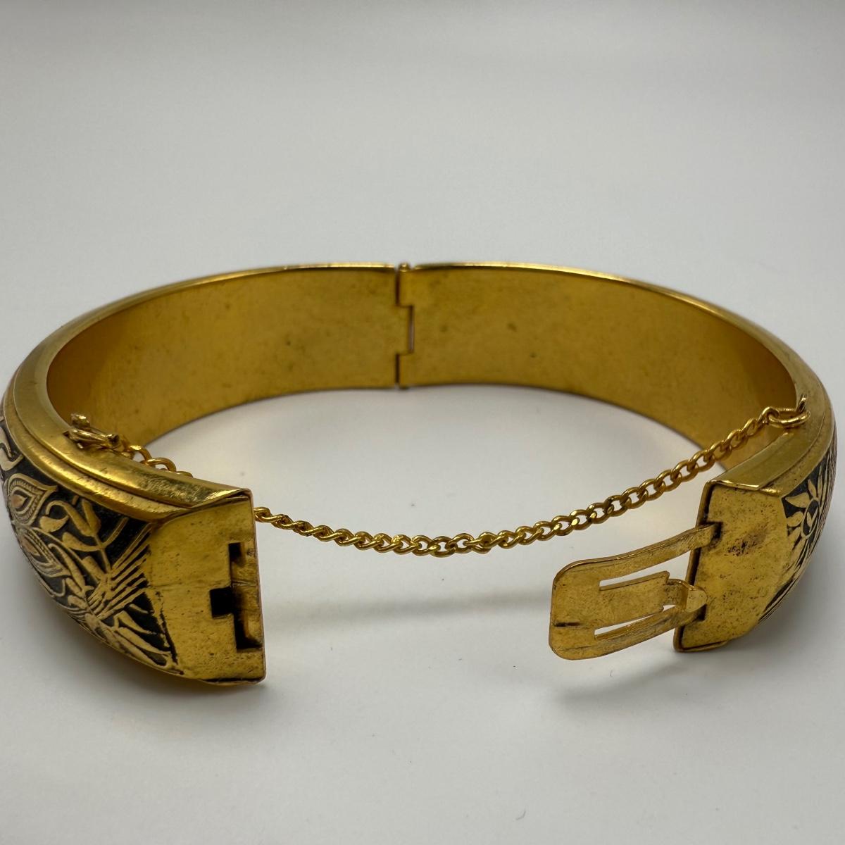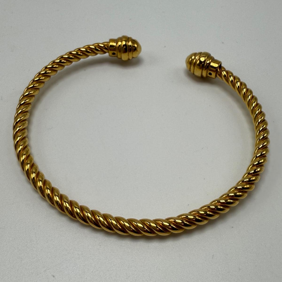 Nine gold metal bracelets, eight of which are bangle style. The collection features bracelets with ornate designs and some gemstones. Brand name found on only one bracelet - Napier. Please see photos for inventory and details.