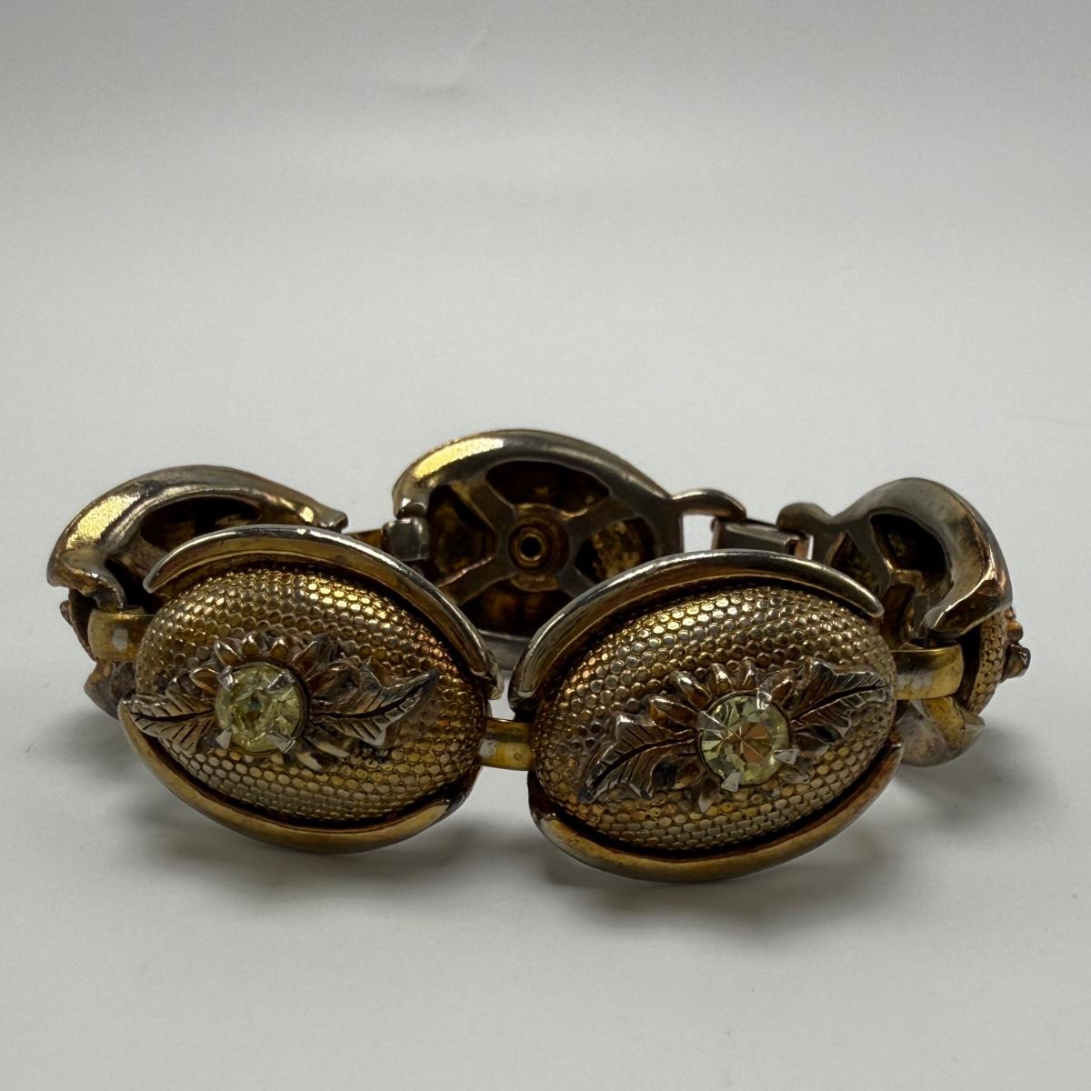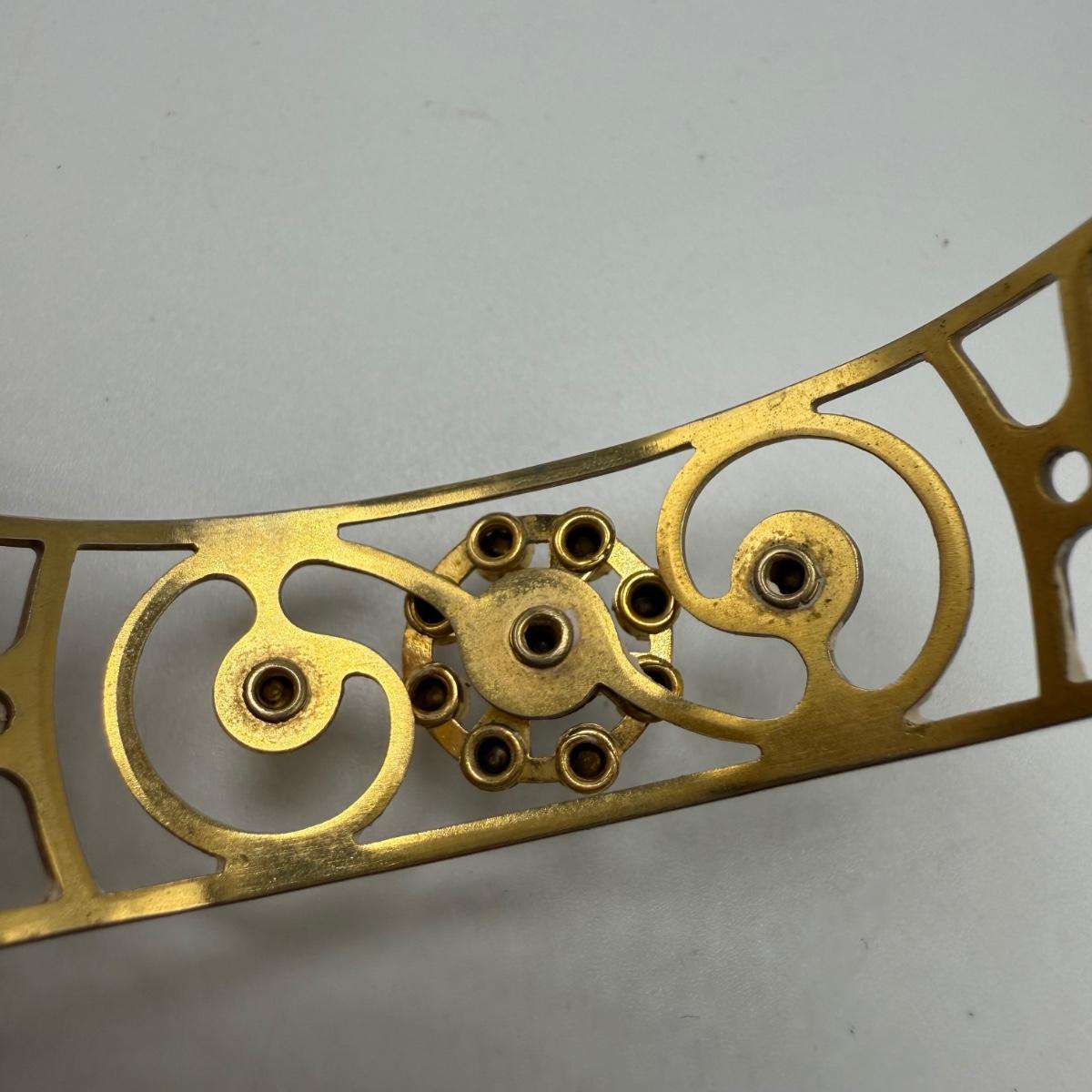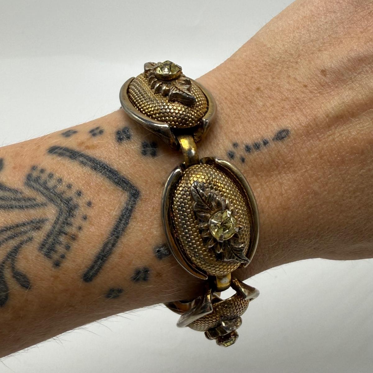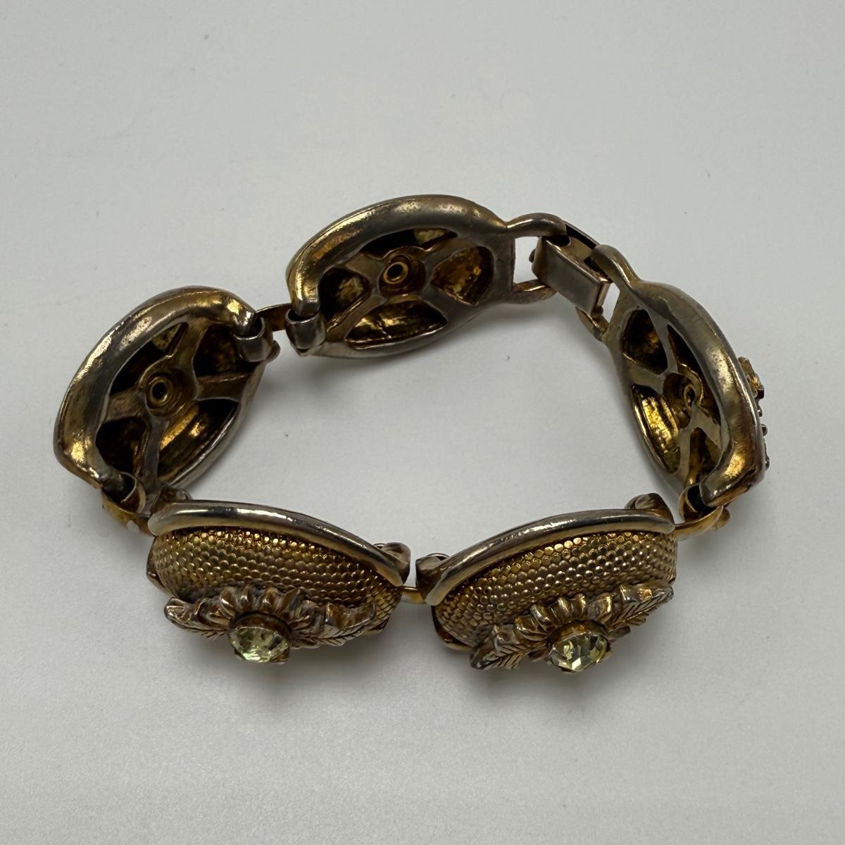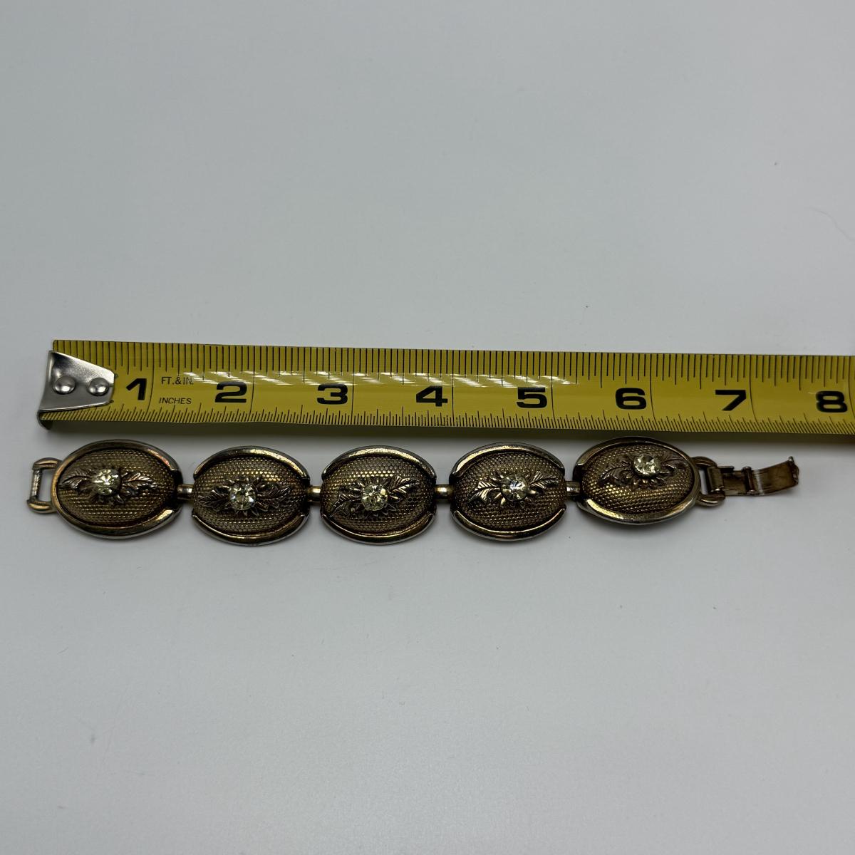 Nine gold metal bracelets, eight of which are bangle style. The collection features bracelets with ornate designs and some gemstones. Brand name found on only one bracelet - Napier. Please see photos for inventory and details.