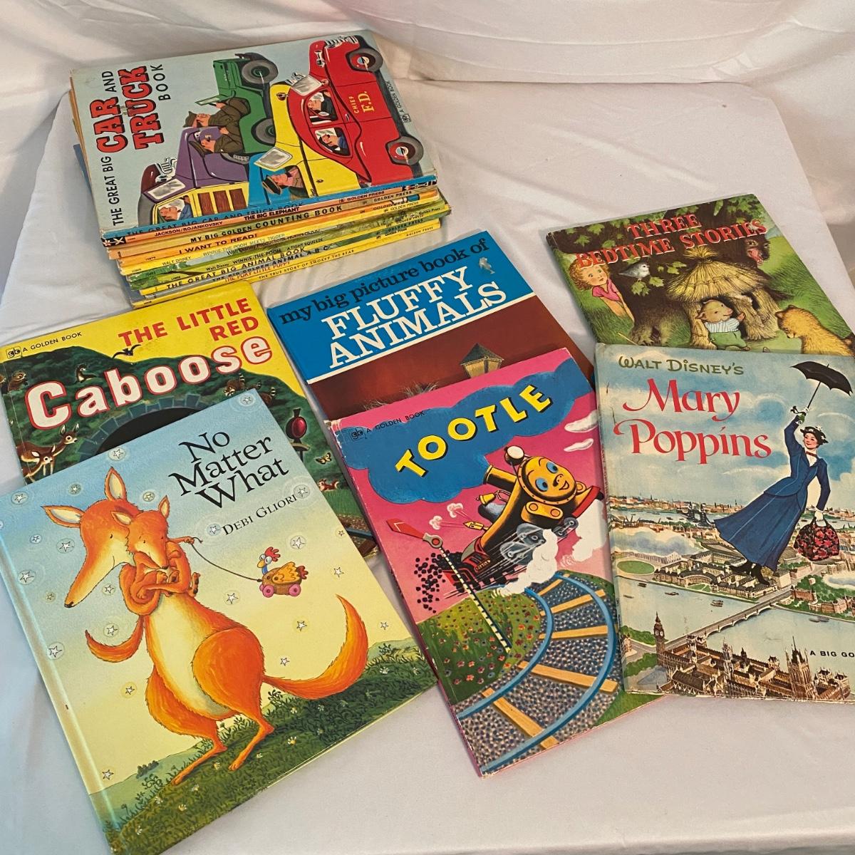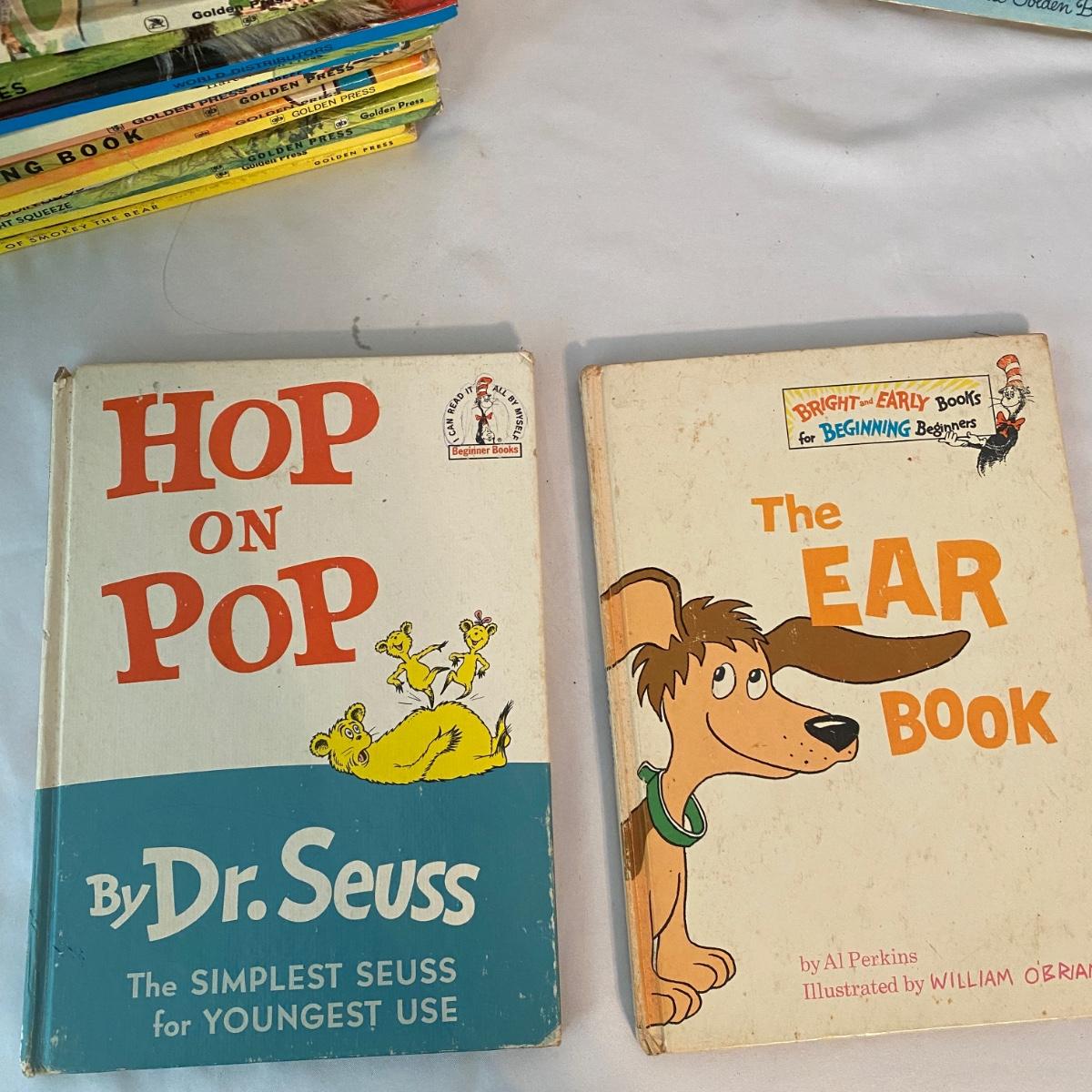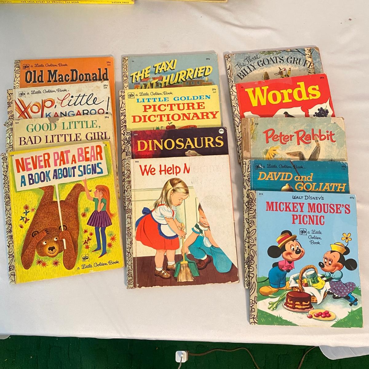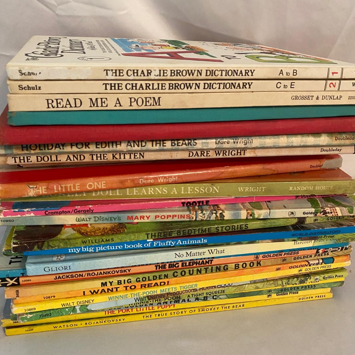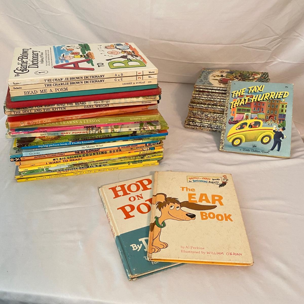 Great collection of 21 Vintage Golden Books. (Mostly from 70s/80s), 2 Dr. Seuss books (1960s) and 26 large hardcovers measuring approx 12.5” x 9” each. Lot includes Vol 1 & 2 of Charlie Brown Dictionary and 5 Books by Dare Wright. Two golden books have torn covers. Shipping available.