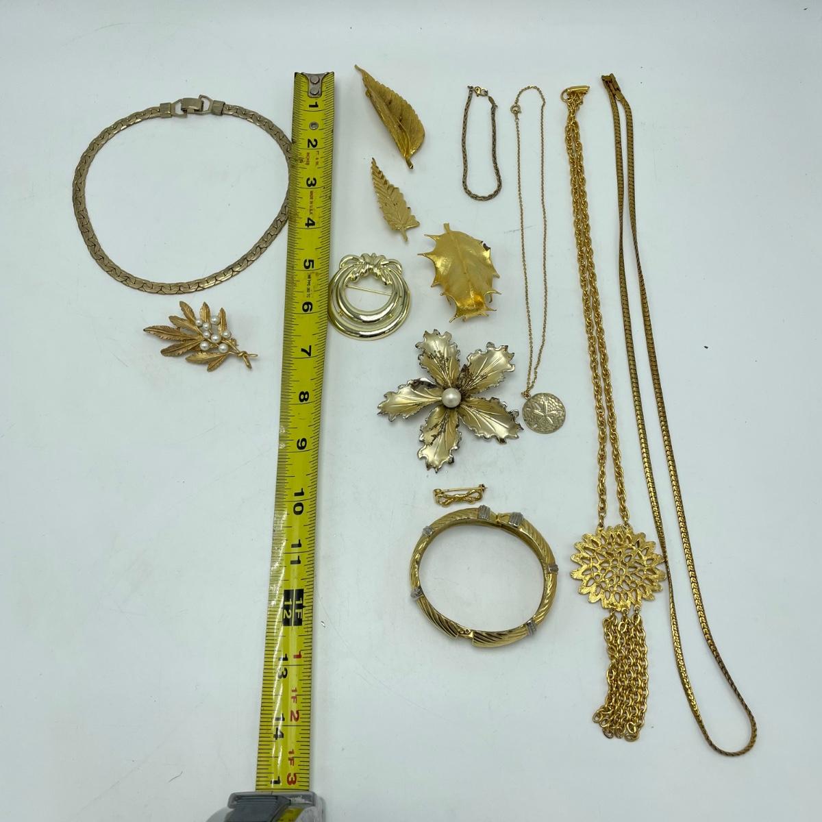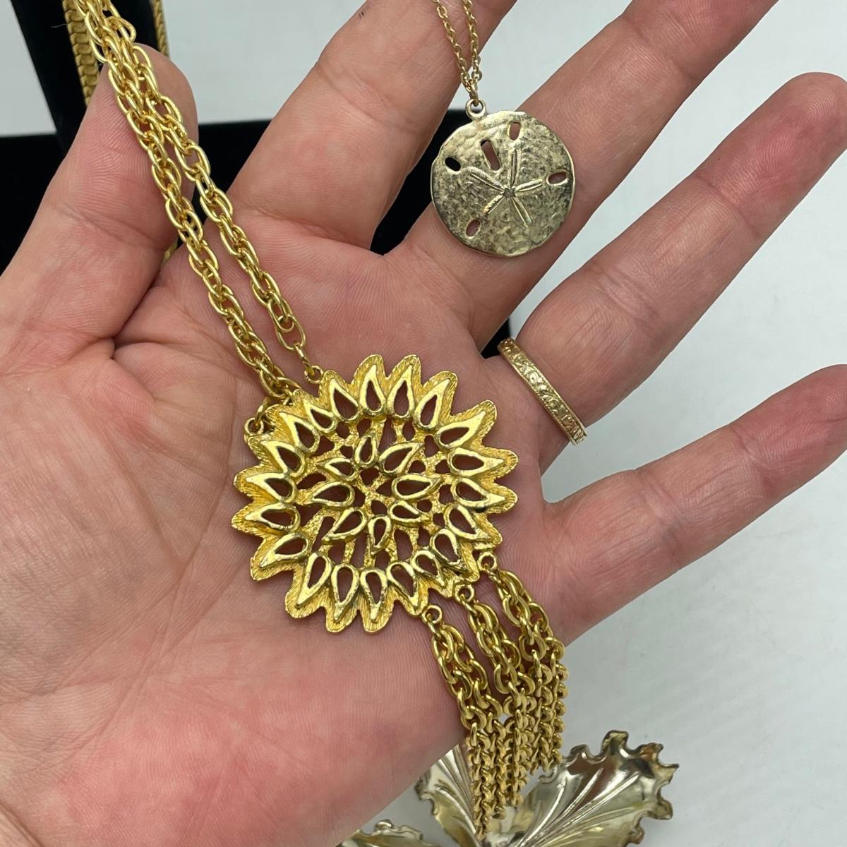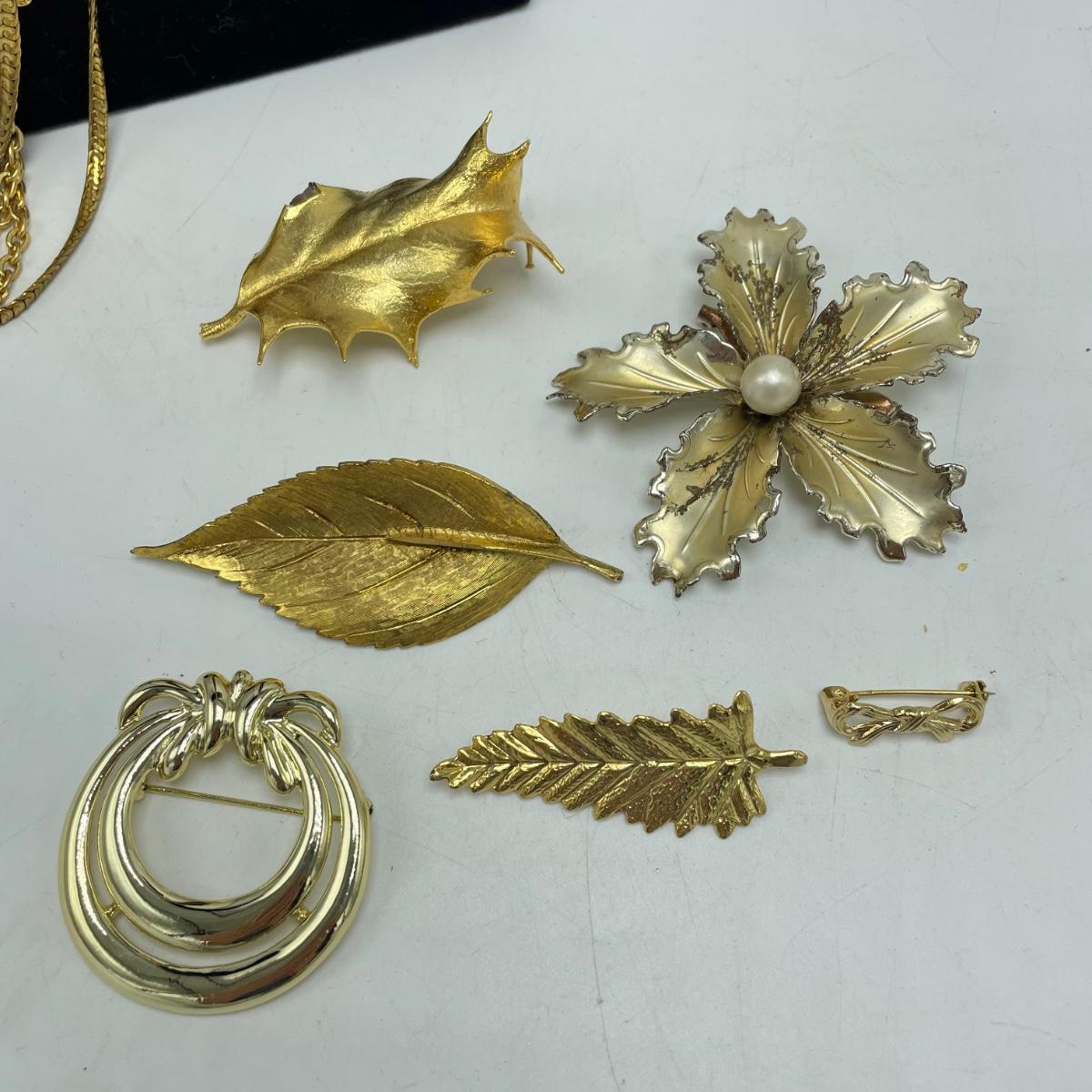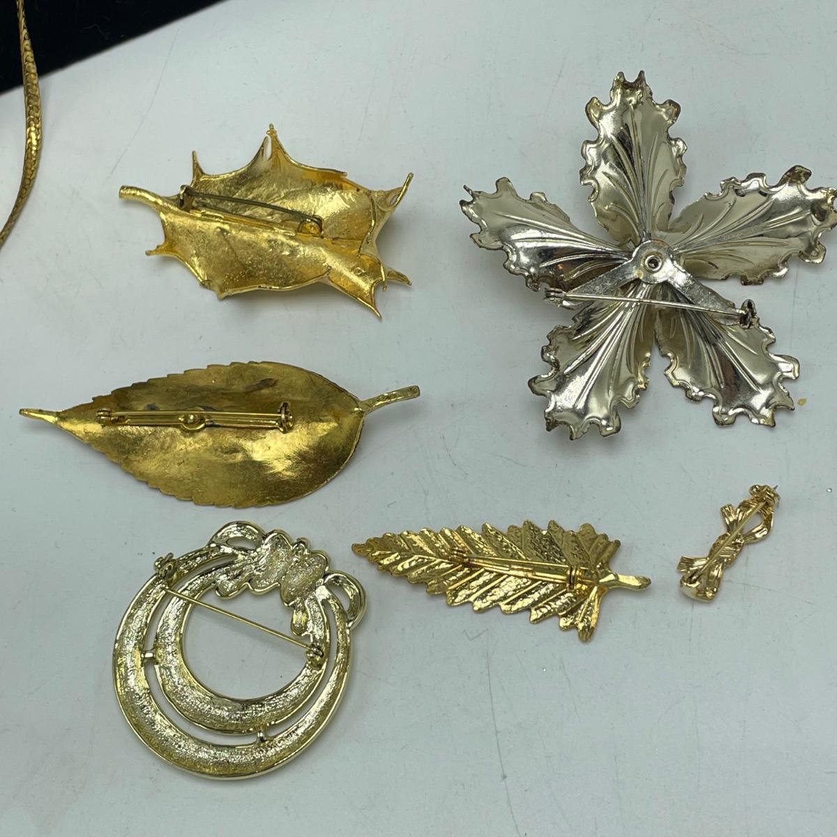 Four necklaces plus two bracelet (one by Monet) and seven brooches. The spiked leaf has small damage and the large flower shows a bit more age than the rest of the jewelry. The longest chain is about 29”. See images. Shipping available.