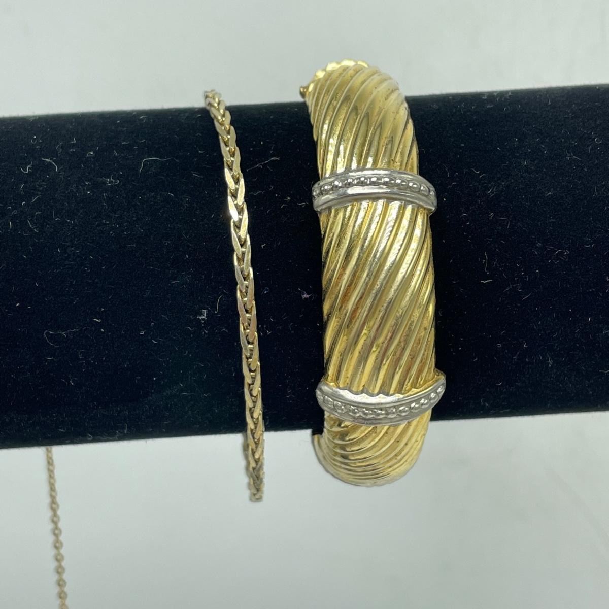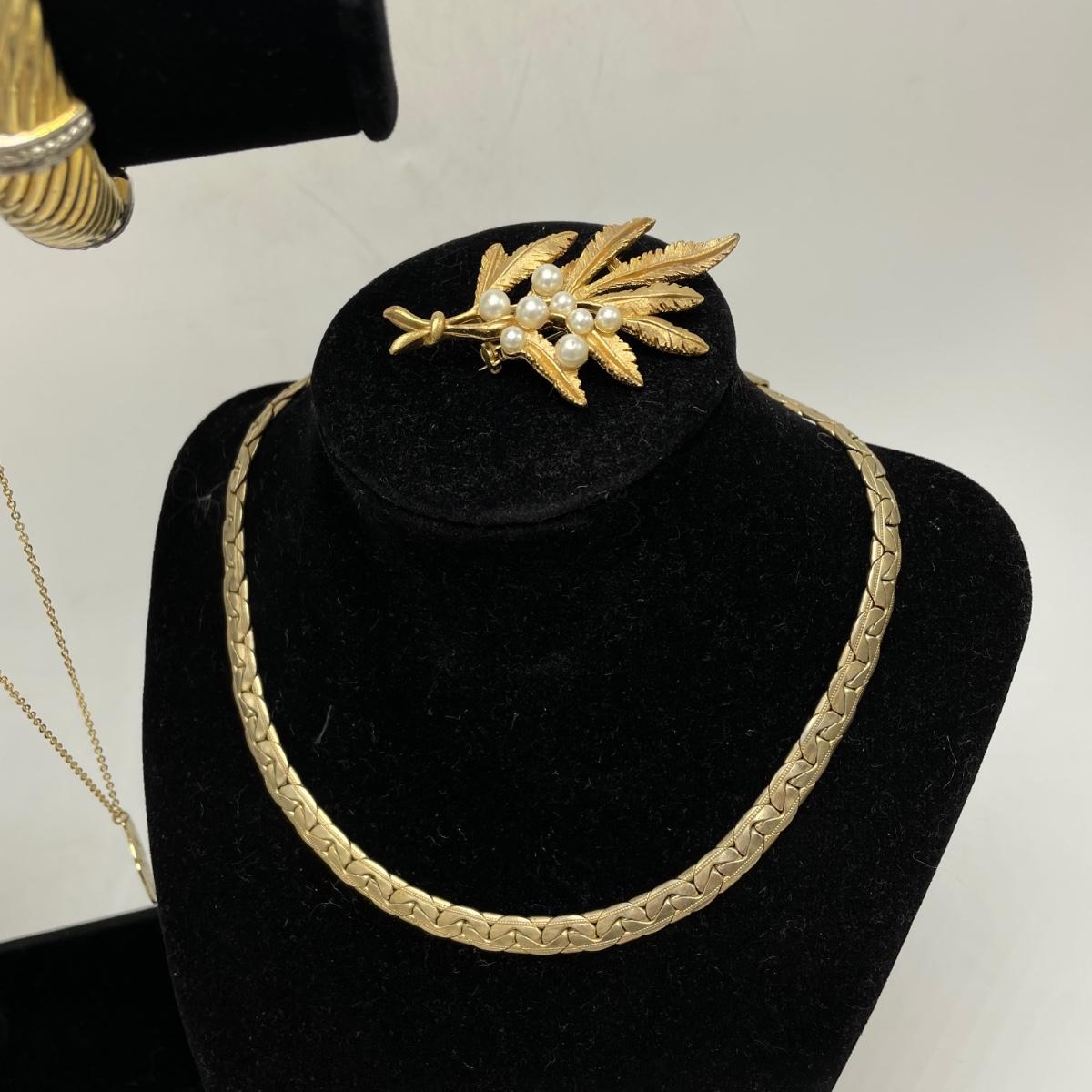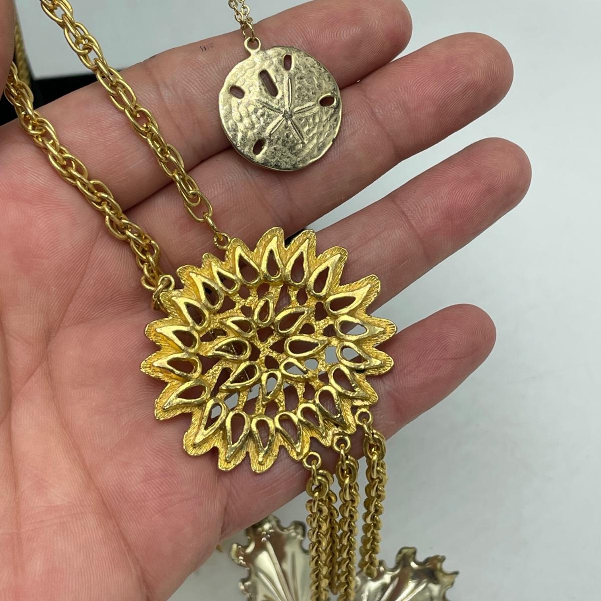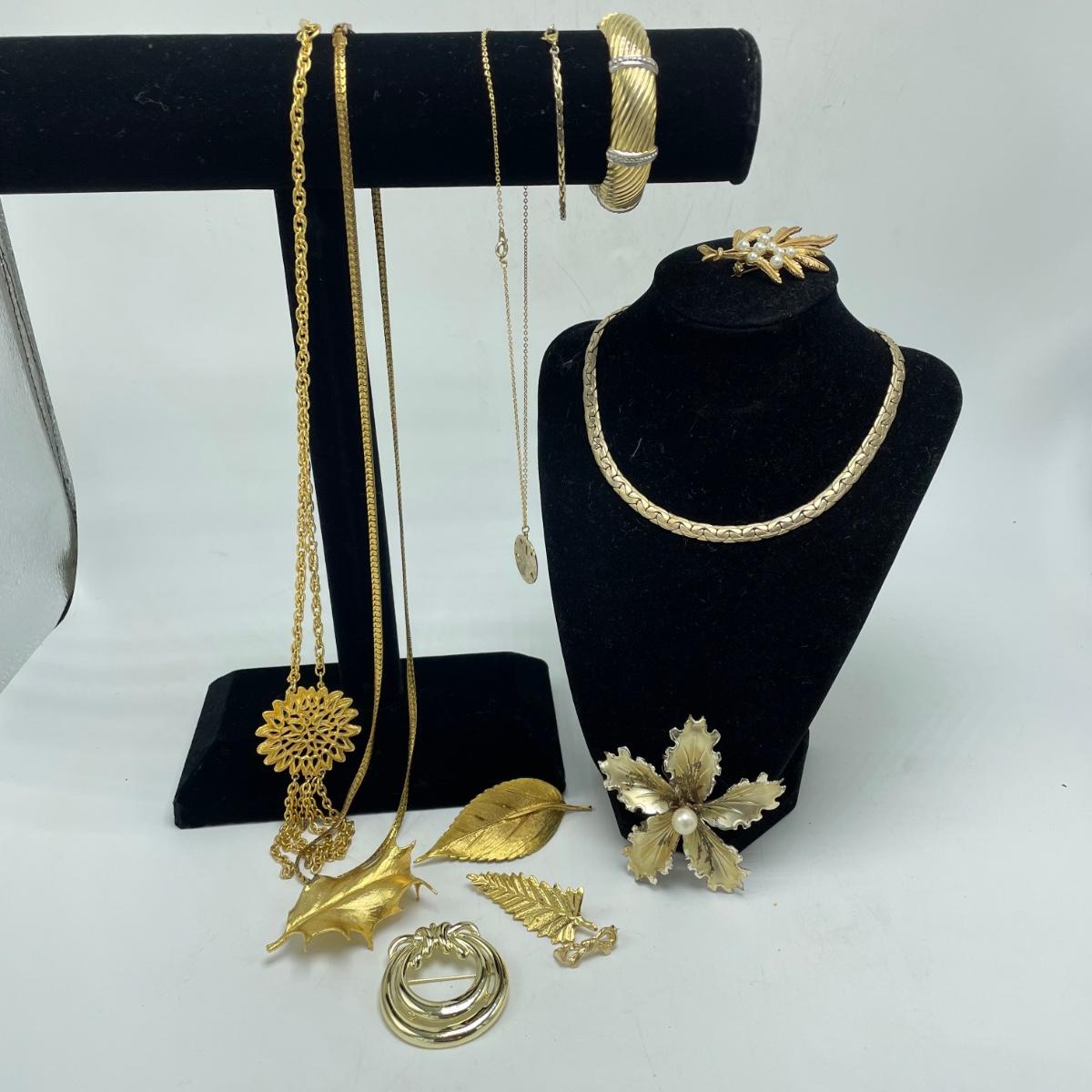 Four necklaces plus two bracelet (one by Monet) and seven brooches. The spiked leaf has small damage and the large flower shows a bit more age than the rest of the jewelry. The longest chain is about 29”. See images. Shipping available.