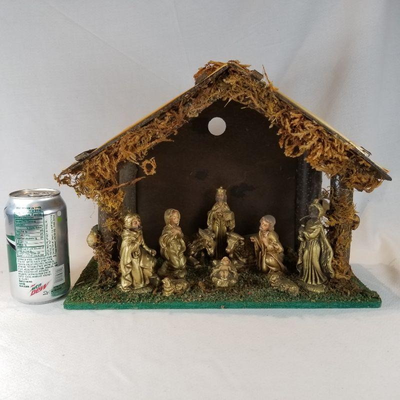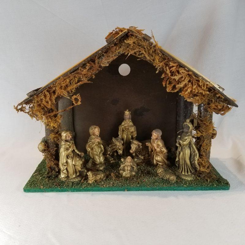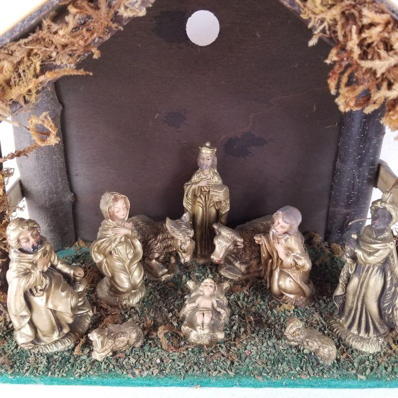 This all in one nativity set is ready to go home. All the pieces are glued onto the manger and are in a gold tone. Stable is wood and has a hole in back for a light if you wish. Would make a nice night light for a child's room during the holidays. All in very good condition.