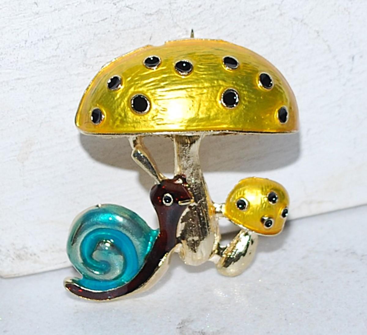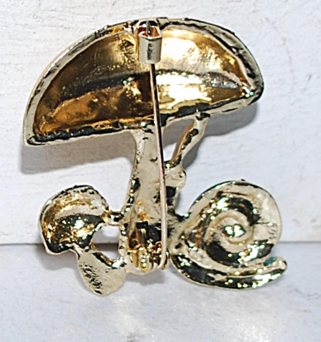 GOLDEN MUSHROOM BROOCH (1½" x 1¾") with BLUE & RED SNAIL on a Gold Tone Setting