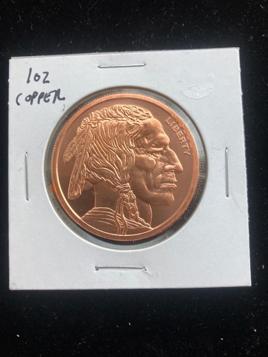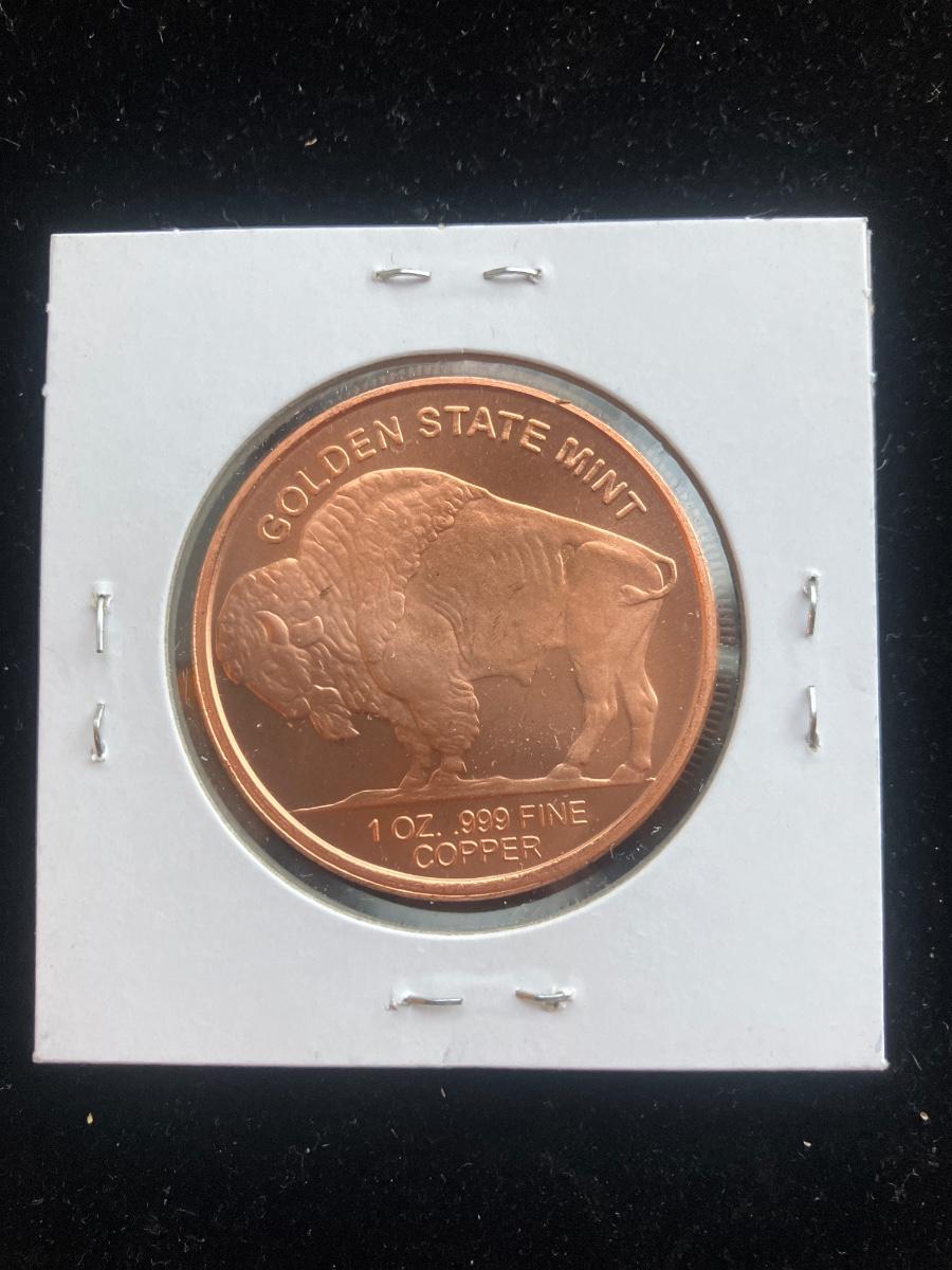 This is a privately issued 1-ounce pure copper bullion round from Golden State Mint (California) featuring the classic Buffalo Nickel design (James Earle Fraser’s Indian Head obverse and American Bison reverse).
