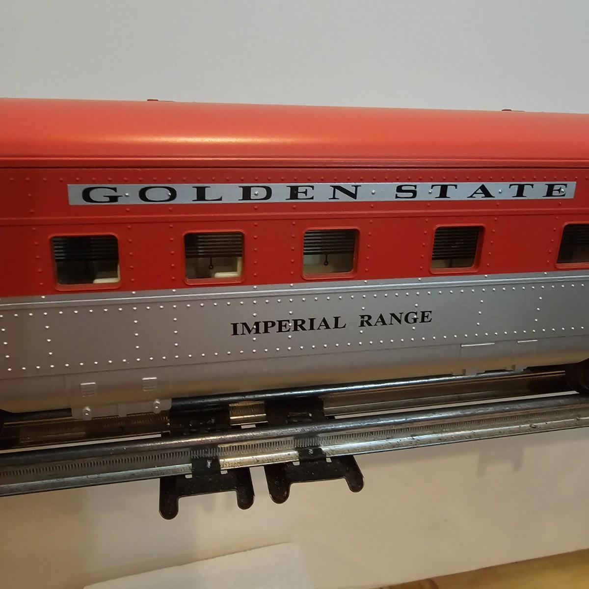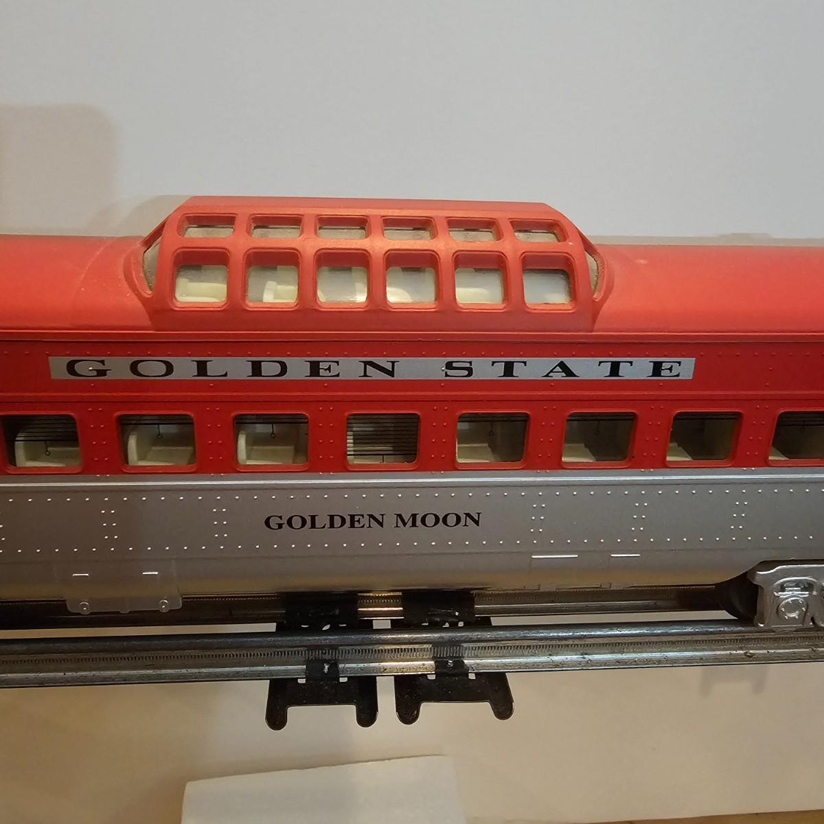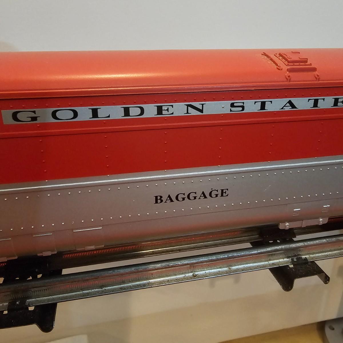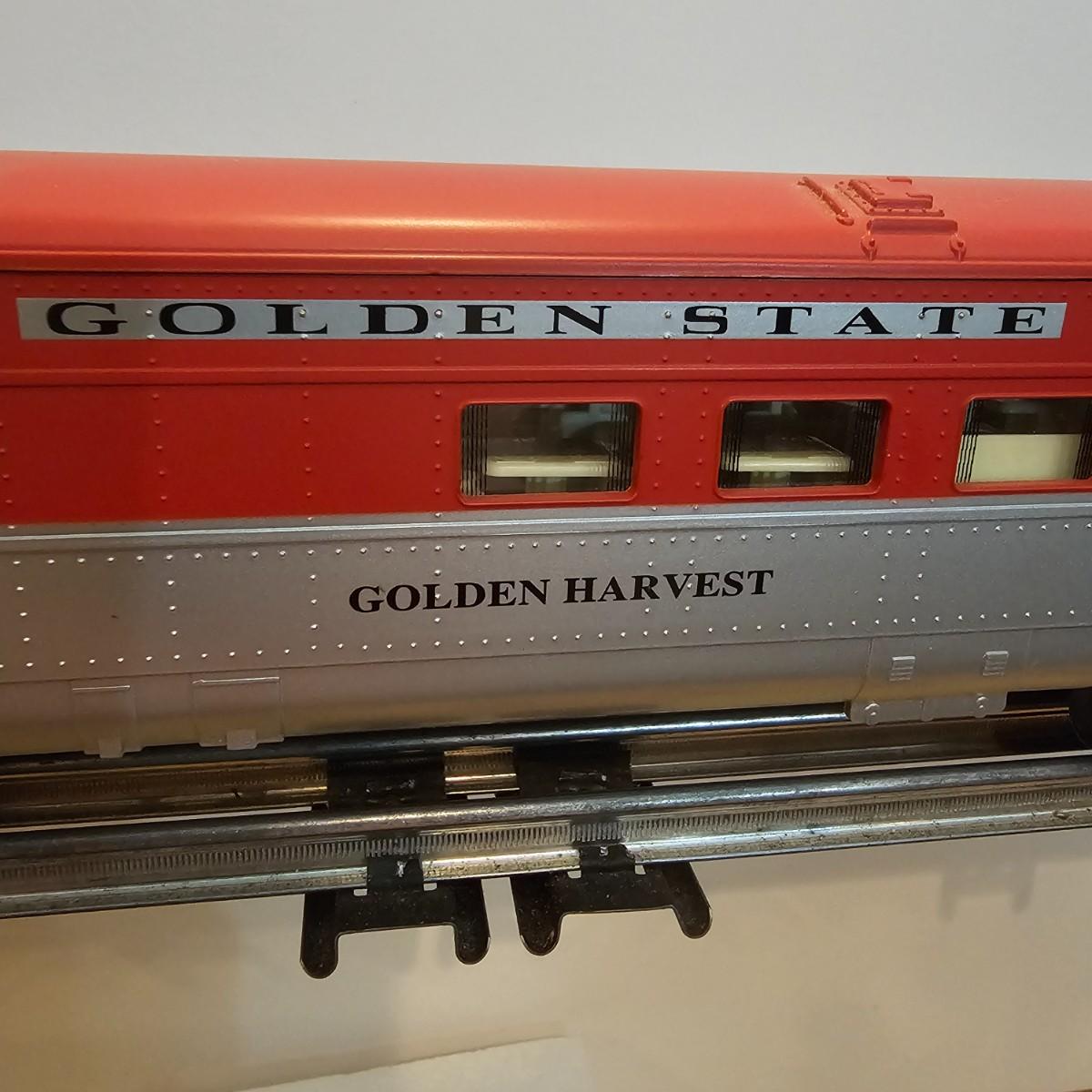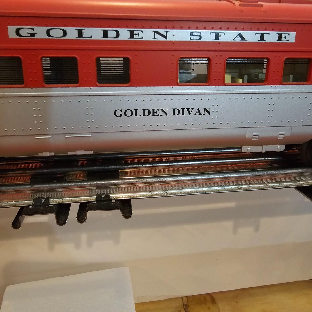 Eight Golden State passengers cars by K-Line. Cars all have red/silver color scheme, come with original boxes. Baggage car, observation car, vista dome and more. All cars have detailed interiors and lighting, all tested working. Standard die-cast couplers. Approximate full train length is 108". See photos for details. Shipping available. Please note that any price tag seen on an item was not put there by Sterling Transitions and does not reflect the current value of the item. Any train tracks shown in photos are not included but are available in another lot in this sale.