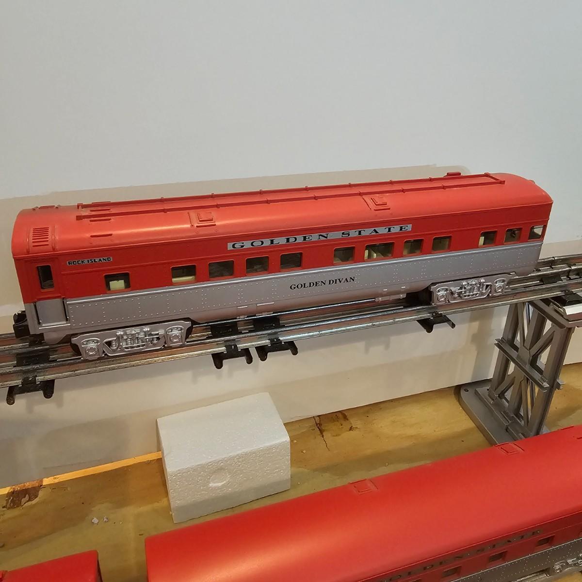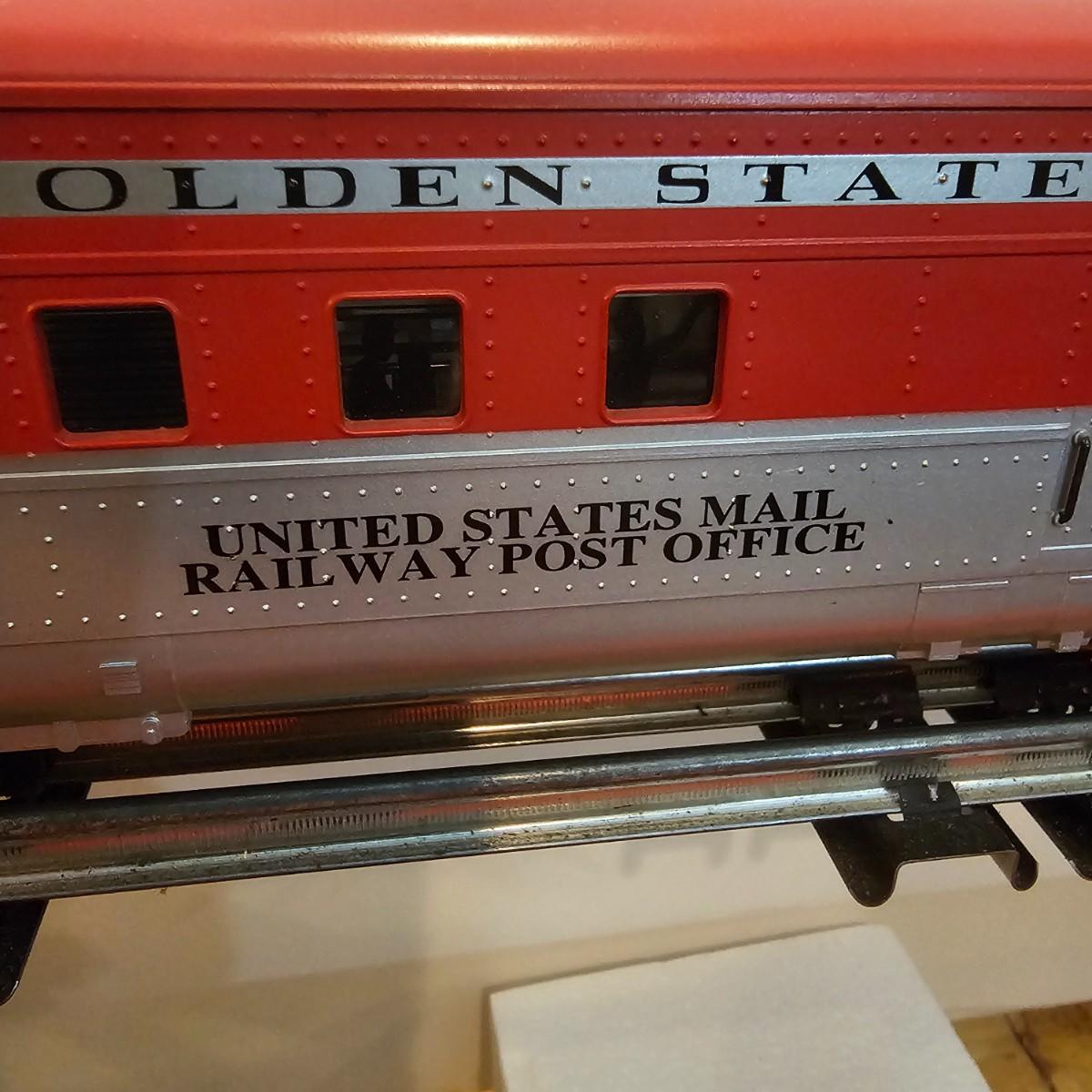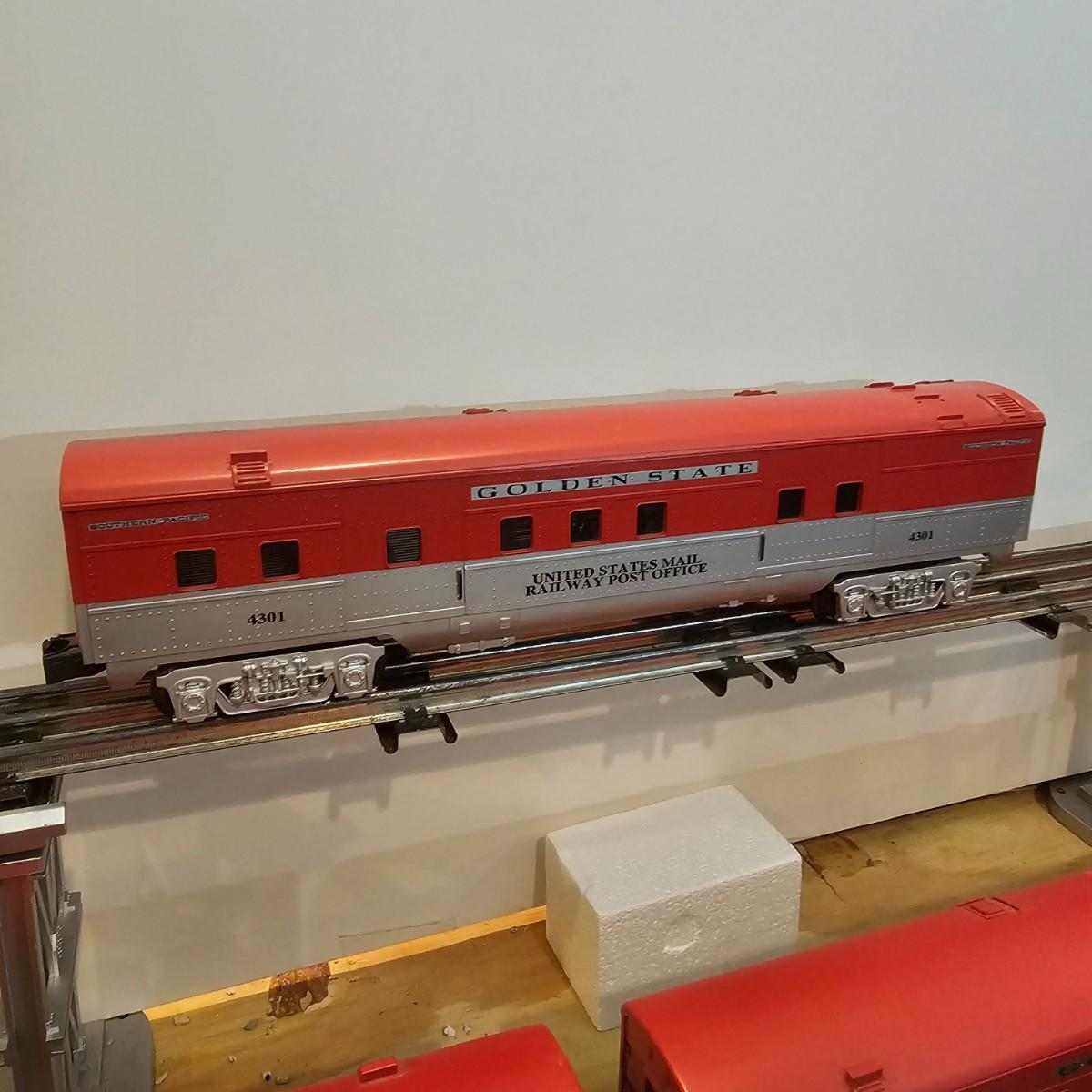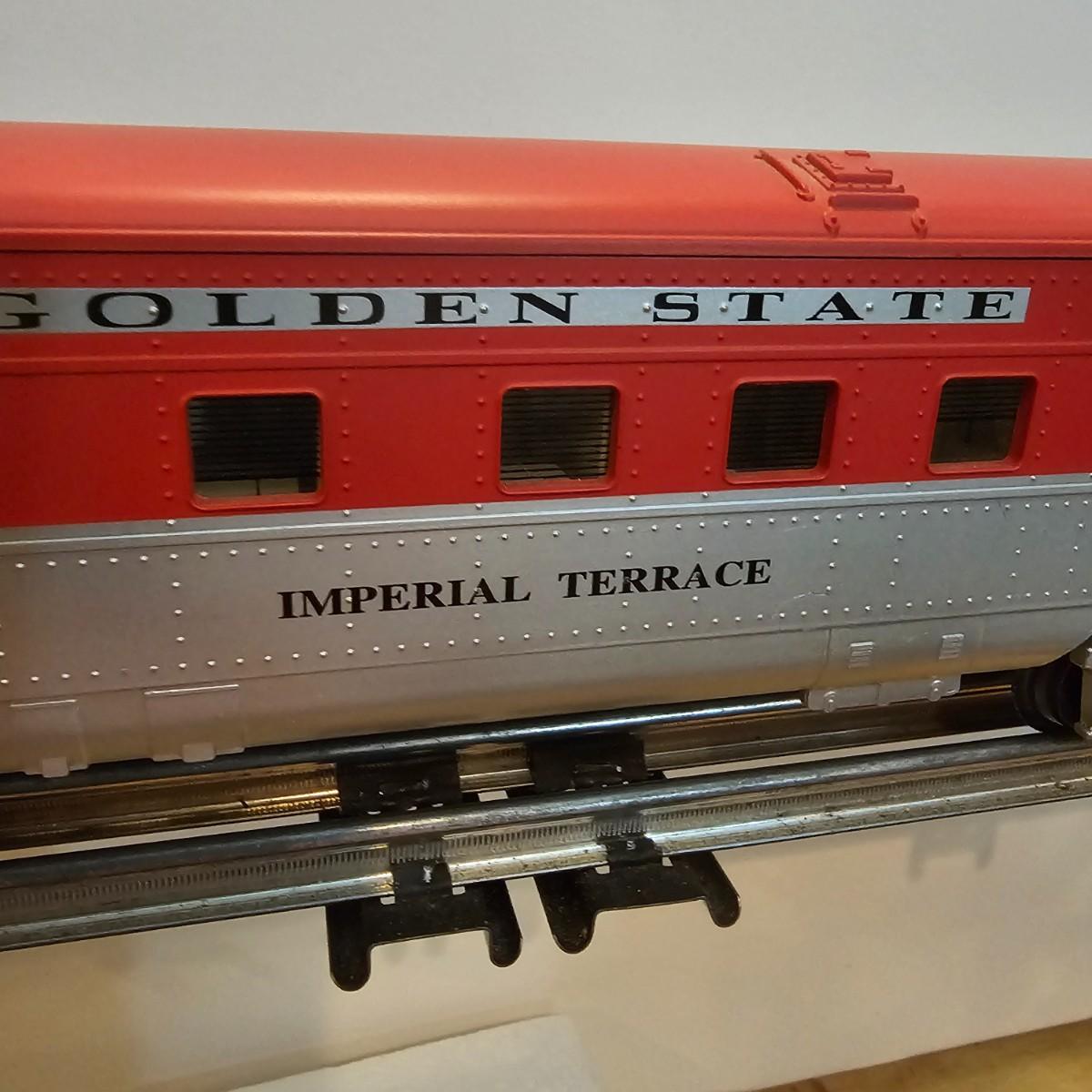 Eight Golden State passengers cars by K-Line. Cars all have red/silver color scheme, come with original boxes. Baggage car, observation car, vista dome and more. All cars have detailed interiors and lighting, all tested working. Standard die-cast couplers. Approximate full train length is 108". See photos for details. Shipping available. Please note that any price tag seen on an item was not put there by Sterling Transitions and does not reflect the current value of the item. Any train tracks shown in photos are not included but are available in another lot in this sale.