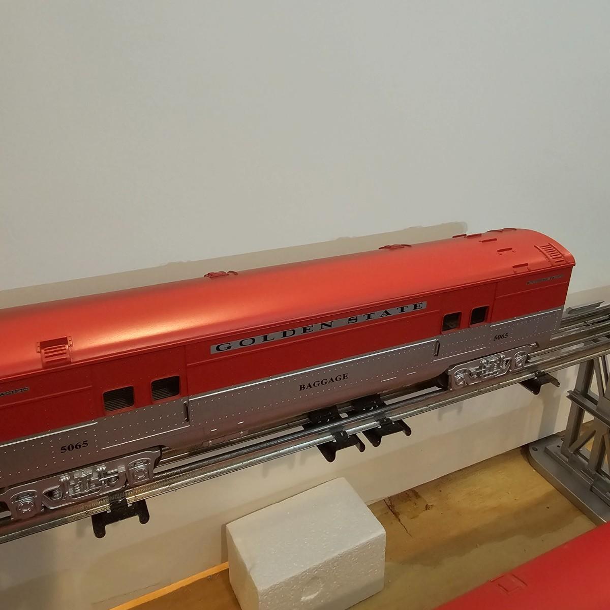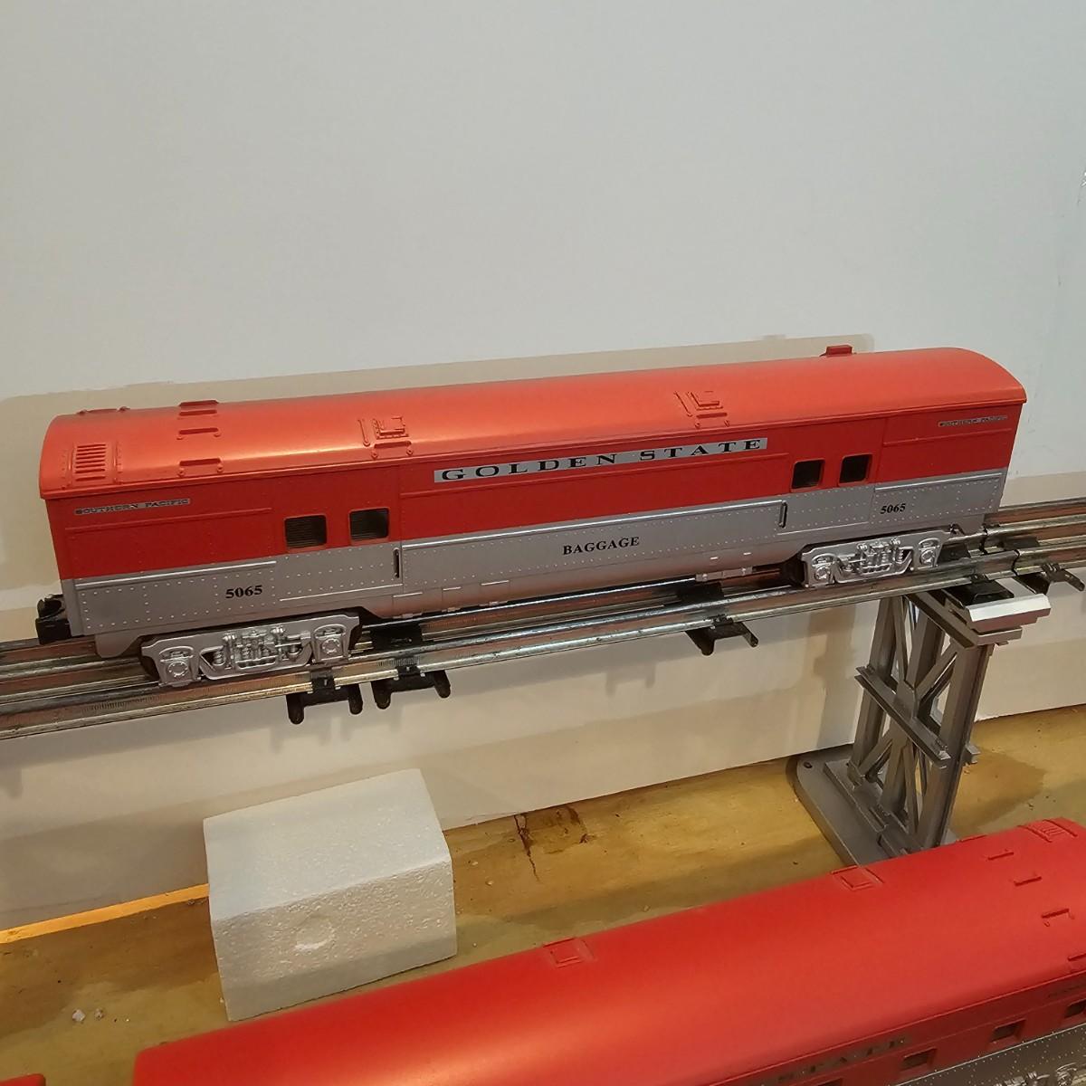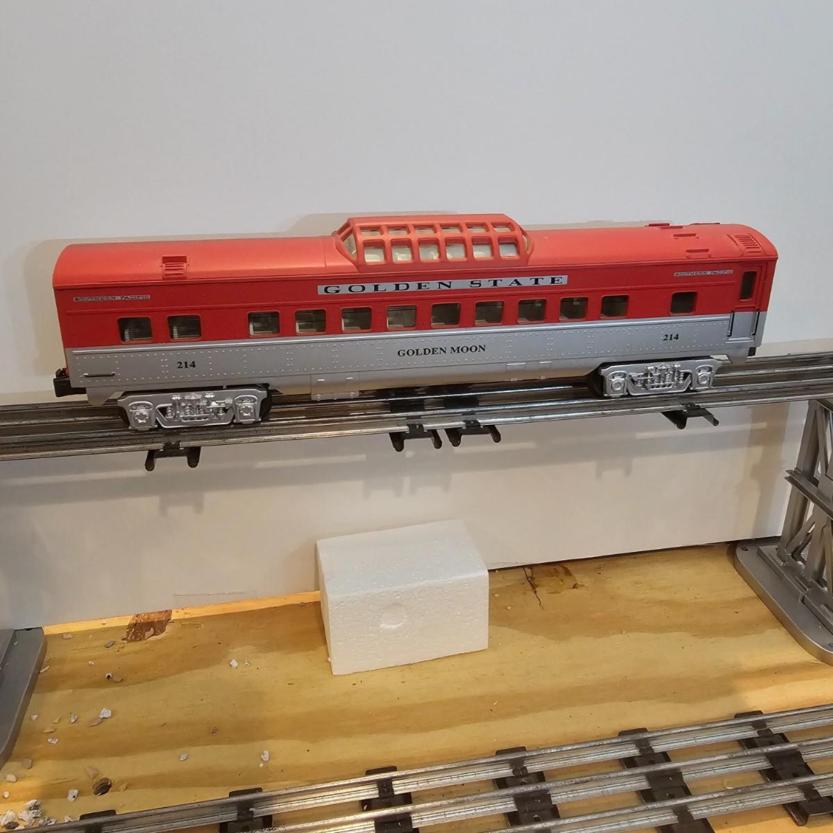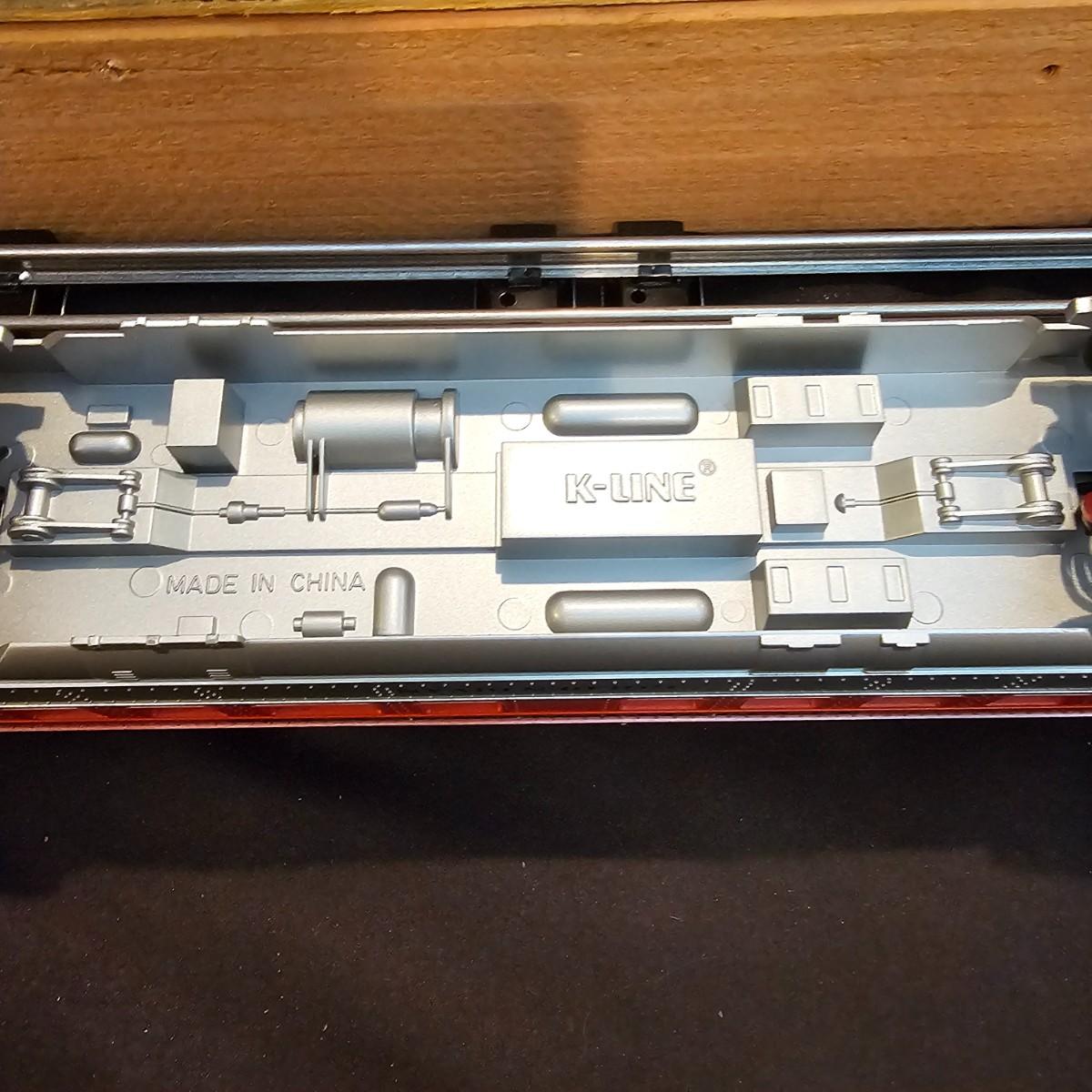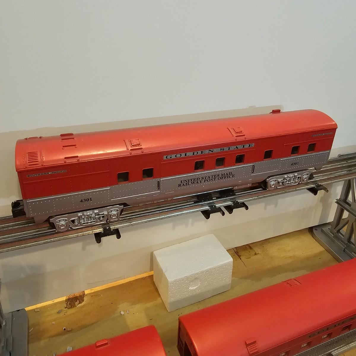 Eight Golden State passengers cars by K-Line. Cars all have red/silver color scheme, come with original boxes. Baggage car, observation car, vista dome and more. All cars have detailed interiors and lighting, all tested working. Standard die-cast couplers. Approximate full train length is 108". See photos for details. Shipping available. Please note that any price tag seen on an item was not put there by Sterling Transitions and does not reflect the current value of the item. Any train tracks shown in photos are not included but are available in another lot in this sale.