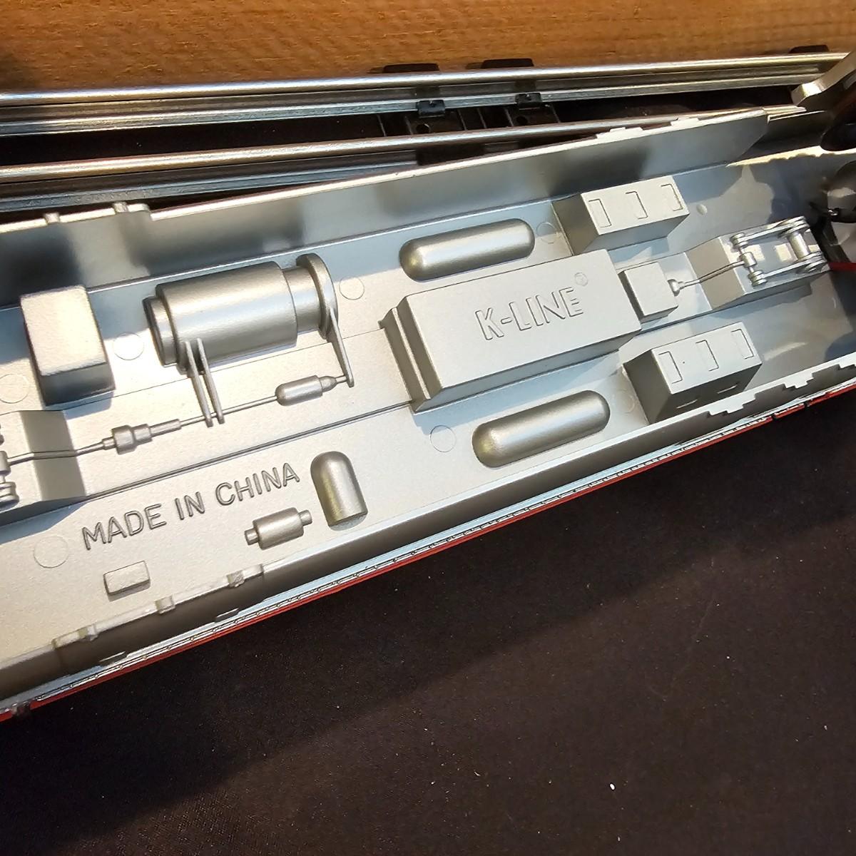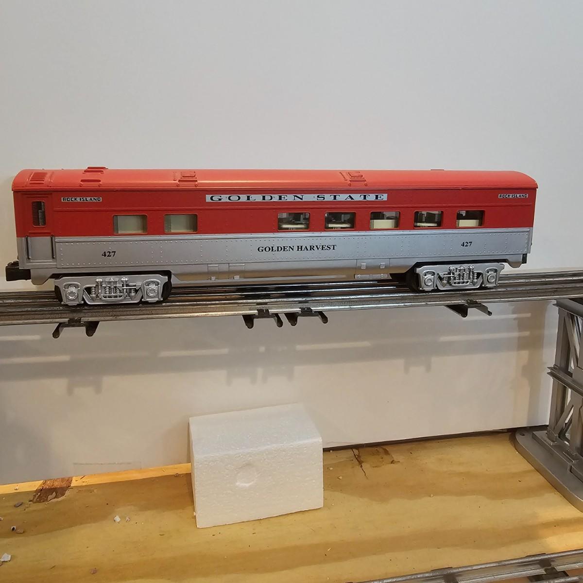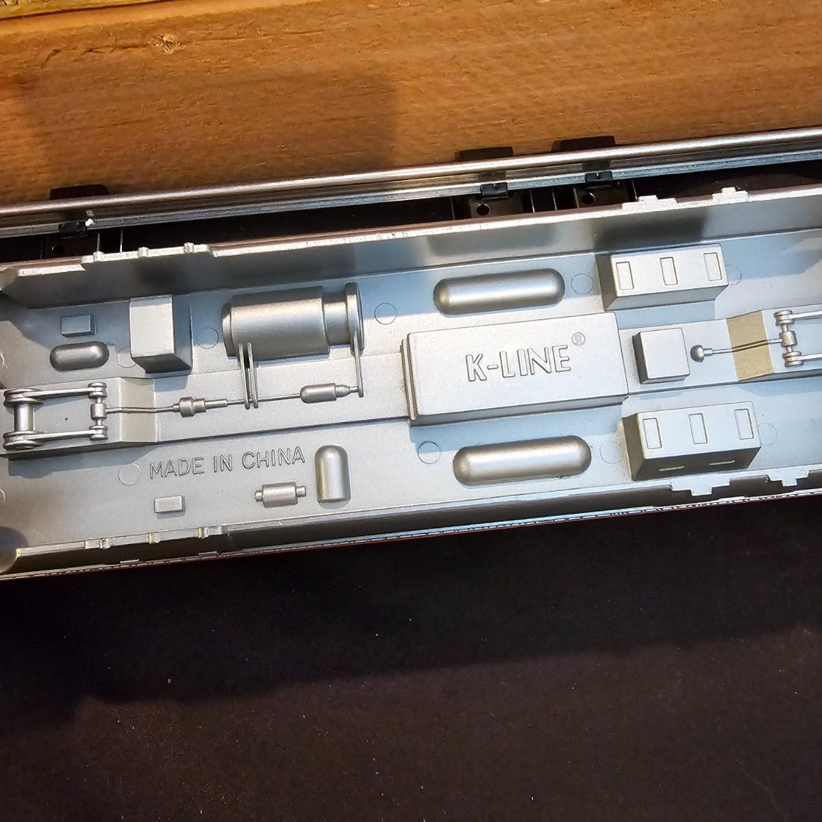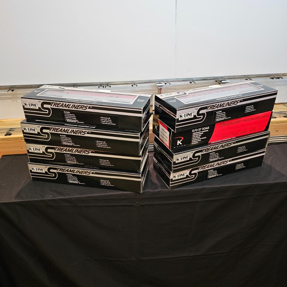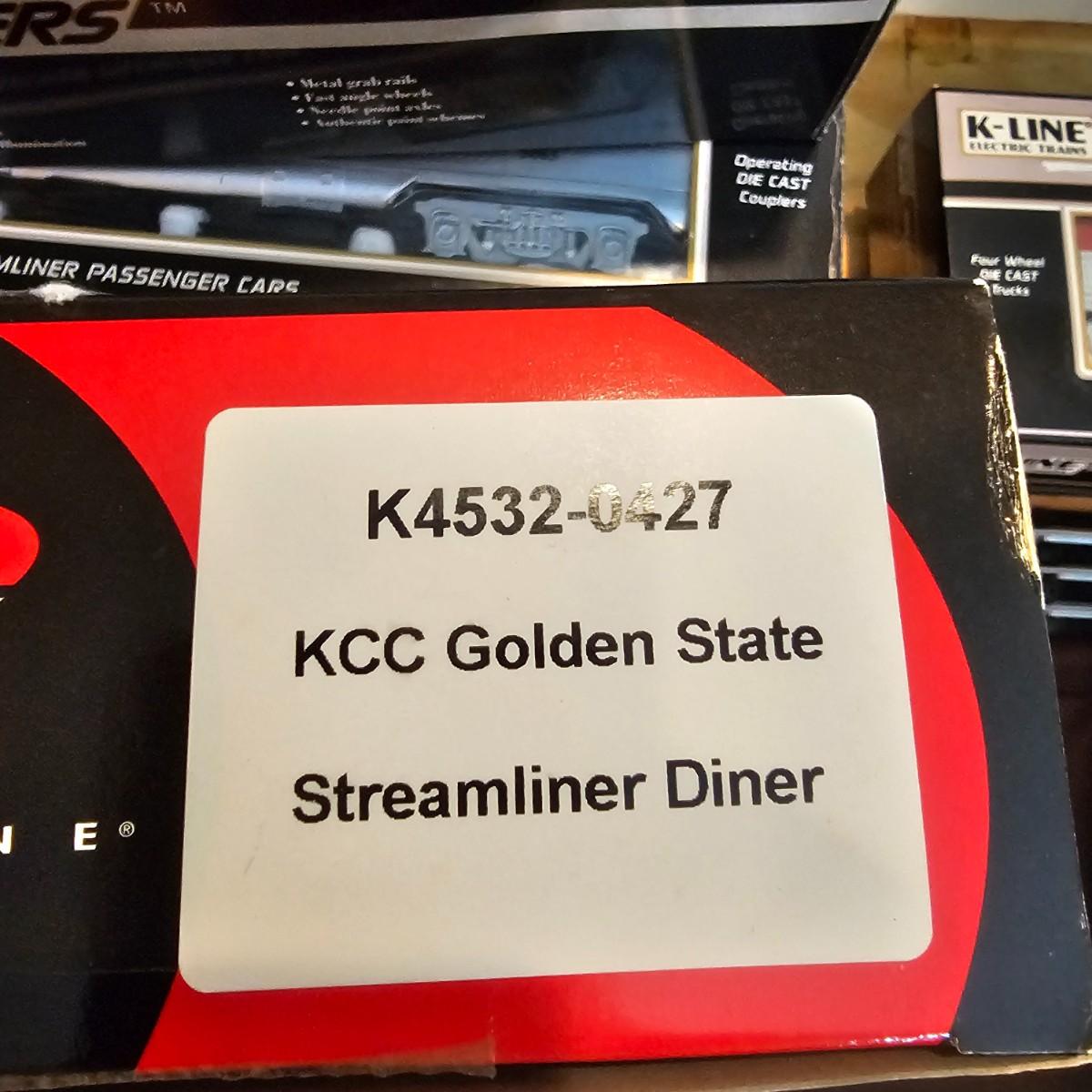 Eight Golden State passengers cars by K-Line. Cars all have red/silver color scheme, come with original boxes. Baggage car, observation car, vista dome and more. All cars have detailed interiors and lighting, all tested working. Standard die-cast couplers. Approximate full train length is 108". See photos for details. Shipping available. Please note that any price tag seen on an item was not put there by Sterling Transitions and does not reflect the current value of the item. Any train tracks shown in photos are not included but are available in another lot in this sale.
