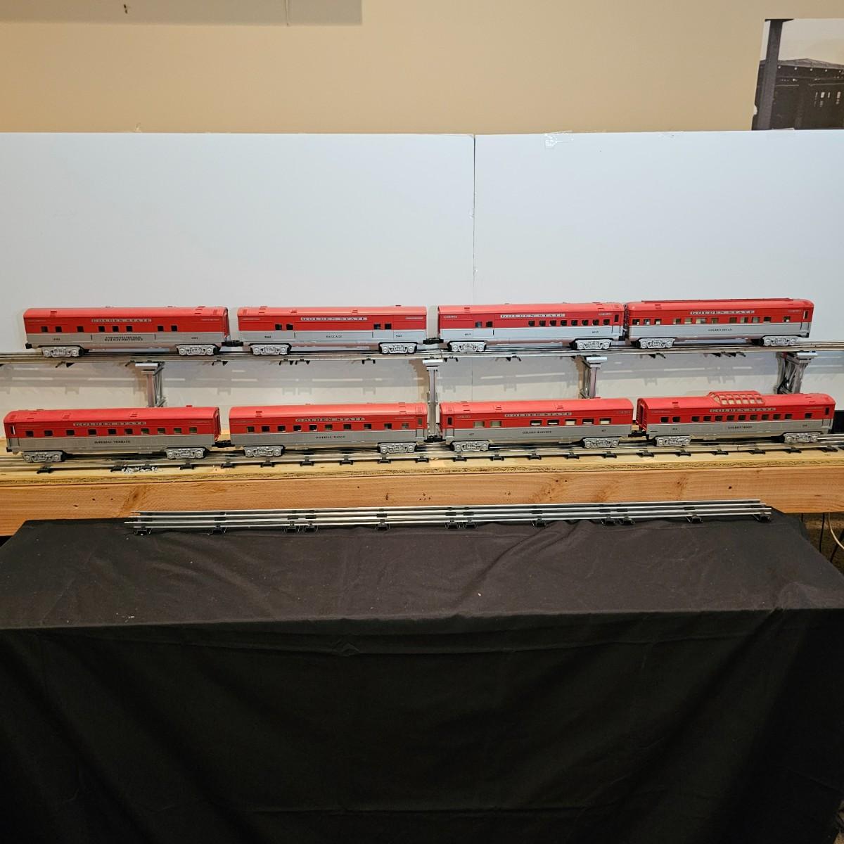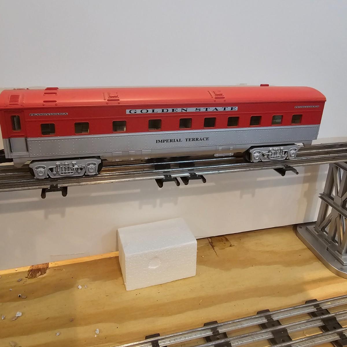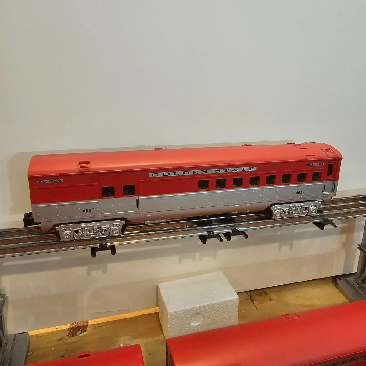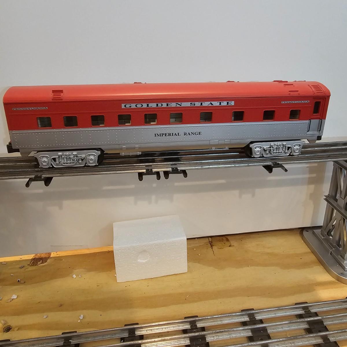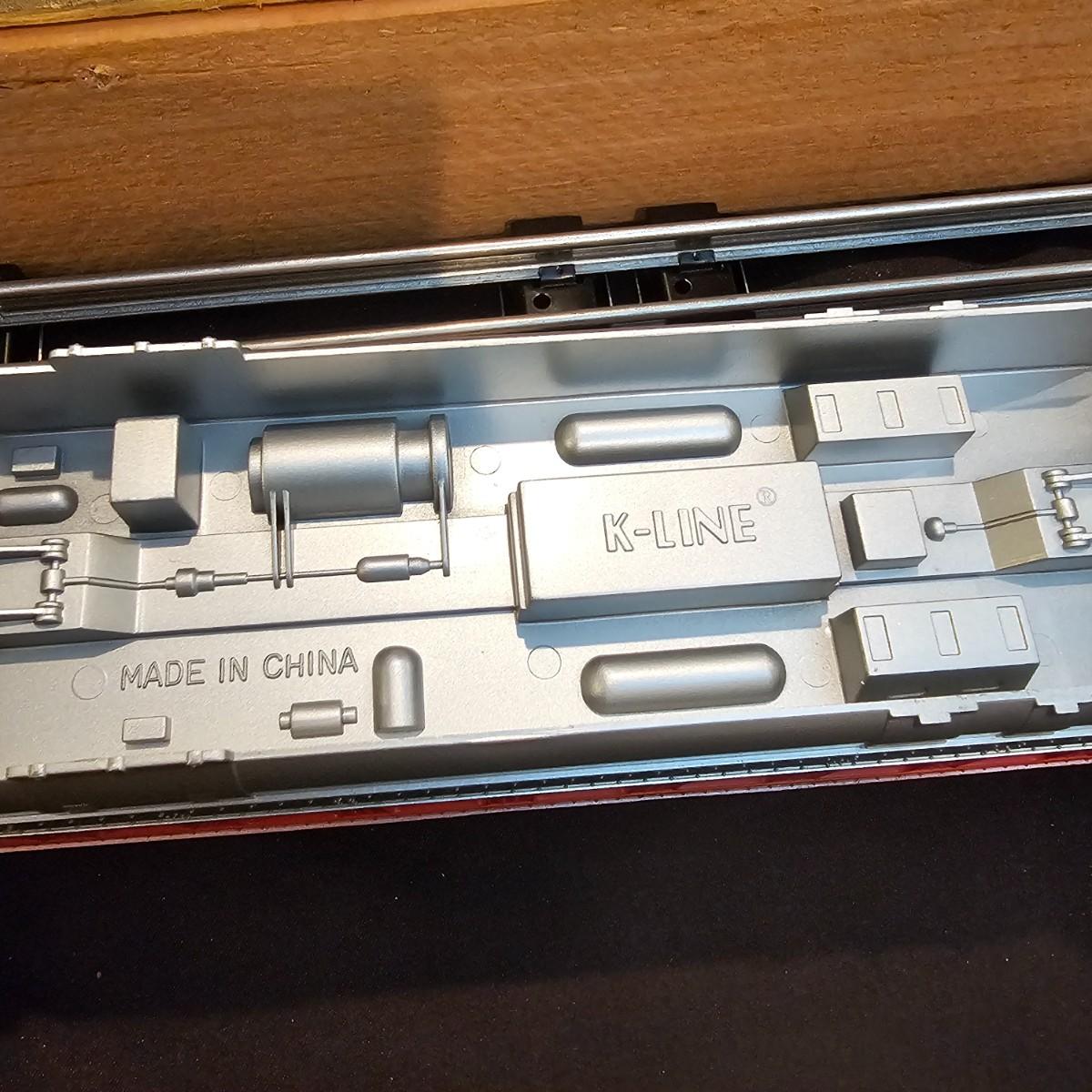 Eight Golden State passengers cars by K-Line. Cars all have red/silver color scheme, come with original boxes. Baggage car, observation car, vista dome and more. All cars have detailed interiors and lighting, all tested working. Standard die-cast couplers. Approximate full train length is 108". See photos for details. Shipping available. Please note that any price tag seen on an item was not put there by Sterling Transitions and does not reflect the current value of the item. Any train tracks shown in photos are not included but are available in another lot in this sale.