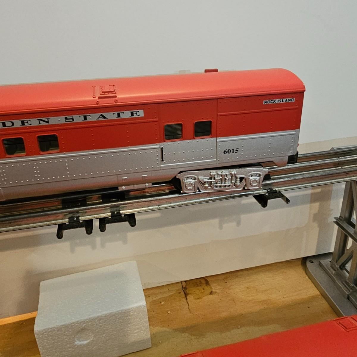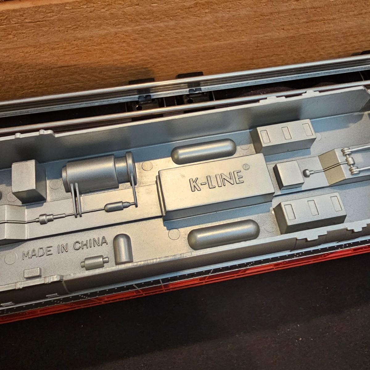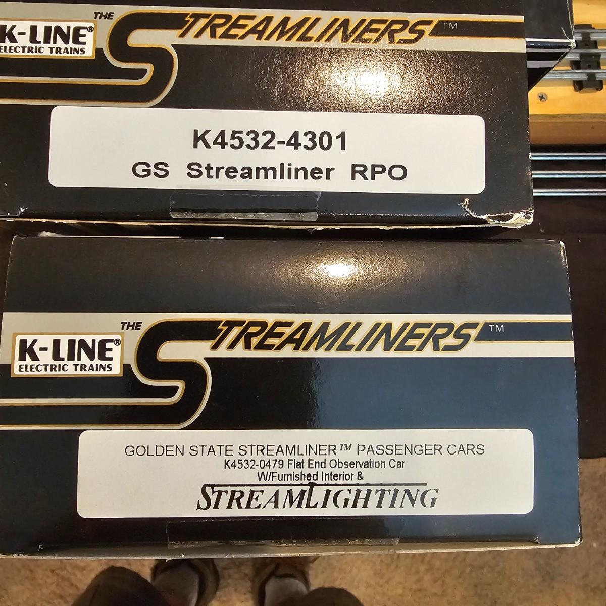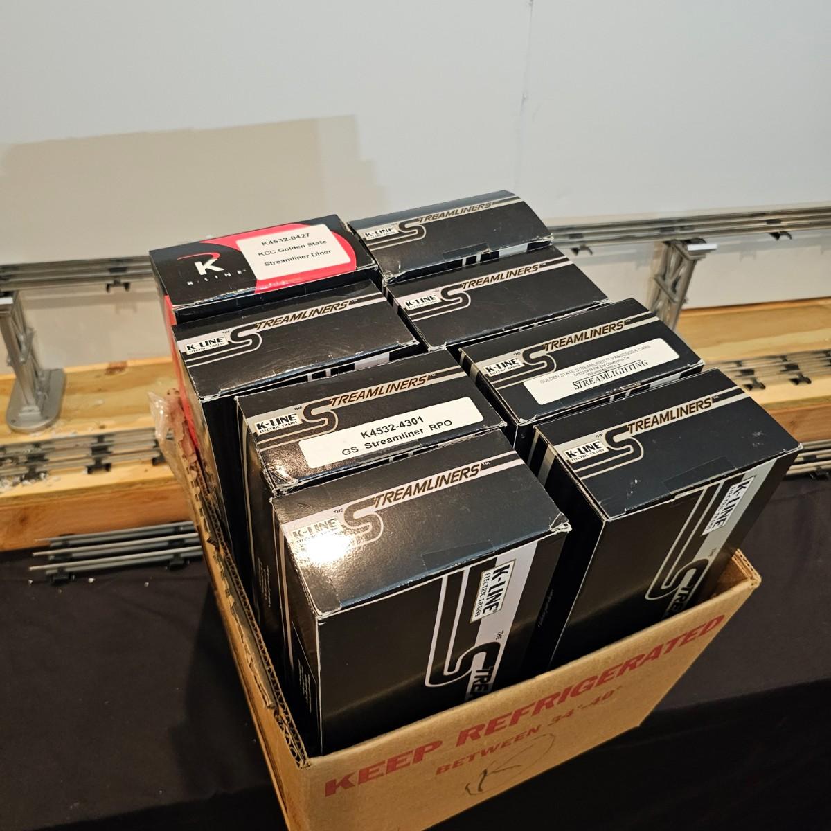 Eight Golden State passengers cars by K-Line. Cars all have red/silver color scheme, come with original boxes. Baggage car, observation car, vista dome and more. All cars have detailed interiors and lighting, all tested working. Standard die-cast couplers. Approximate full train length is 108". See photos for details. Shipping available. Please note that any price tag seen on an item was not put there by Sterling Transitions and does not reflect the current value of the item. Any train tracks shown in photos are not included but are available in another lot in this sale.