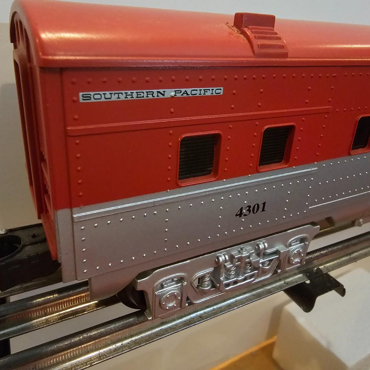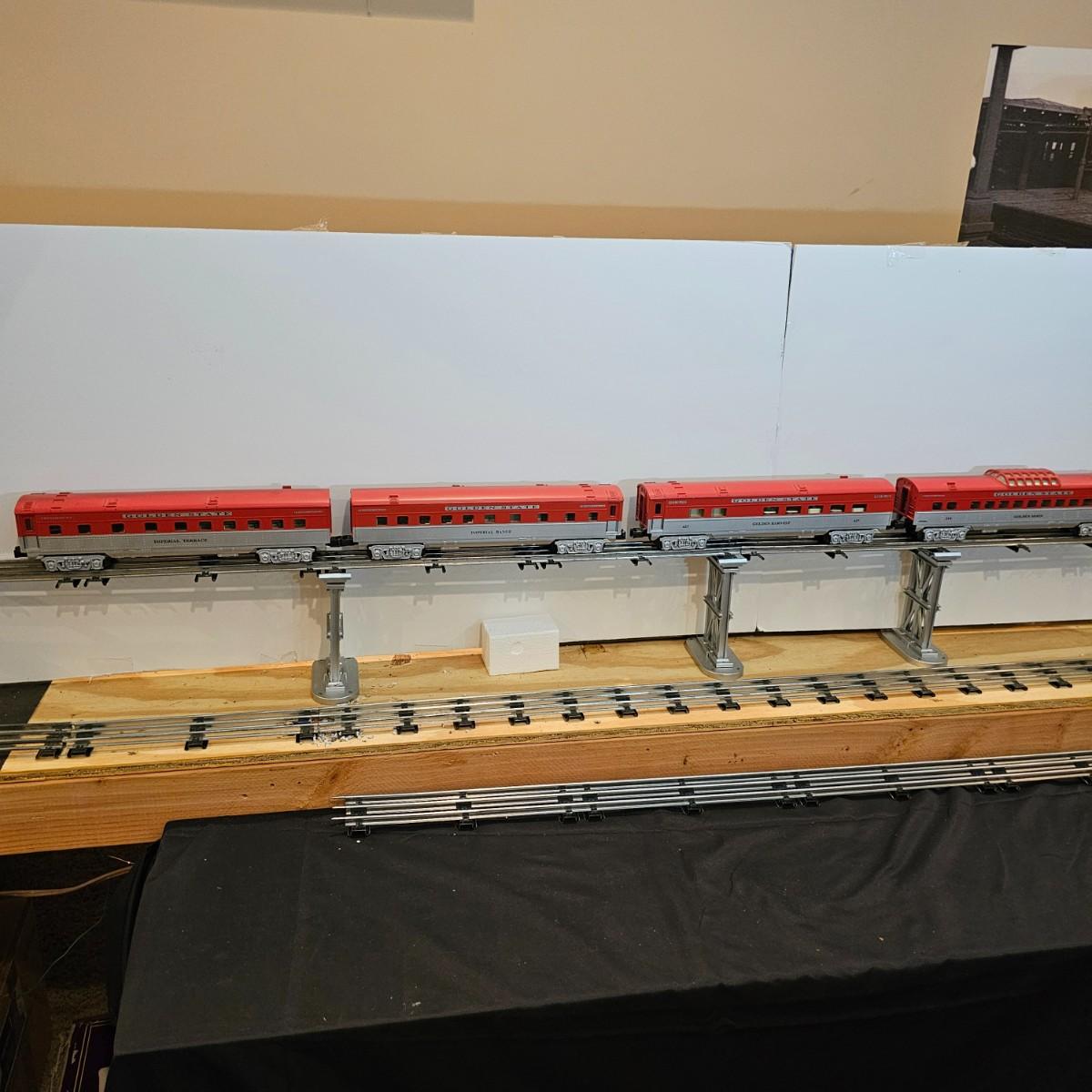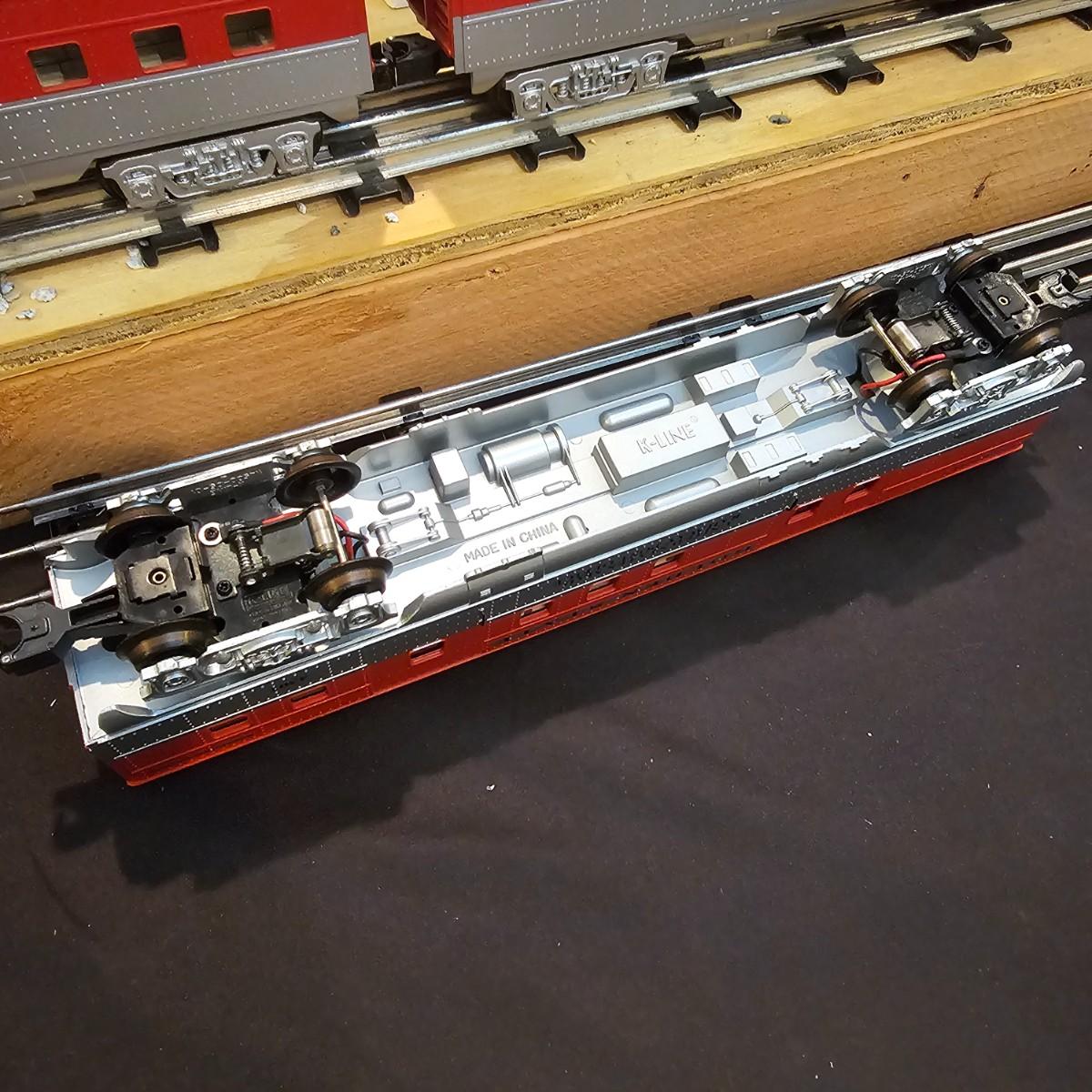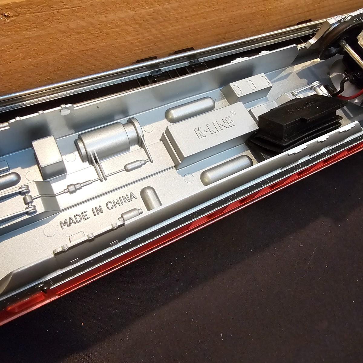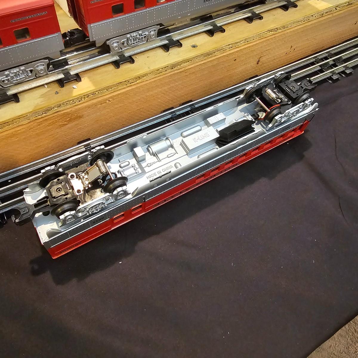 Eight Golden State passengers cars by K-Line. Cars all have red/silver color scheme, come with original boxes. Baggage car, observation car, vista dome and more. All cars have detailed interiors and lighting, all tested working. Standard die-cast couplers. Approximate full train length is 108". See photos for details. Shipping available. Please note that any price tag seen on an item was not put there by Sterling Transitions and does not reflect the current value of the item. Any train tracks shown in photos are not included but are available in another lot in this sale.