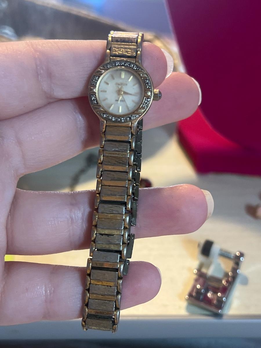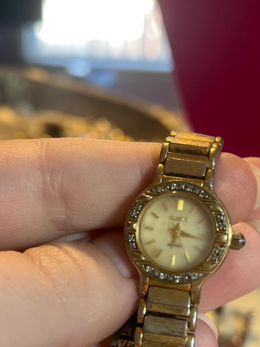 Golden toned band is 7in long. No stretch. Band is broken. Watch face is very fuzzy/not clear. Circle shaped watch face with tiny jewels