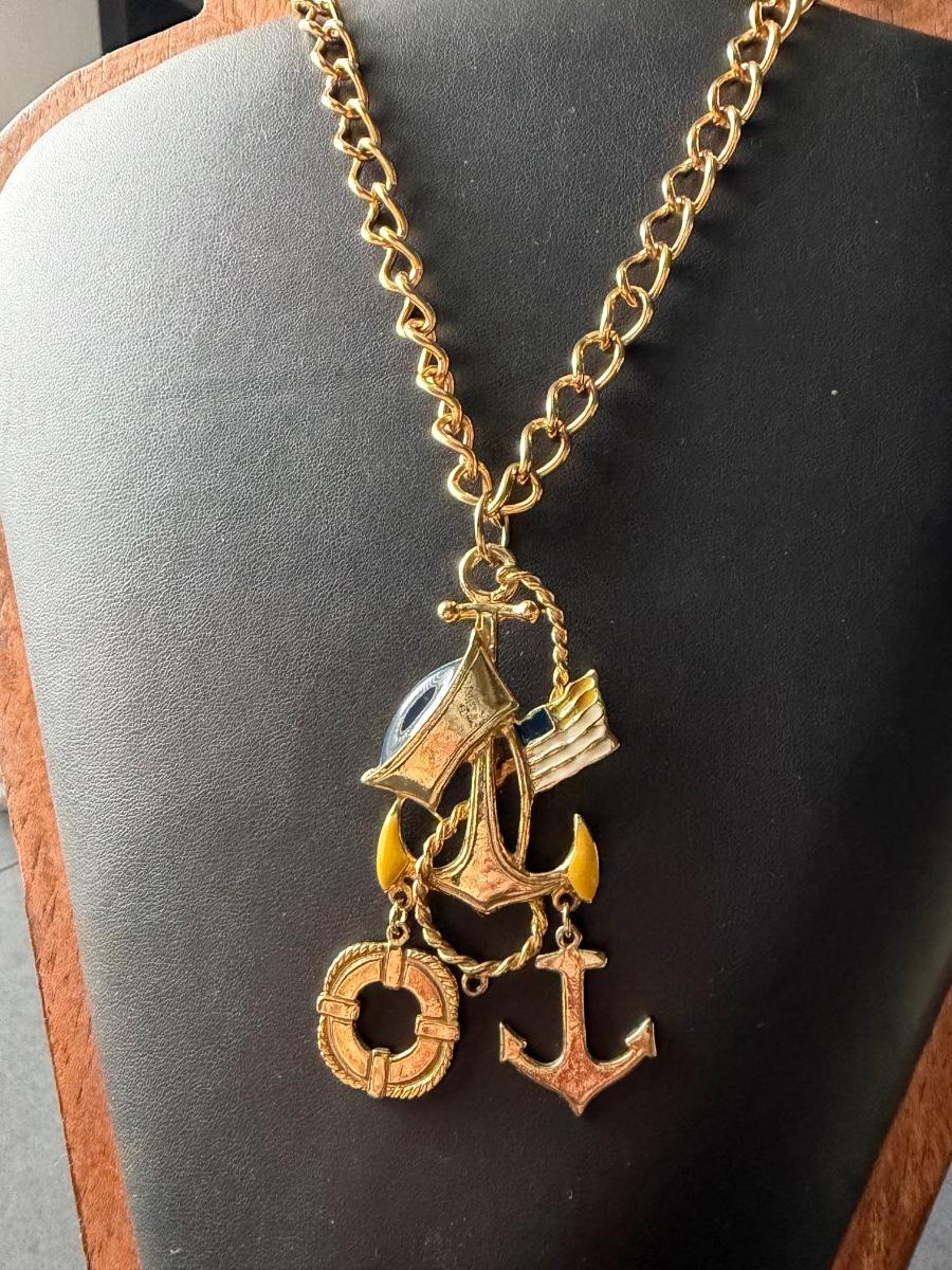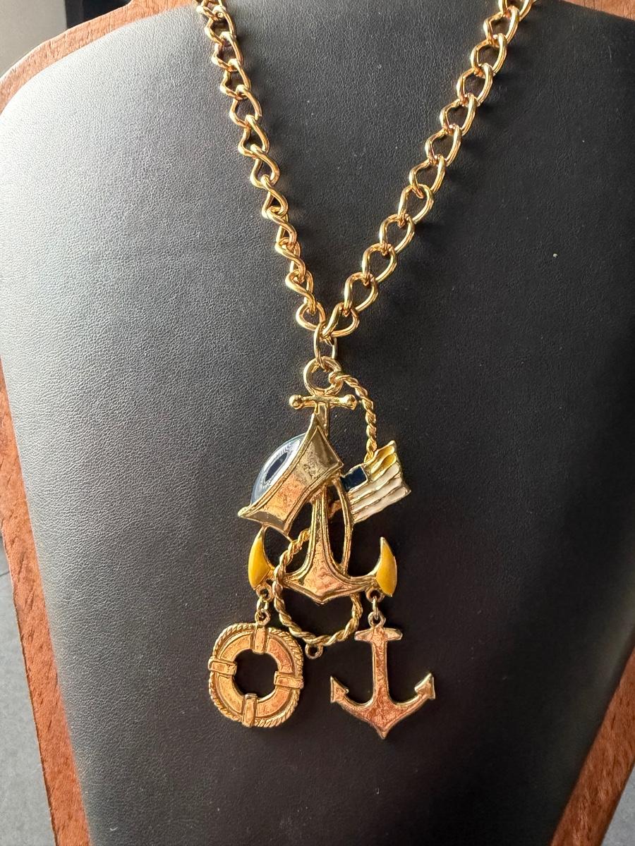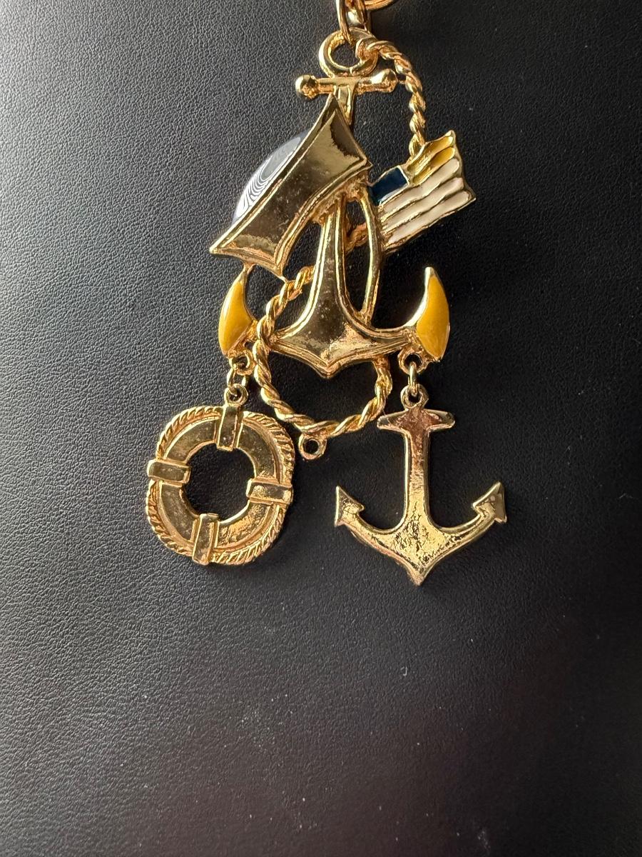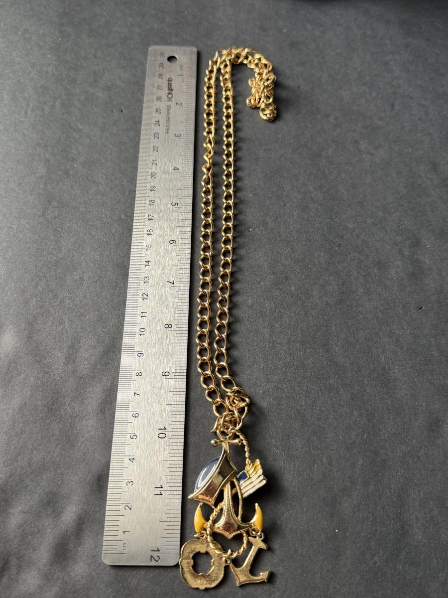 gold-plated charm necklace featuring anchor and lifebuoy pendants.