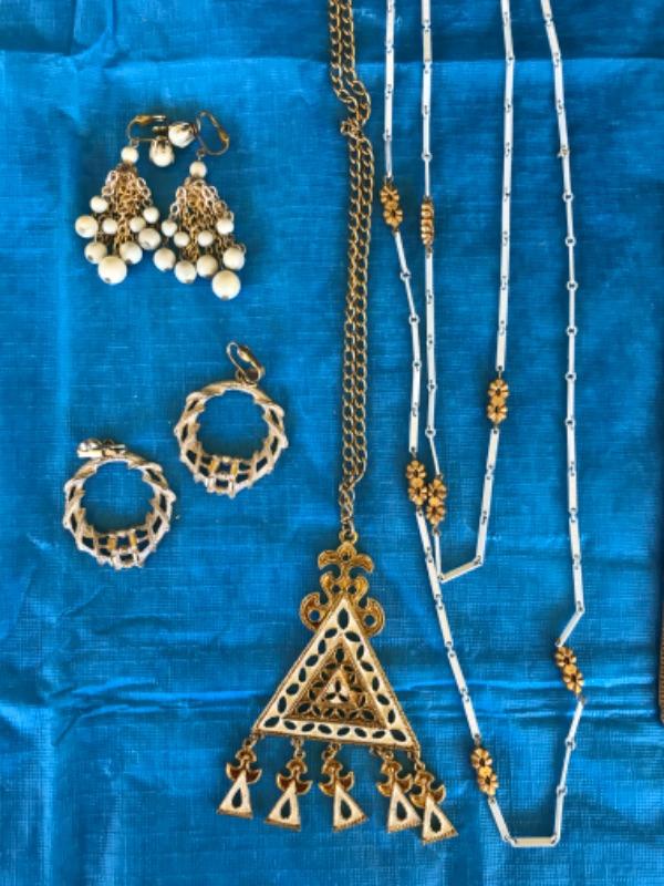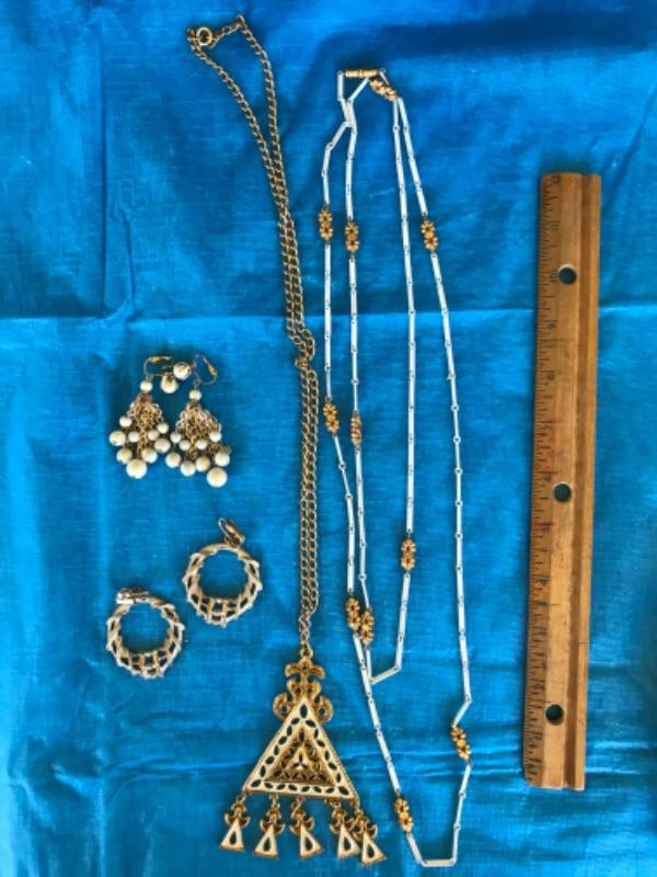 Goldtone and white vintage jewelry. 2 necklaces and 2 clip style earrings.