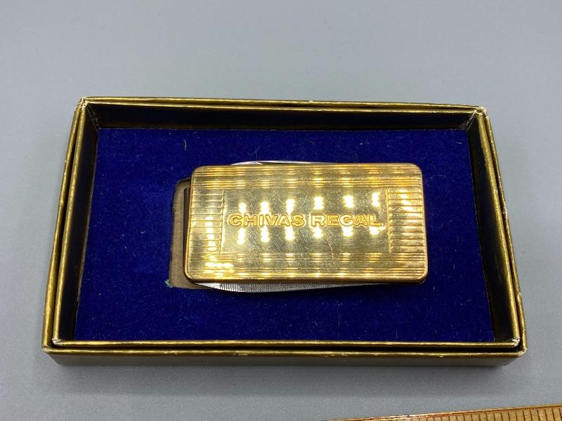 Chivas Regal money clip pocket knife. Has a small blade and a nail file. Gold tone metal. Comes in original box. About 2" size.