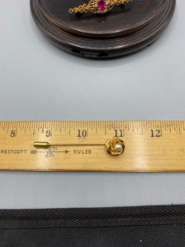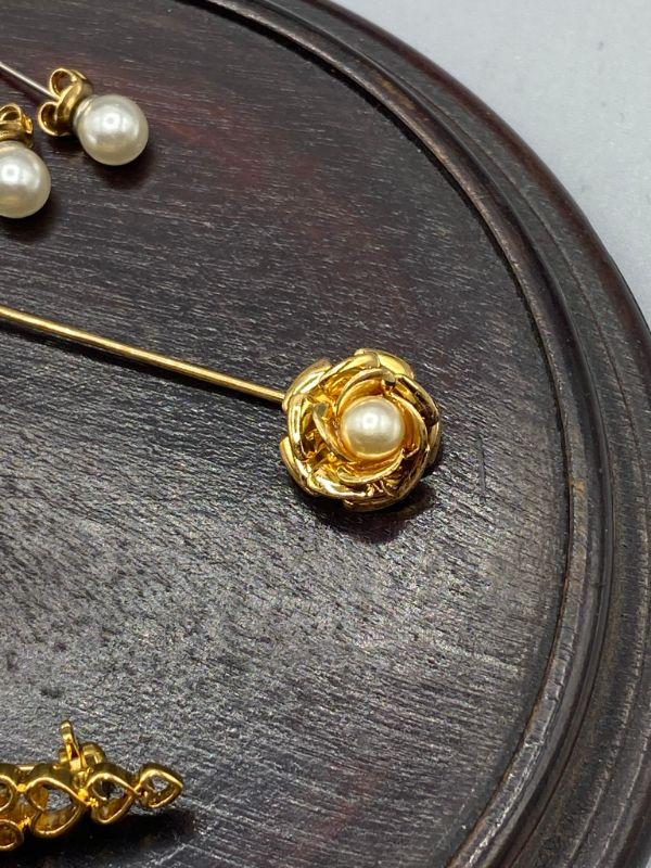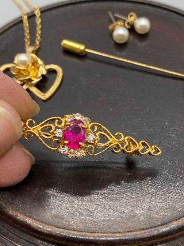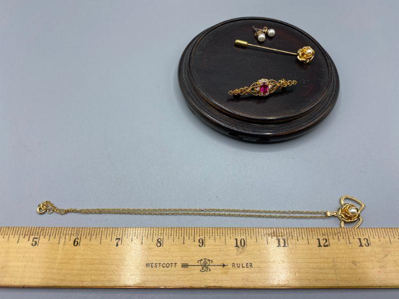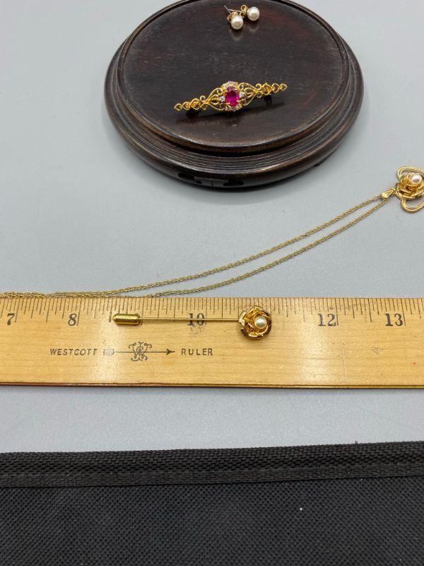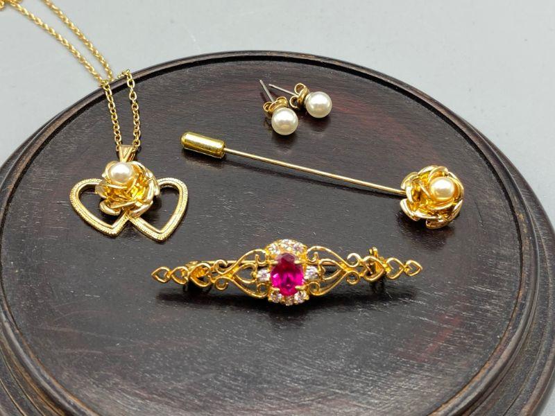 4 piece goldtone jewelry lot. Pendant necklace, stick pin, earrings and a jeweled brooch. Unbranded. Wear together or add to jewelry collection.