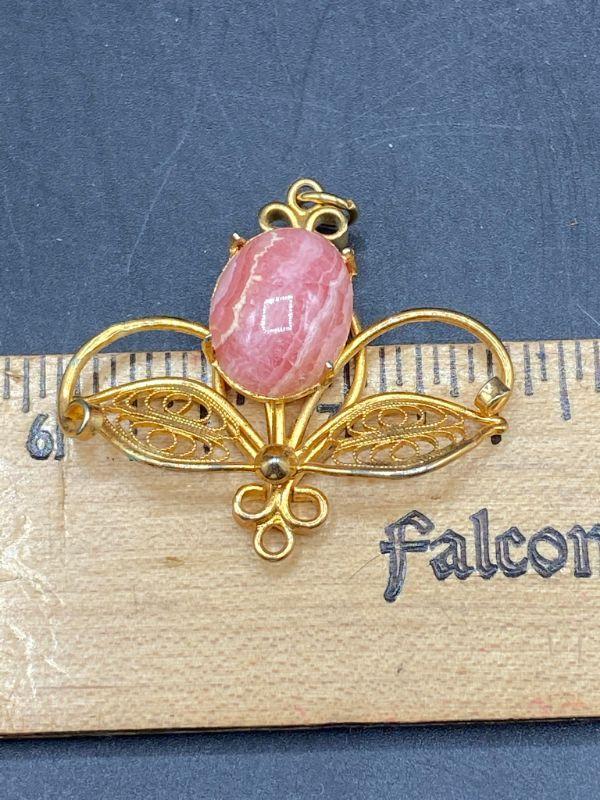Pink quartz cabochon pendant. Goldtone setting. Great detail gives it a floral appearance. About 1.5" size