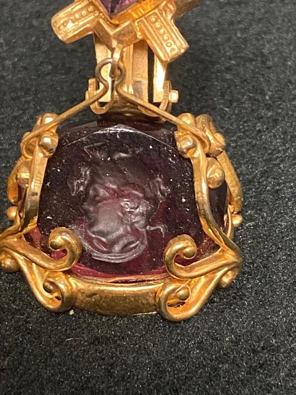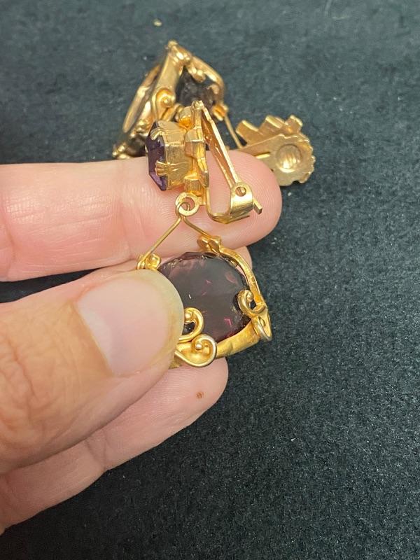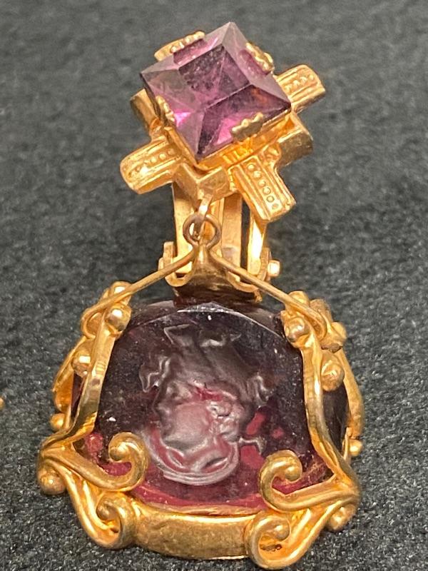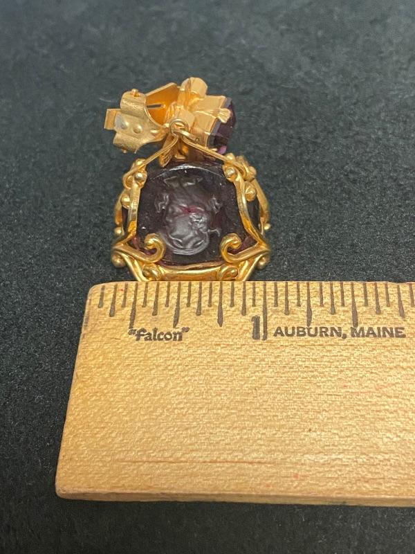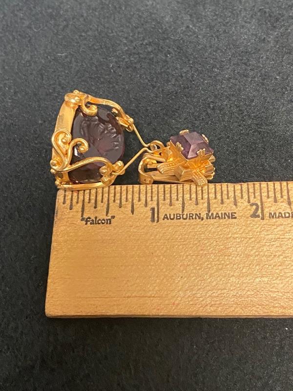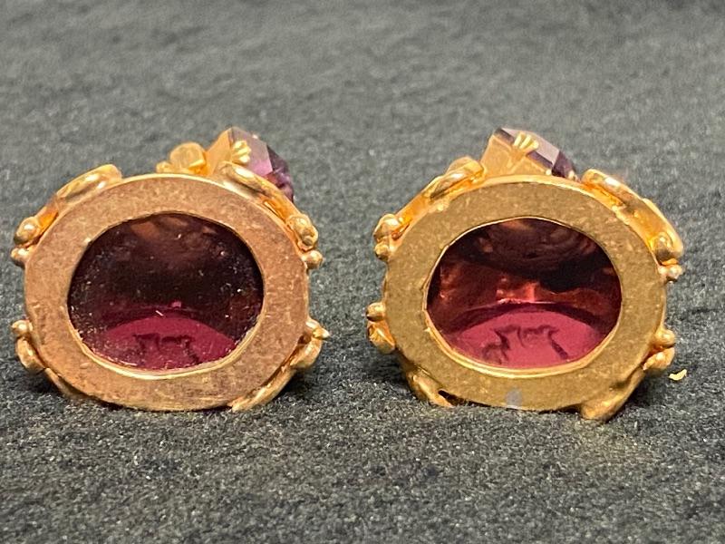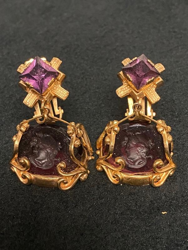 Vintage Intaglio Cameo Earrings. Goldtone setting . Deep purple stones. Reverse cameo in the bottom stone. Large. Clip Style.