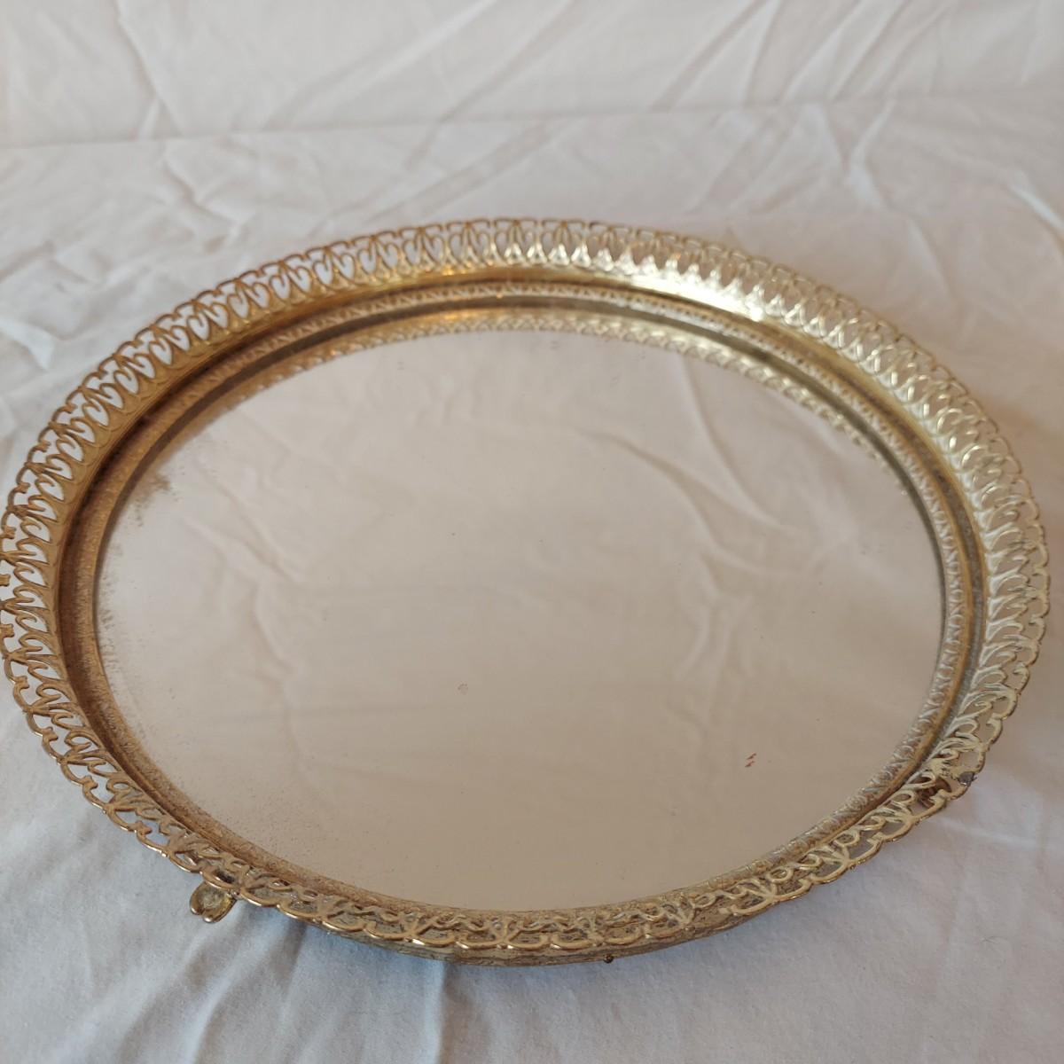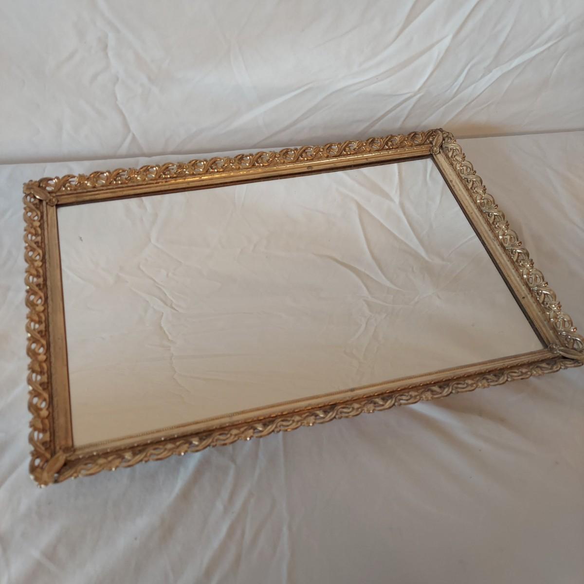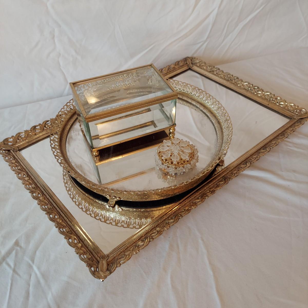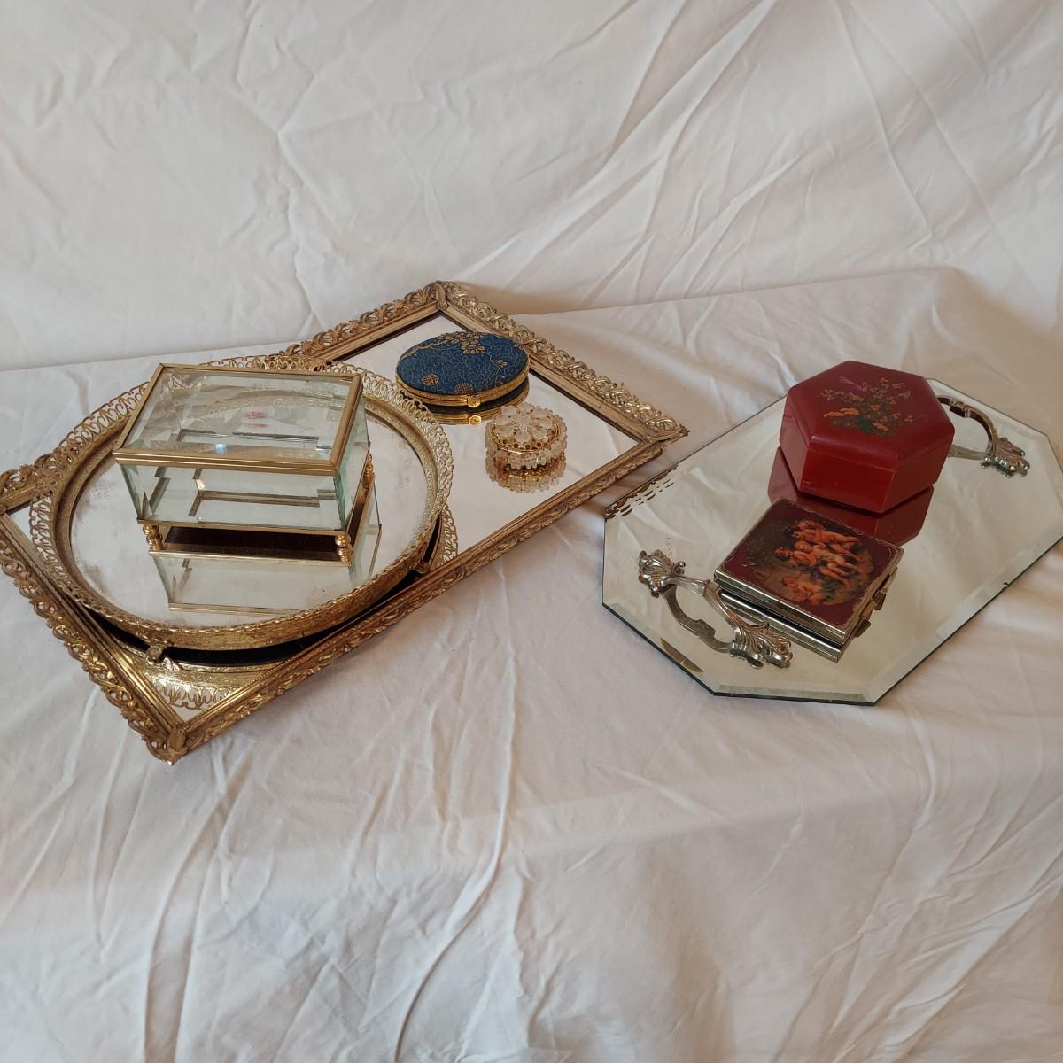 Three mirrror trays. The large rectangular gold frame mirror is 10.5” x 15.5”. Also includes three small trinkets boxes and a set of plastic nesting boxes. Plus a vintage brass tone metal valet stand. The small, blue piece shown in the group photo is nonlonger available. Please see photos for details. Shipping available