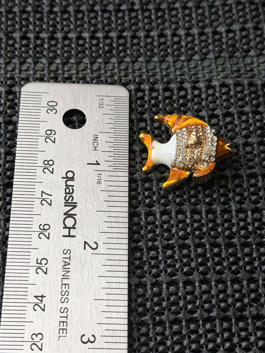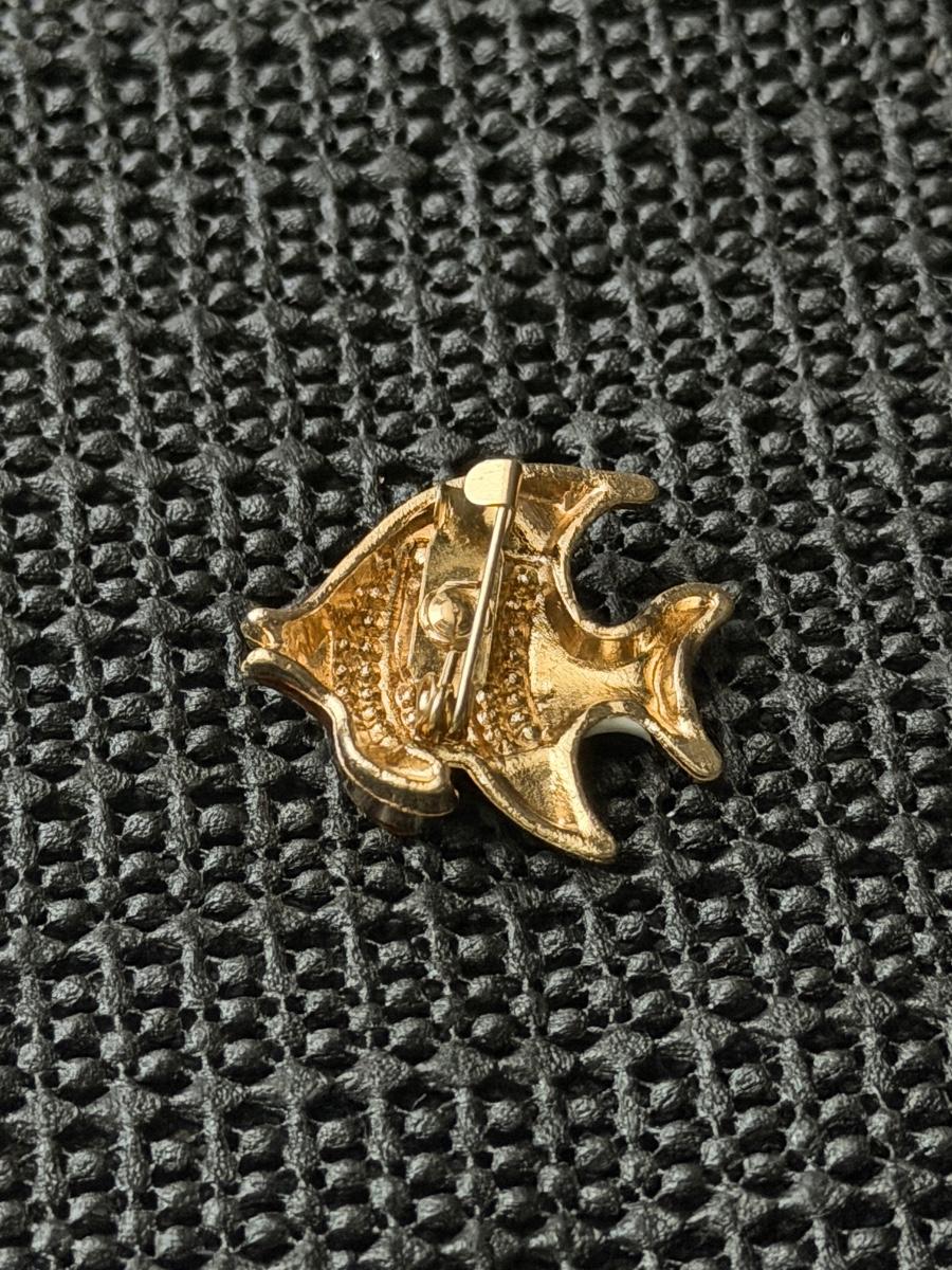 gold-toned and enamel fish brooch pin with rhinestone accents.