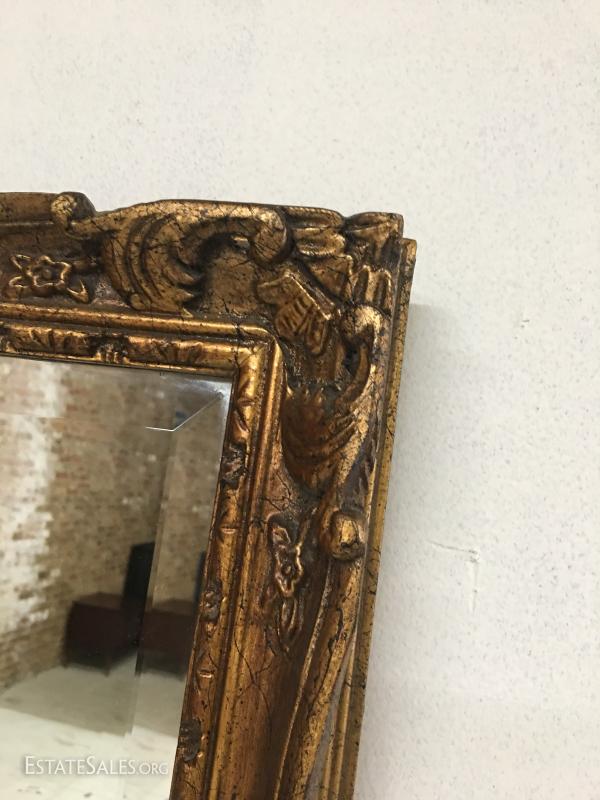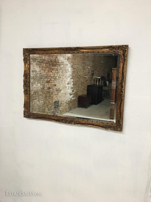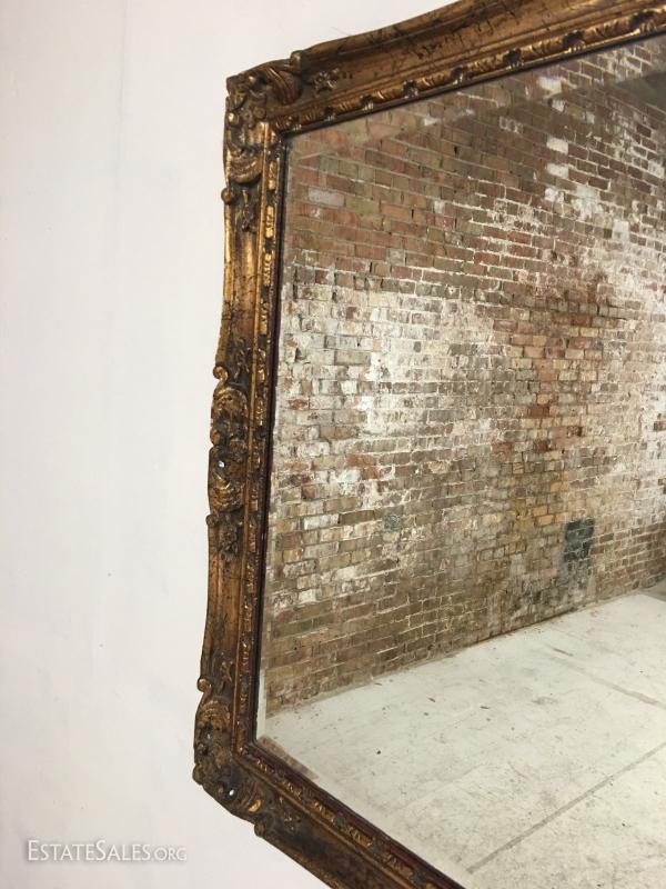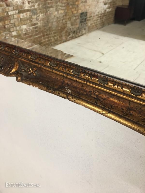 Mirror is beveled and in excellent condition, some wear and flaking to the gilded finished. measures 40" by 28" very heavy thick glass.