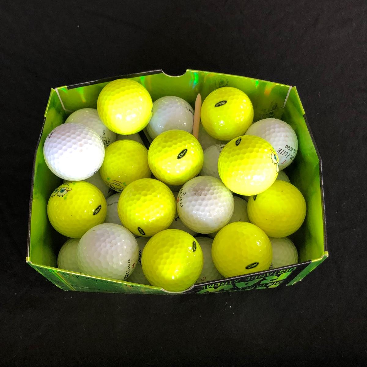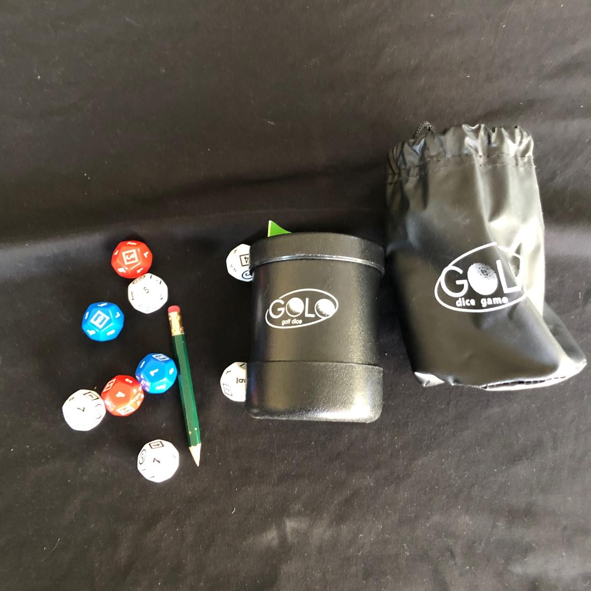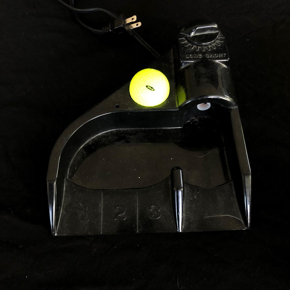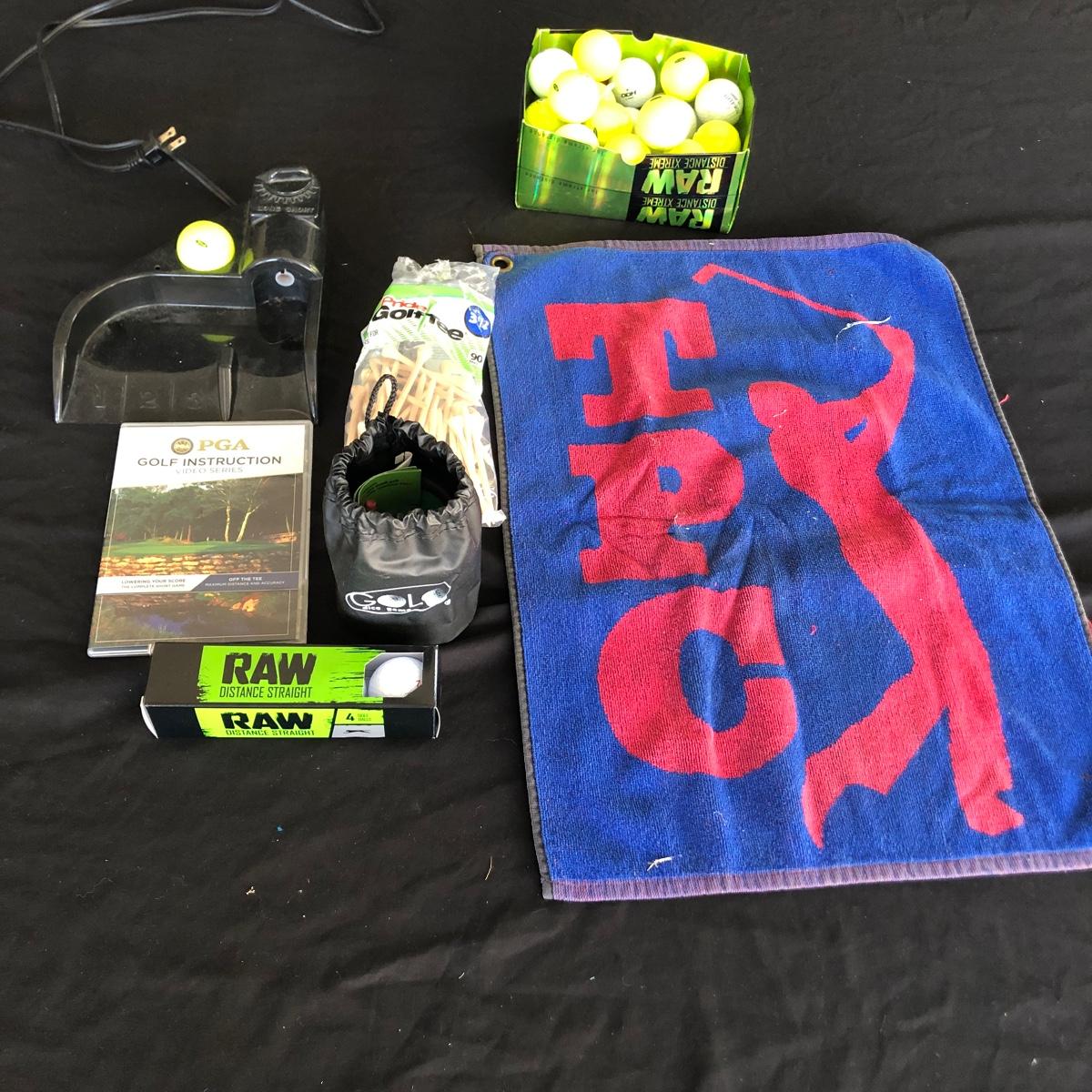 Lot includes golf dice game, wooden golf tees, assortment of golf balls, golf towel, instructional DVD and putt practice ball return machine that worked when tested.