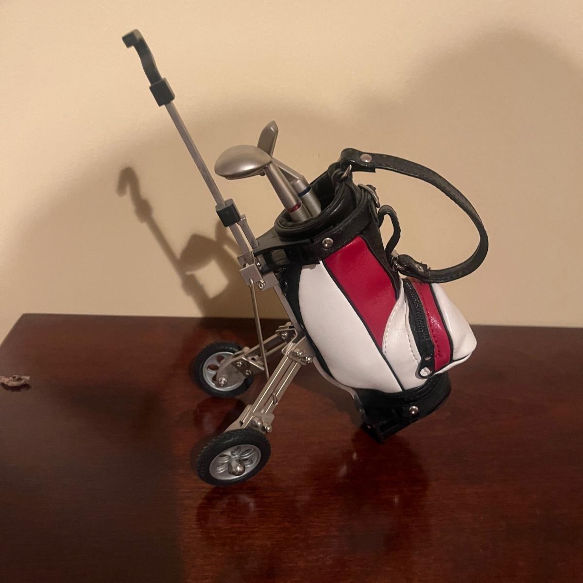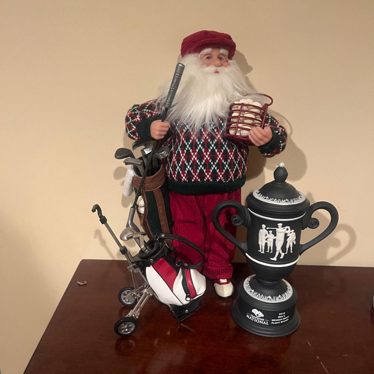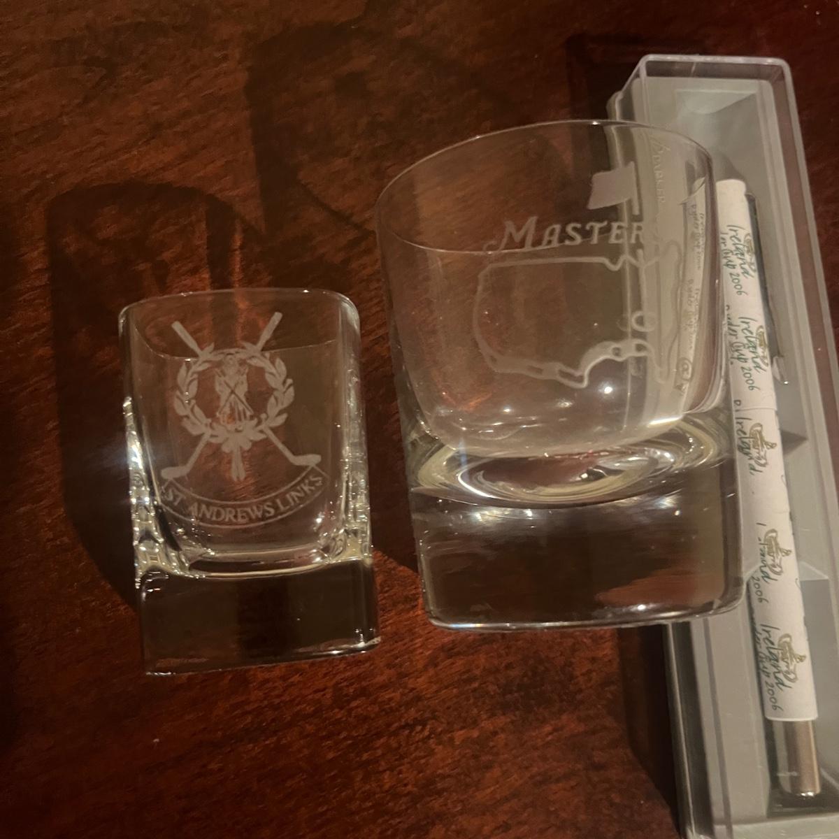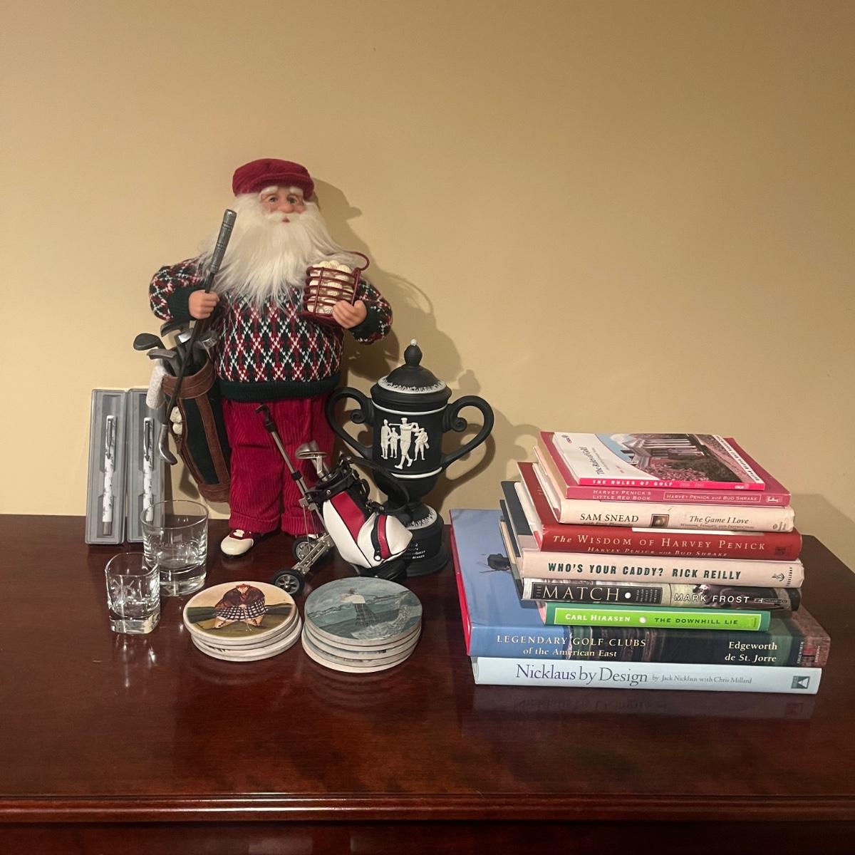 Lot contains a selection of items for the golf aficionado including eight coasters, golf club pins in golf bag, Masters and St Andrew’s glasses, golf books, ceramic Tennessee National golf trophy, two untested pens from 2006 Ryder cup and a golfer doll. Doll measures 10” x 5” x 17”H.
