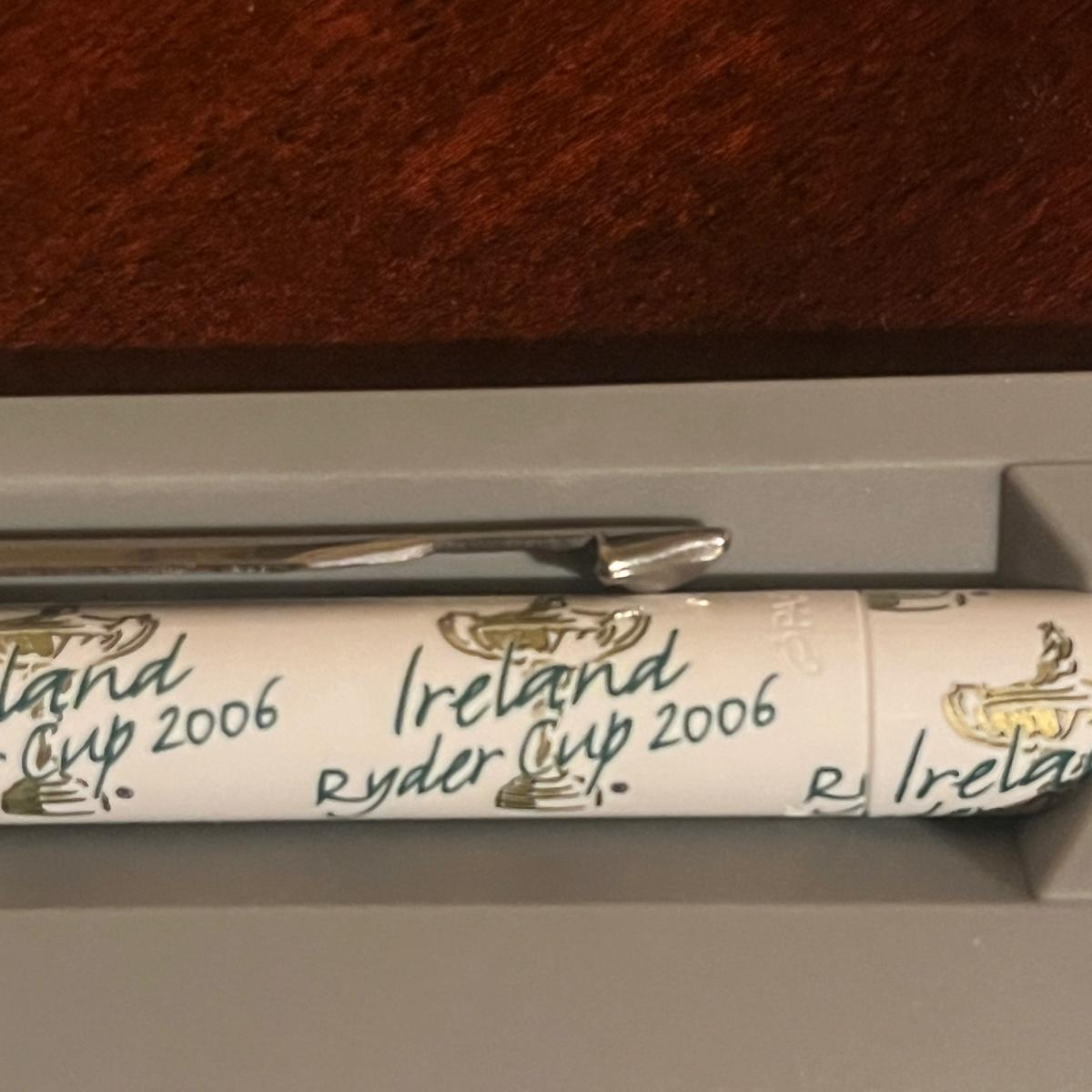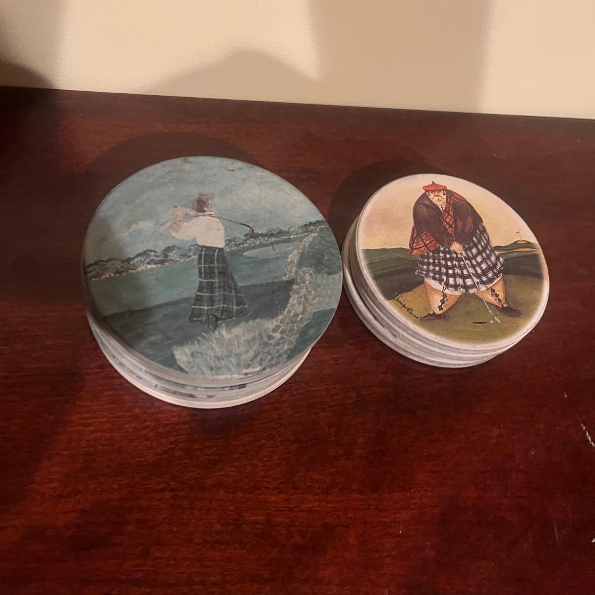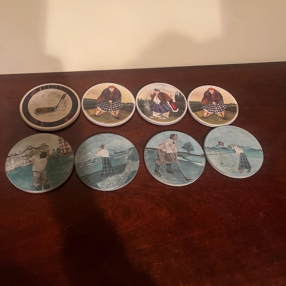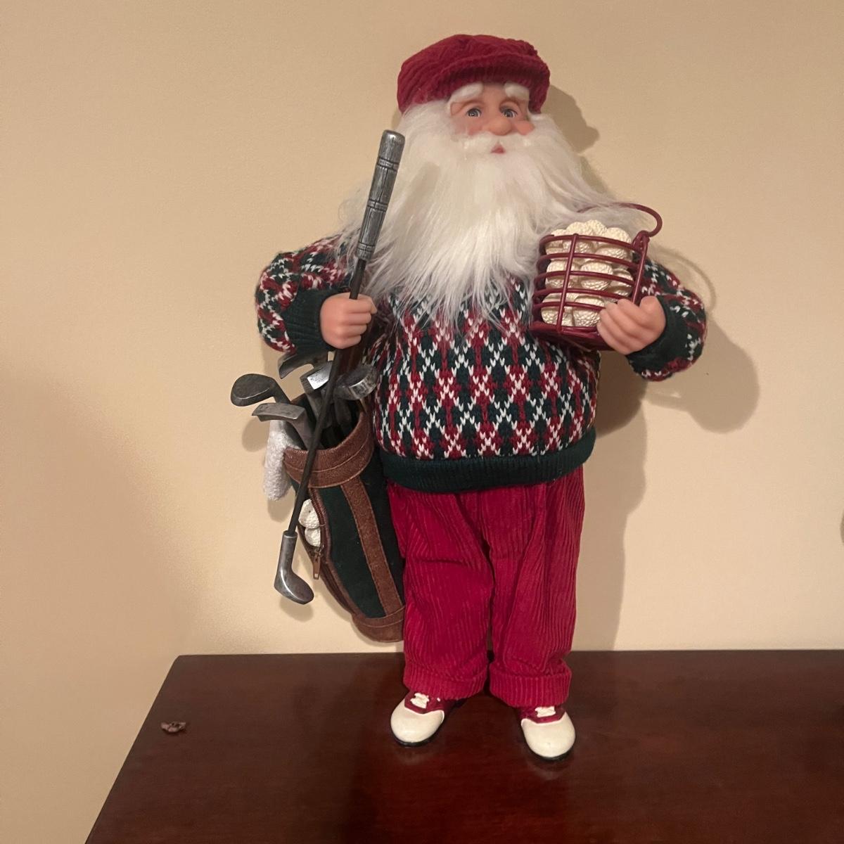 Lot contains a selection of items for the golf aficionado including eight coasters, golf club pins in golf bag, Masters and St Andrew’s glasses, golf books, ceramic Tennessee National golf trophy, two untested pens from 2006 Ryder cup and a golfer doll. Doll measures 10” x 5” x 17”H.